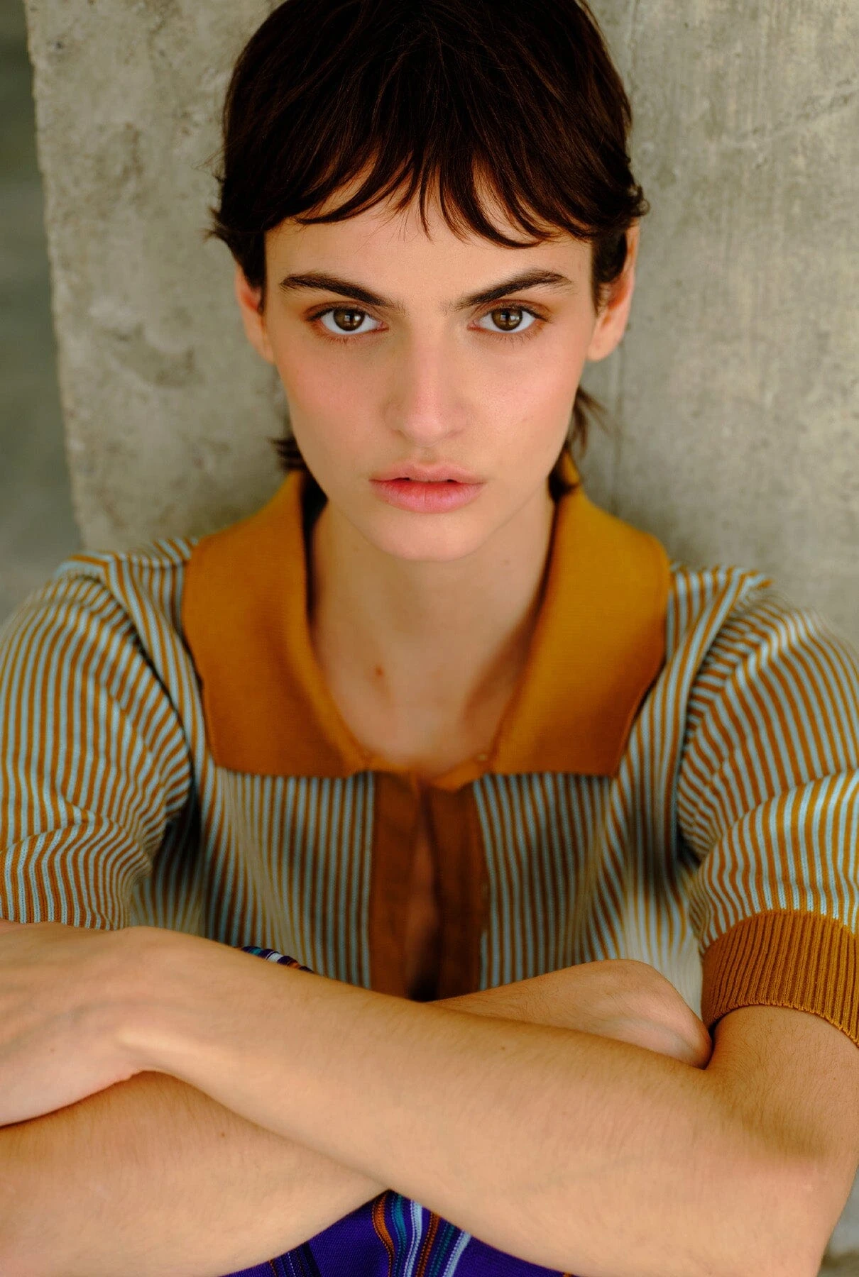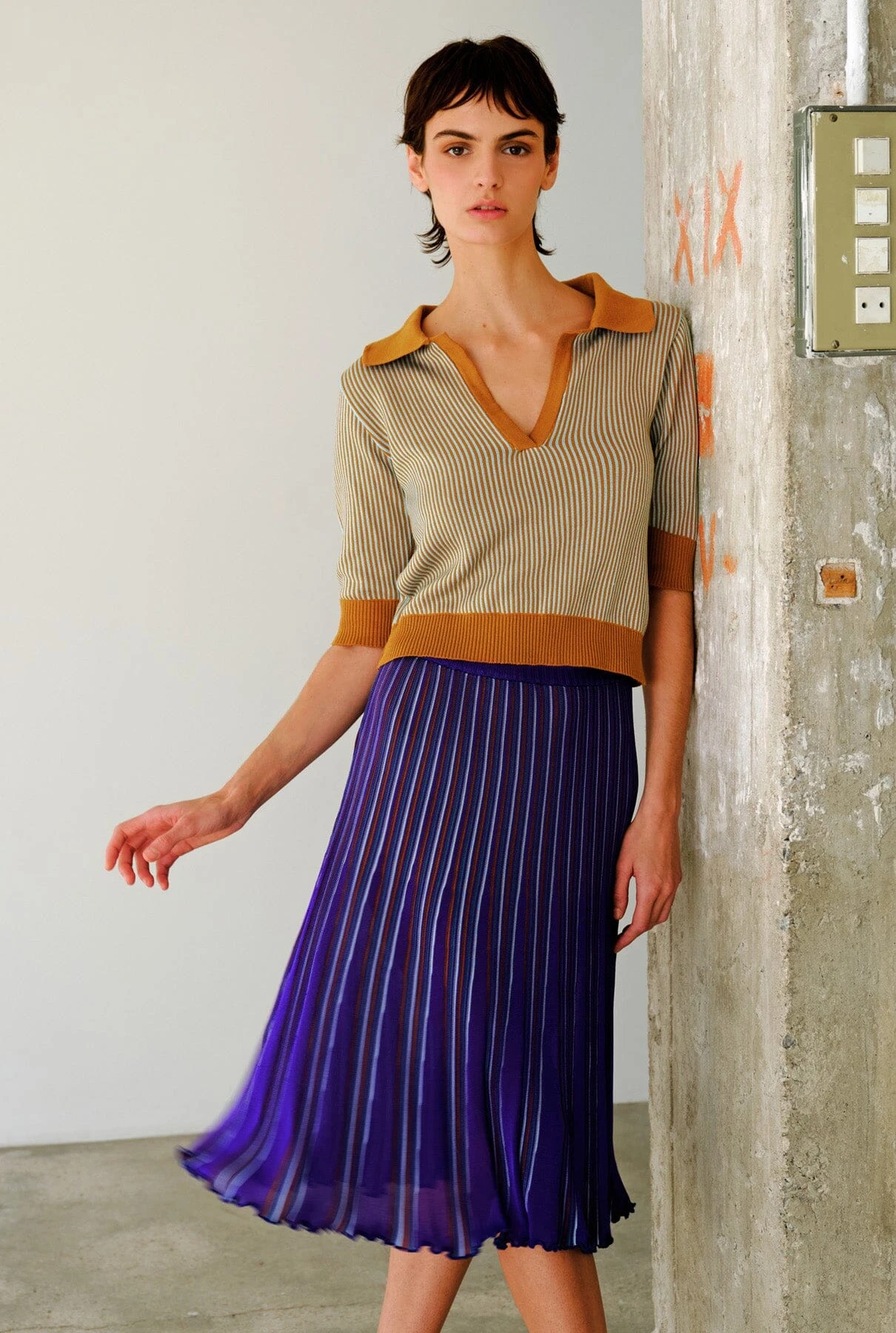 Polo with a V neckline and big collar. Knitted with yarns of two contrasting colors. Shor sleeves with large cuffs and ribbed hem.
