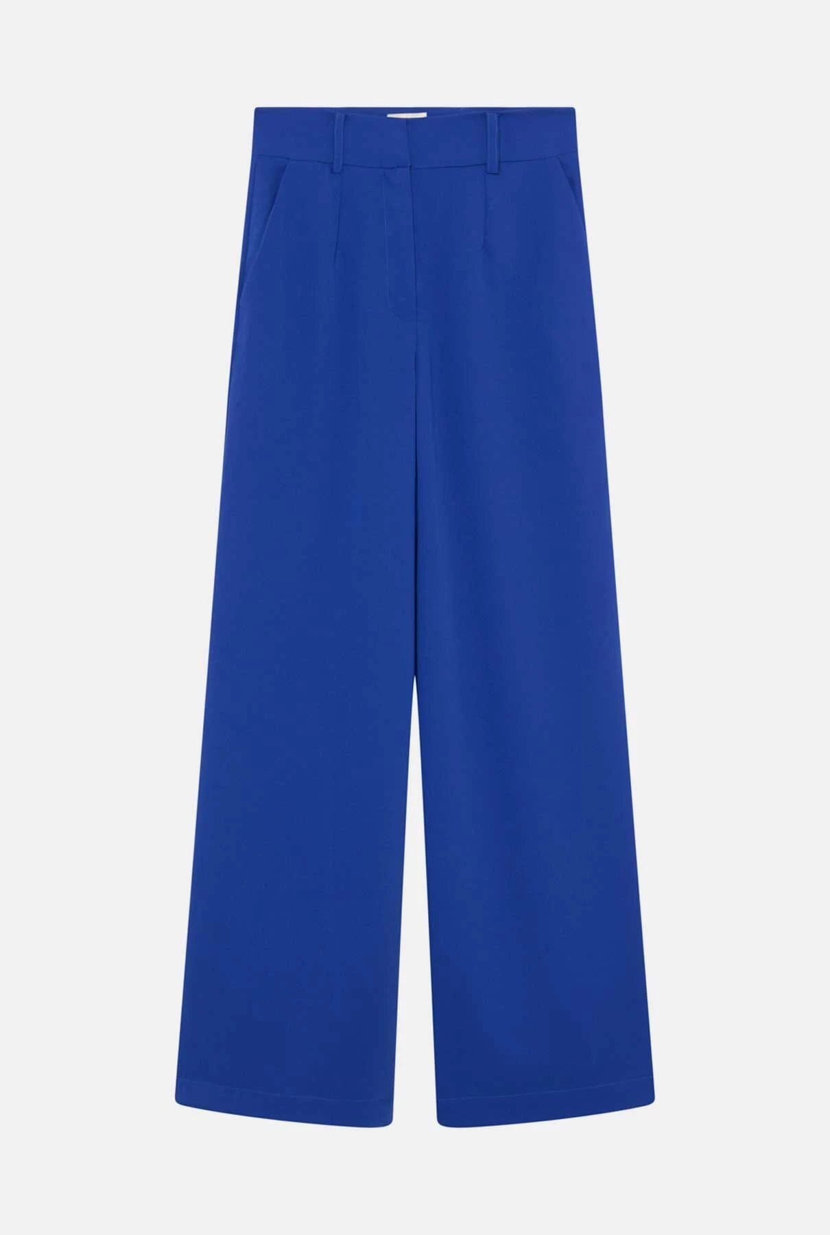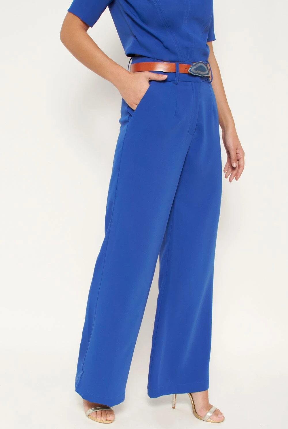 High-waisted, wide-leg trousers in blue. With pockets and belt loops. Front zip fastening with metal hook.