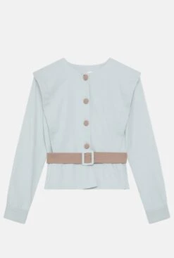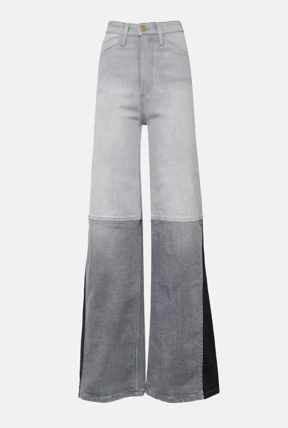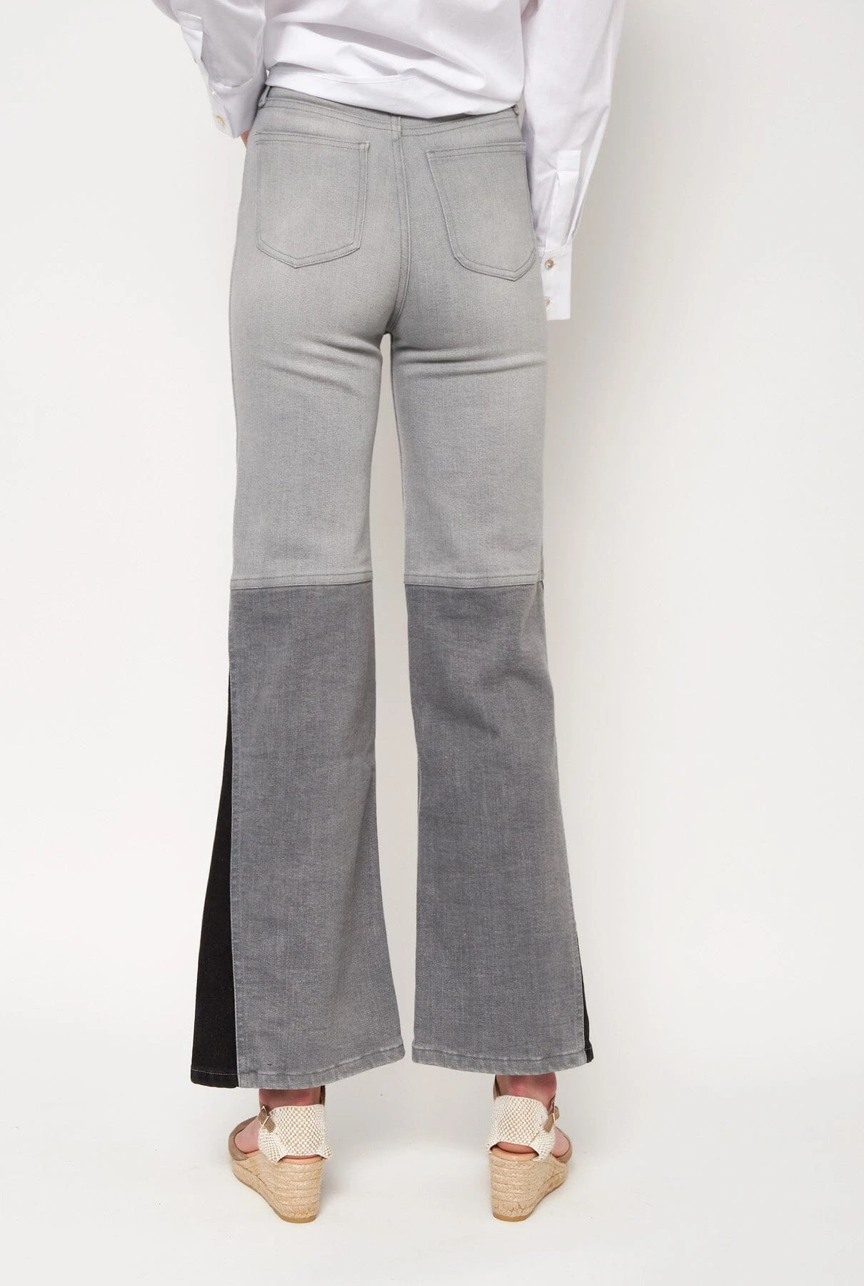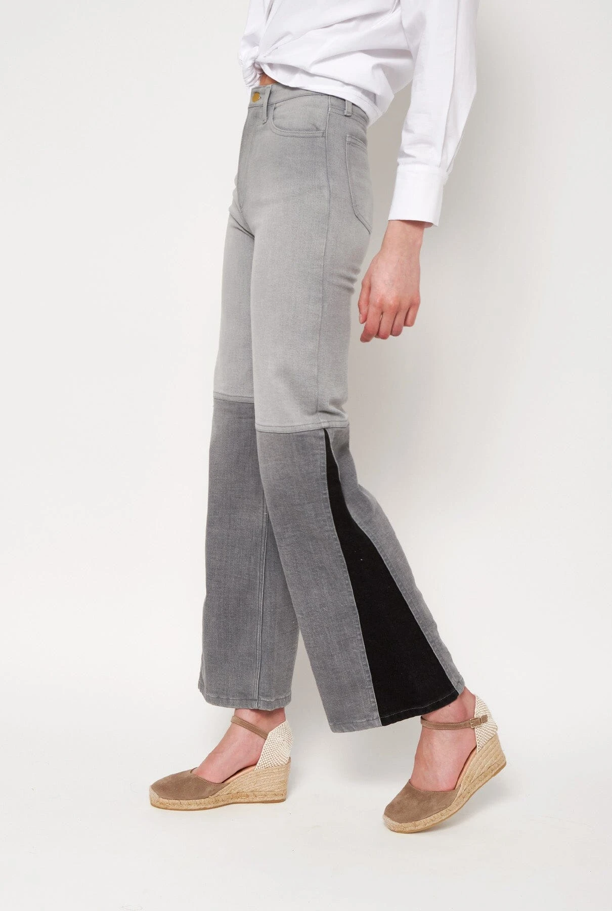 High-waisted stretch denim jeans in denim in three tones, medium grey on the top, dark grey on the bottom and side wedge in darker grey.
