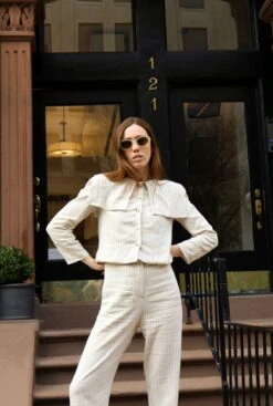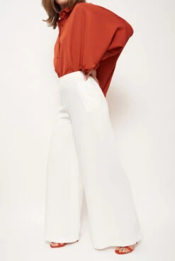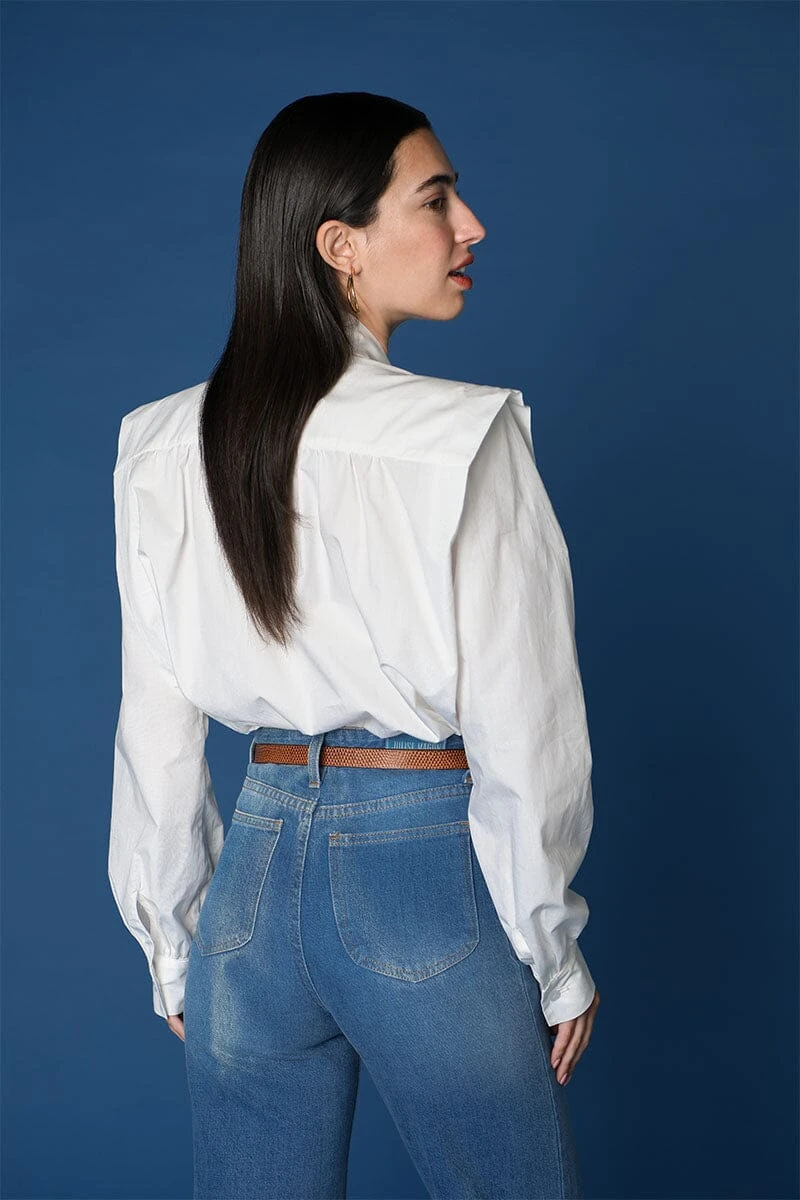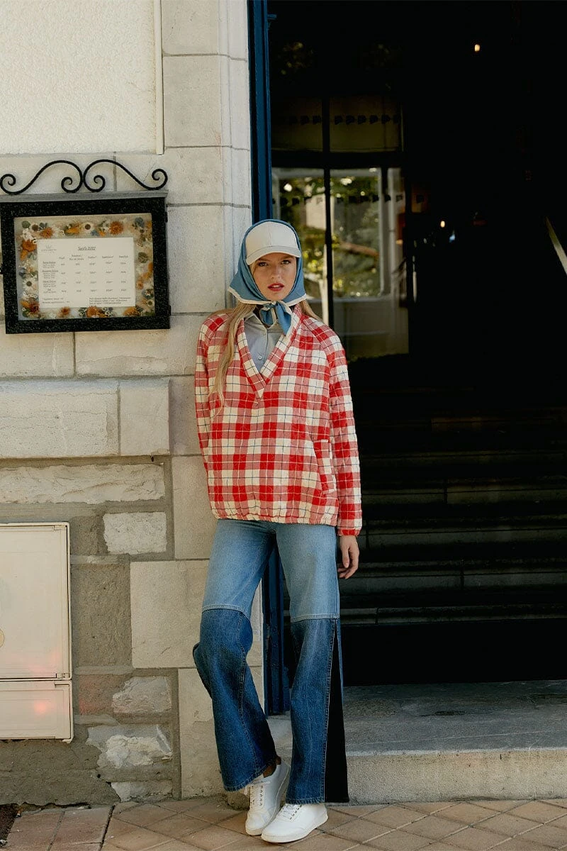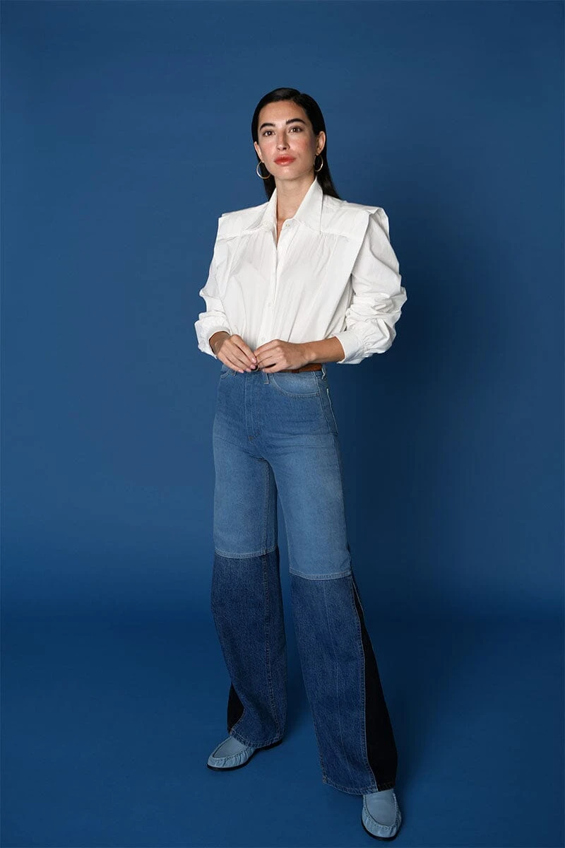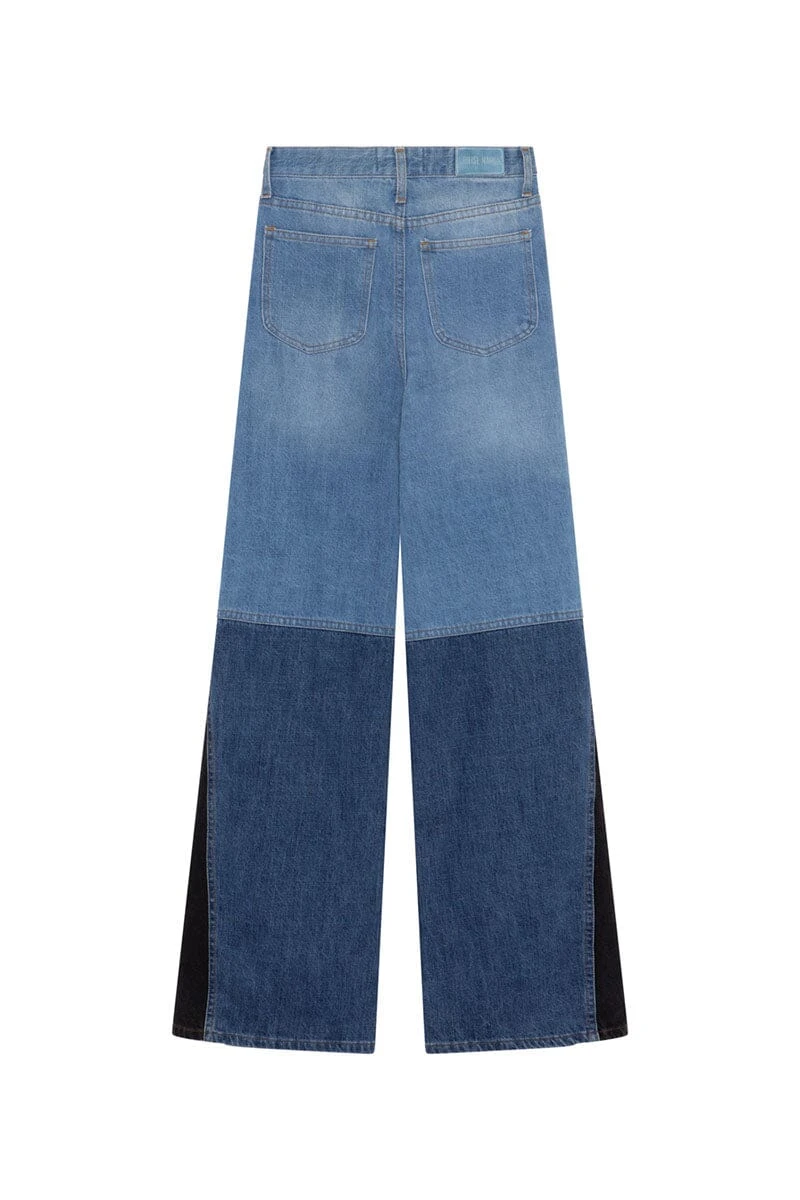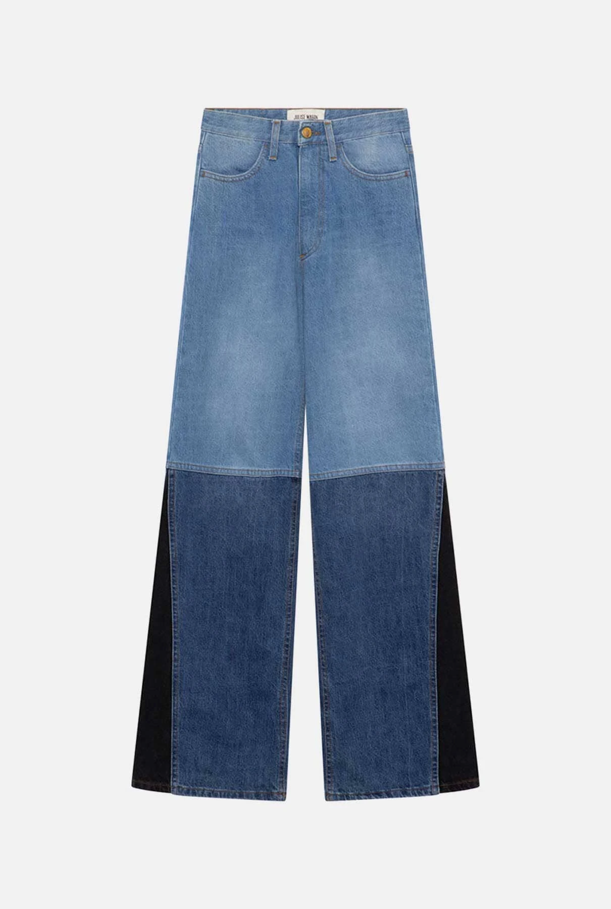 High-waisted denim jeans in three tones, medium blue on the top, dark blue on the bottom and navy blue side wedge. We recommend checking your measurements before sizing up.