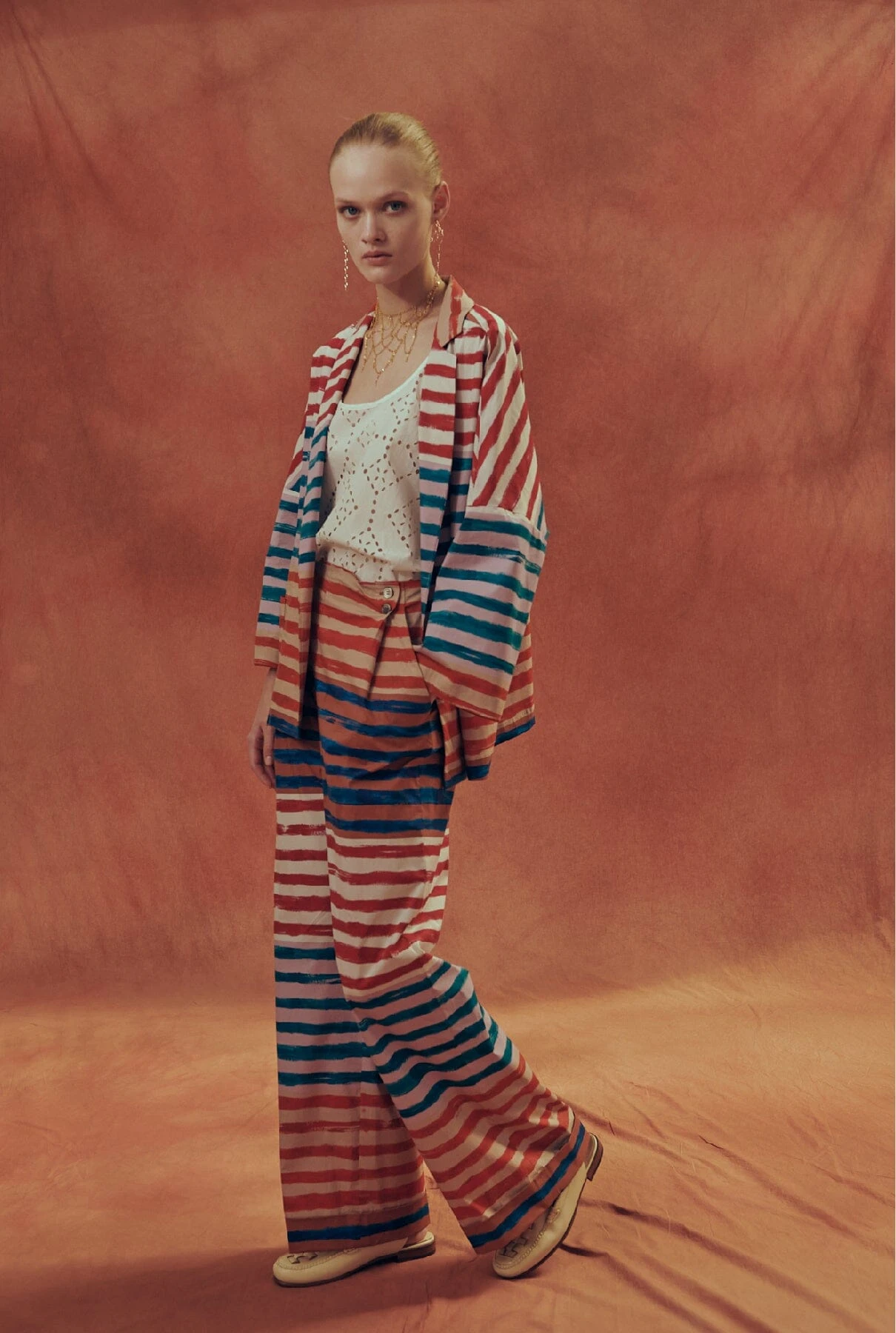 The «Marrakech» print is made in the pictorial technique of tempera. In order to achieve the effect of imperfect, manual, coloured stripes, the brush is dragged over the surface of a very porous cardboard so that each of the lines has a unique thickness and texture.