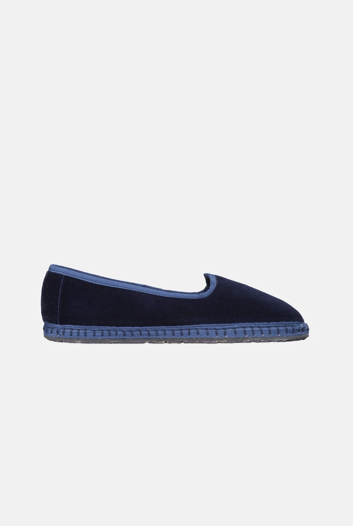 Navy blue velvet slipper with navy blue piping. The outside of the shoe is 100% cotton velvet, and the inside of the shoe is 100% ecological cotton with anti-bacterial treatment. The sole is made of rubber produced from recycled bicycle tyres.