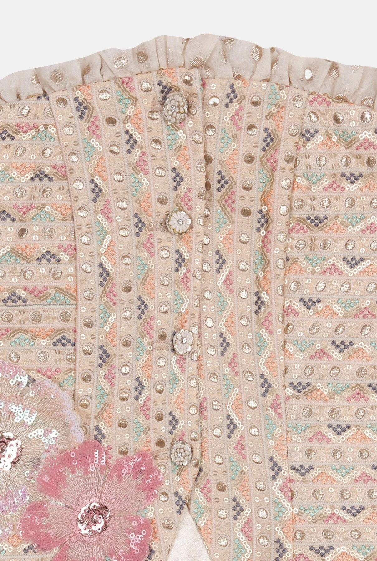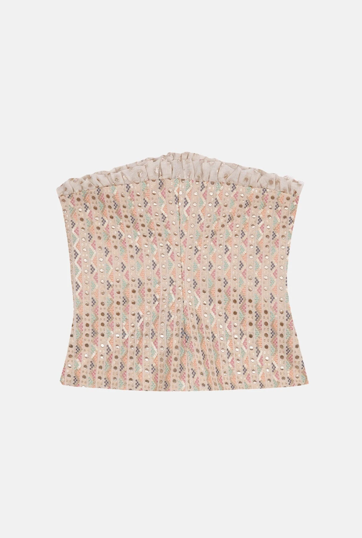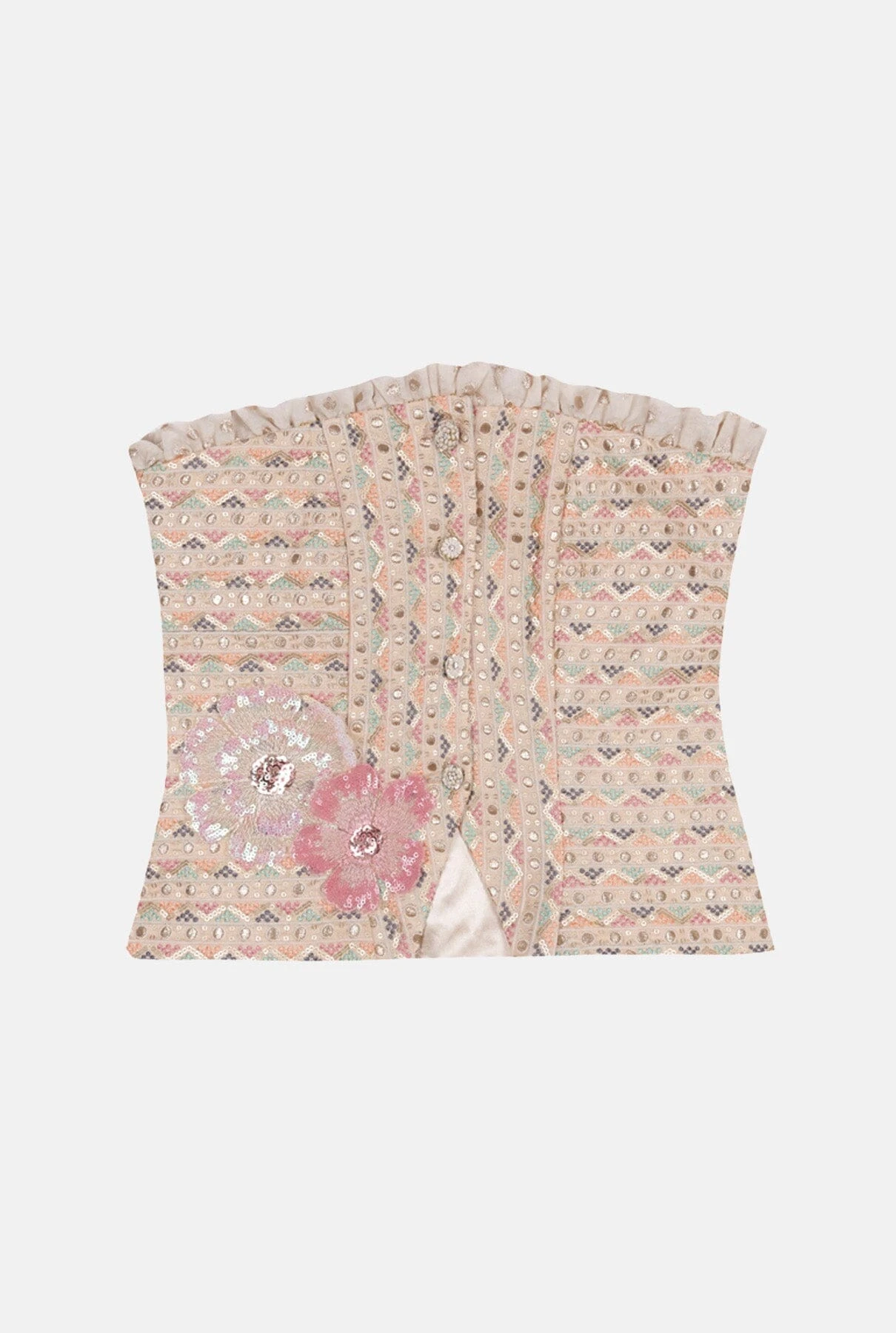 The «Andrea» corset is made of silk embroidered in pastel tones with gold thread and mirror detail. Off-shoulder model and front closure with jewel summarys. Detail of different flowers on the side and trim on the neckline. Satin lining.
