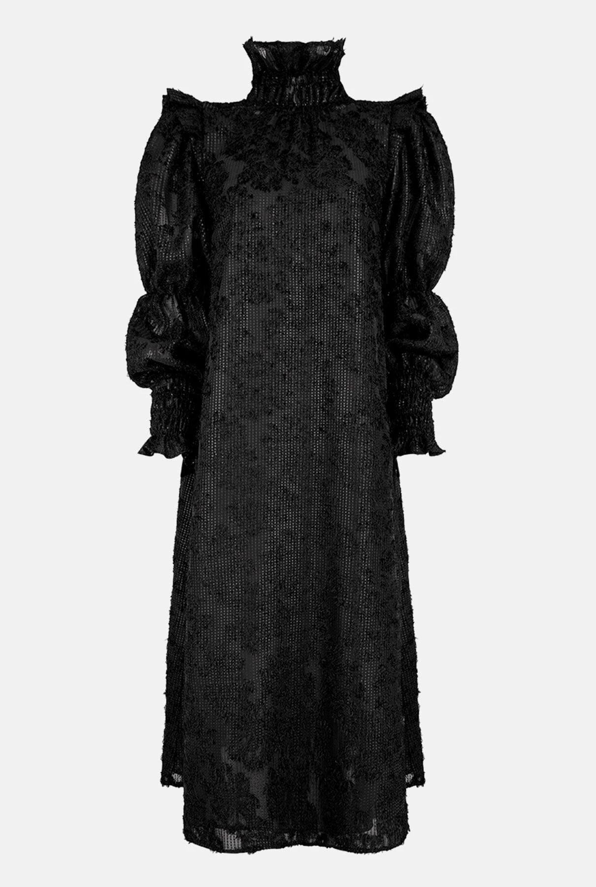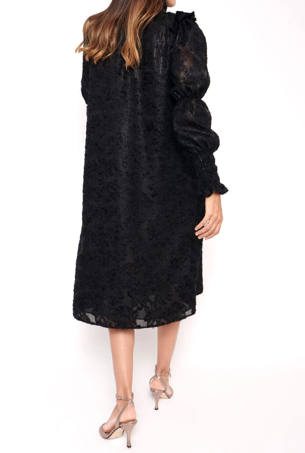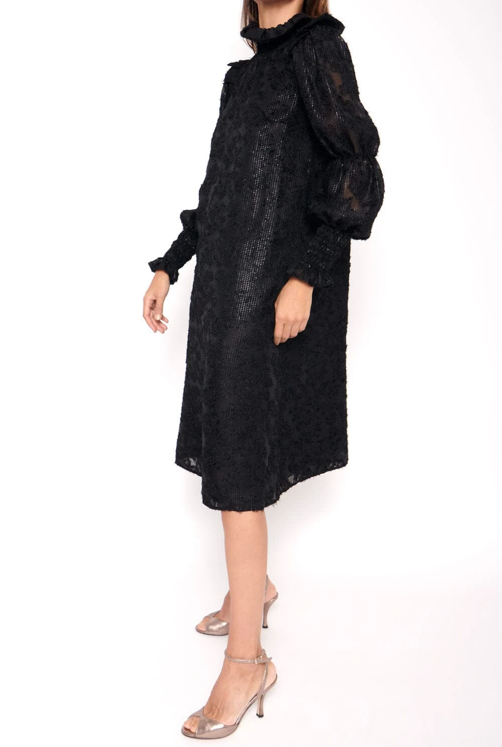 Midi dress. Jacquard fabric with flower texture and small sequins detail. High neckline with ruffled detail. Puffed sleeves with ruffle detail at the top.