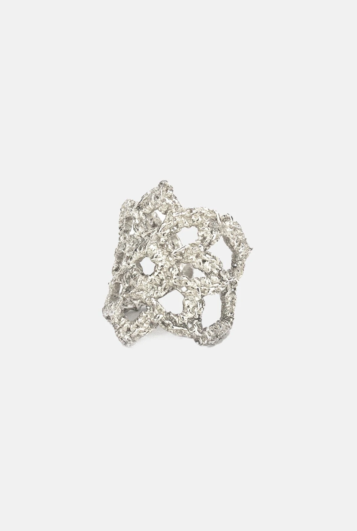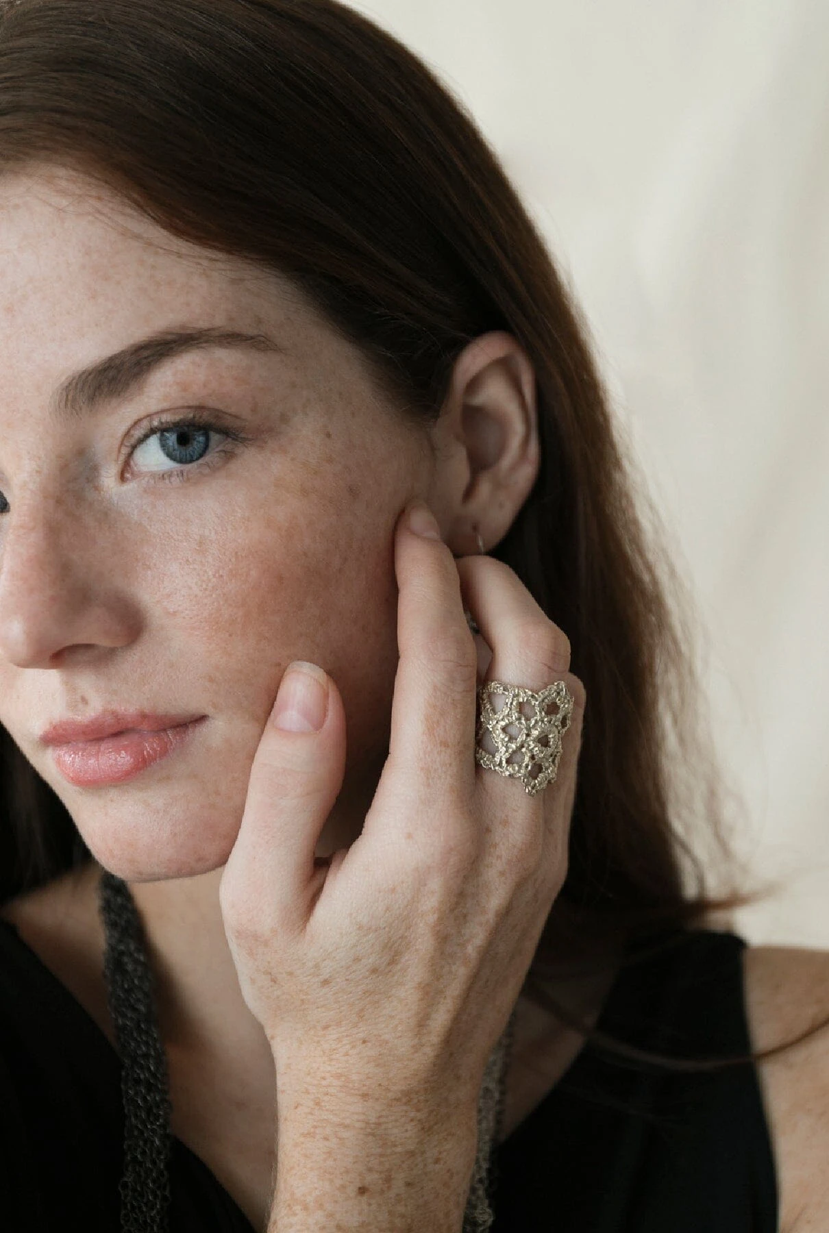 Crocheted fabric applied to jewelry in editions of very few units. Made using sustainable materials and processes as much as possible.