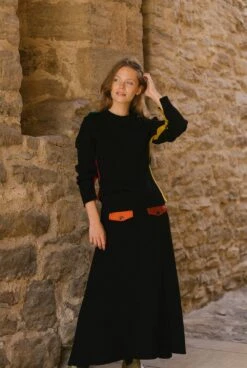 Velvet mary jane in black with black piping and buckle closure. The outside of the shoe is 100% cotton velvet, and the inside of the shoe is 100% ecological cotton with anti-bacterial treatment. The sole is made of rubber produced from recycled bicycle tyres.