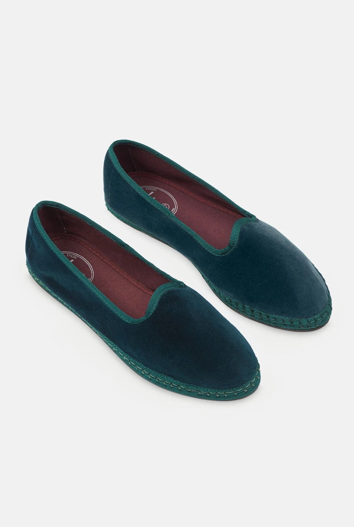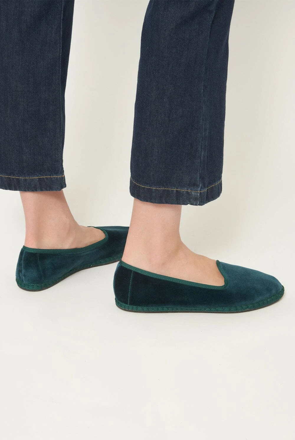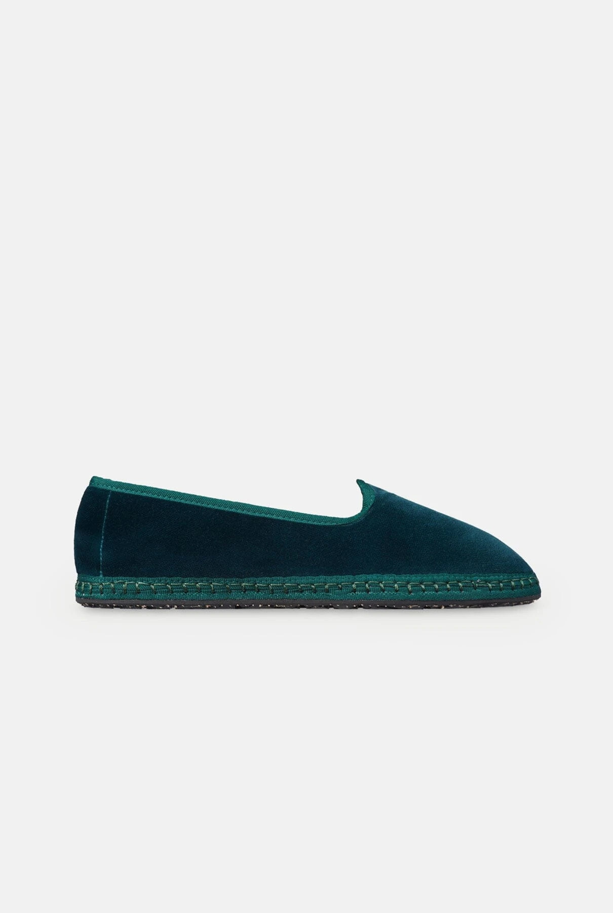Petrol green velvet slipper with petrol green piping. The outside of the shoe is 100% cotton velvet, and the inside of the shoe is 100% ecological cotton with anti-bacterial treatment. The sole is made of rubber produced from recycled bicycle tyres.