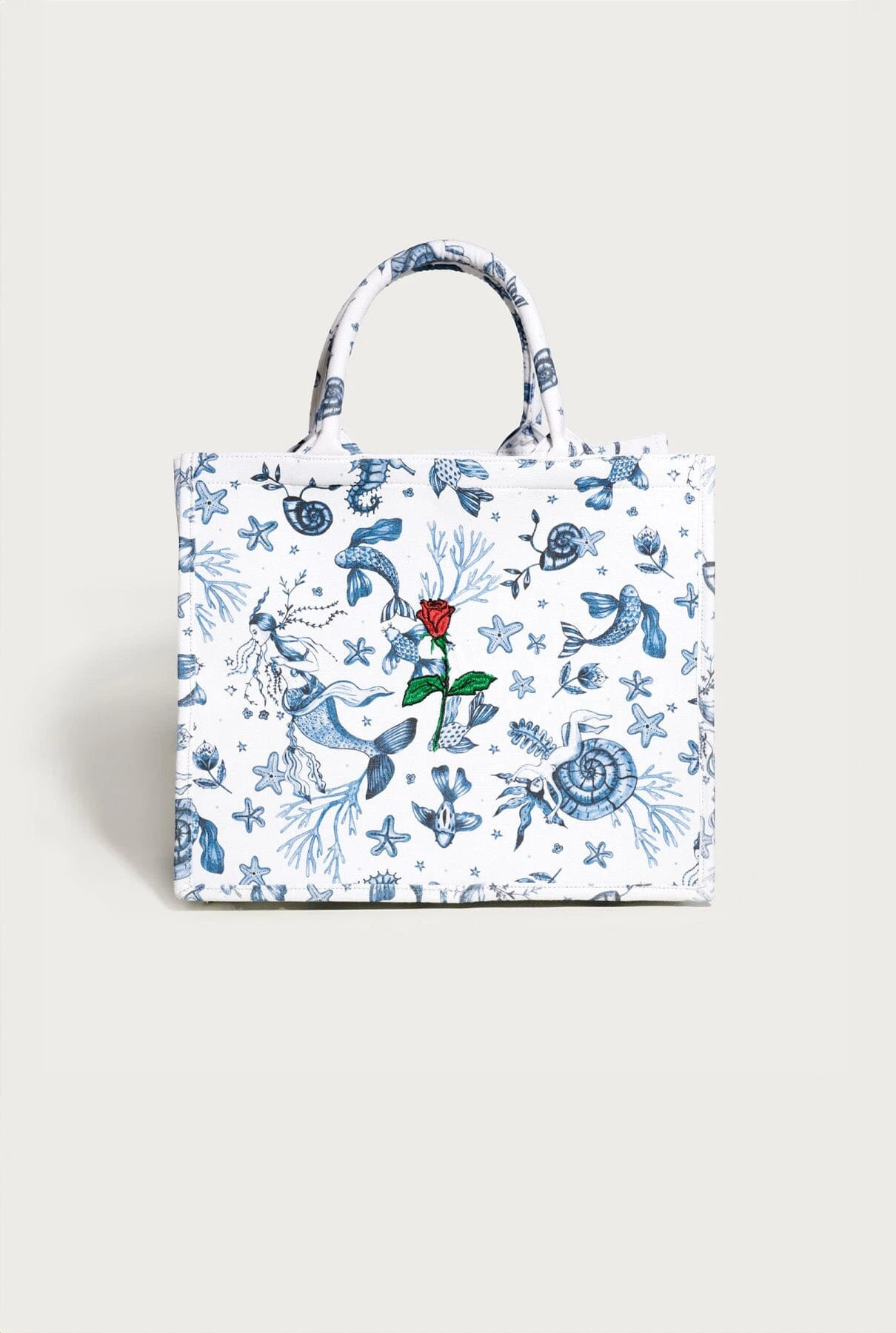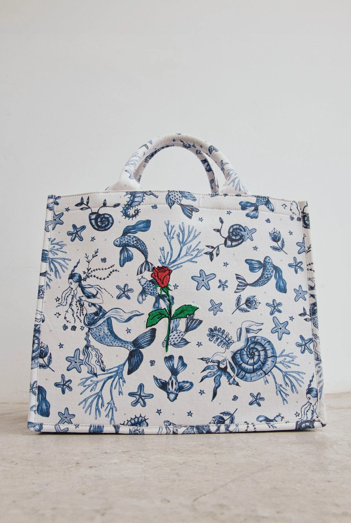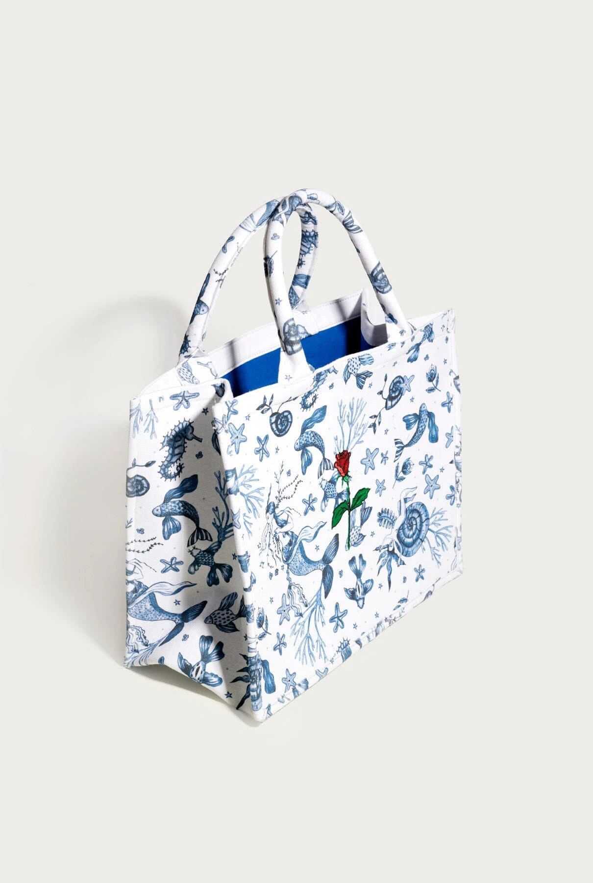 Yconic Nereids tote bag. «Nereids» print design by La Beltraneja, all over outer part and bag straps. Ynesuelves Rose logo embroidered on the centre of one of the sides. Blue navy on the inside. Rectangular solid base. Inner small pocket with metallic zip. Big cotton bag to use as bag cover or inner bag.