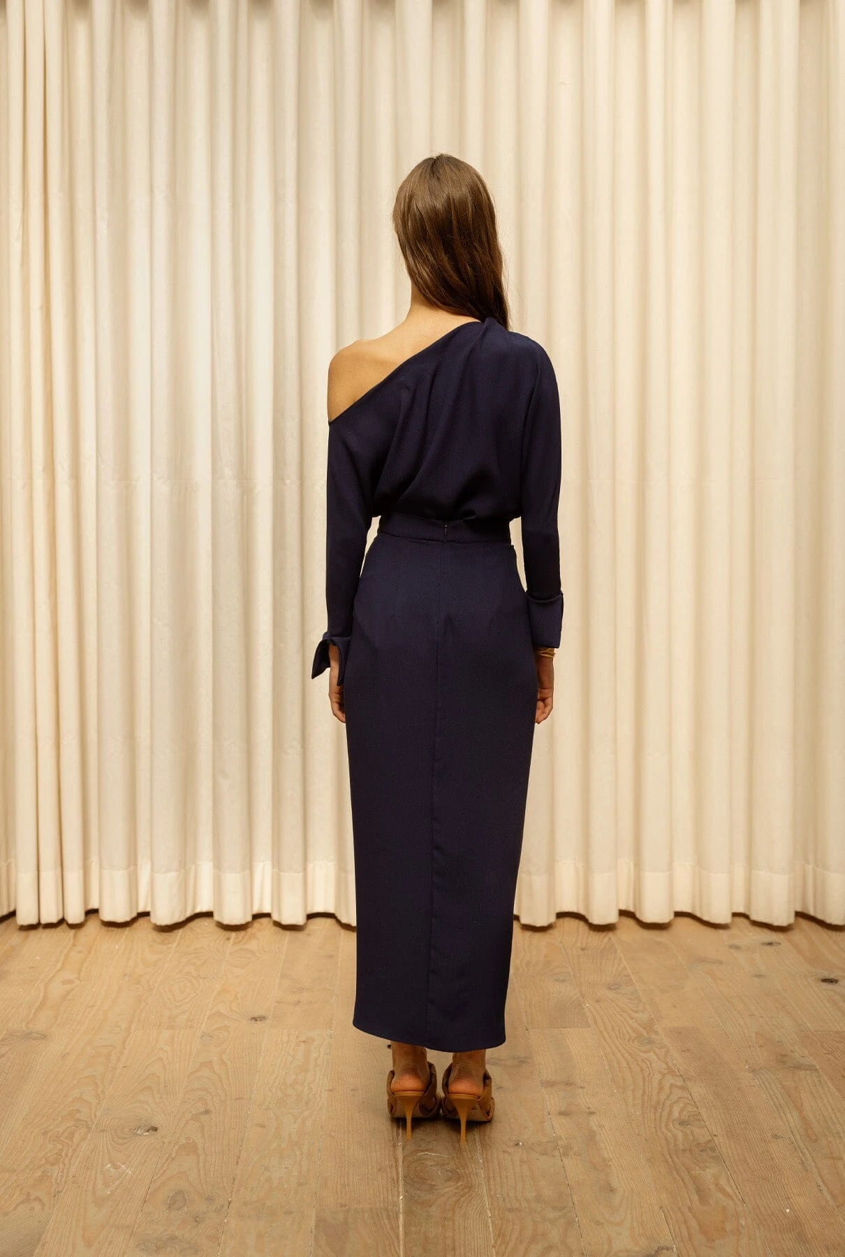 Wide asymmetric blouse with low-cut, draped shoulder and open cuffs.