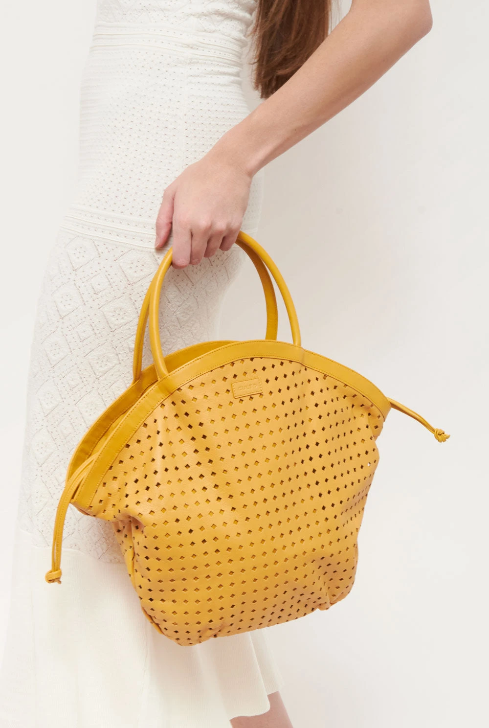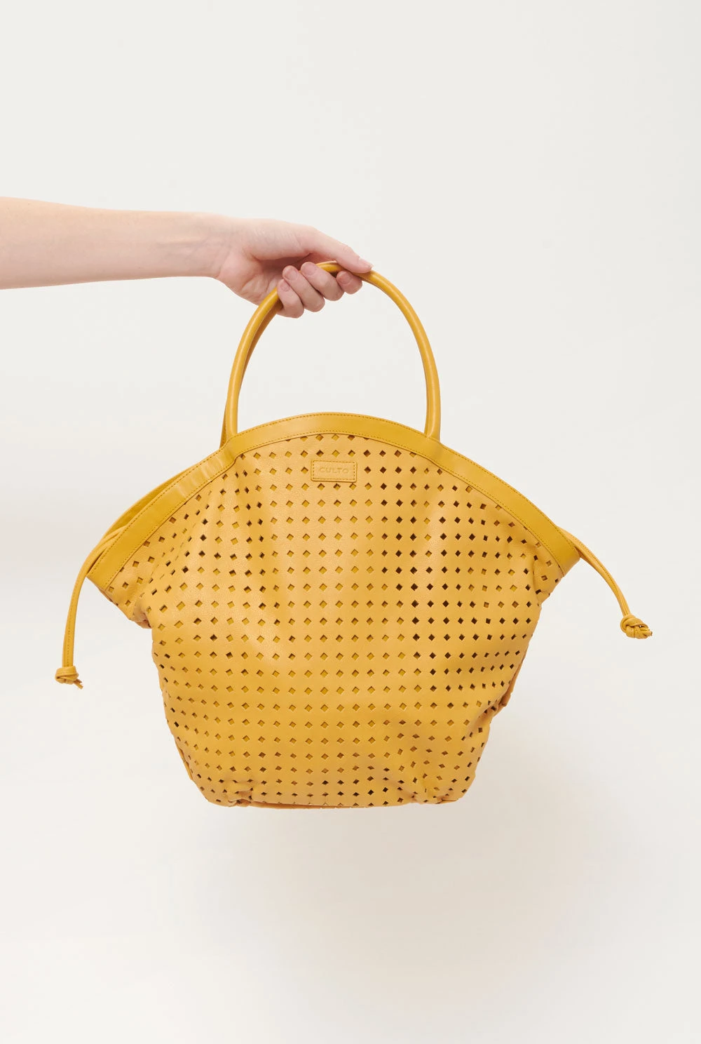 Large mustard die-cut leather bag. Inside zip pocket Inner lining in matching cotton. Handmade in Ubrique, Spain. Designed by Culto 1105