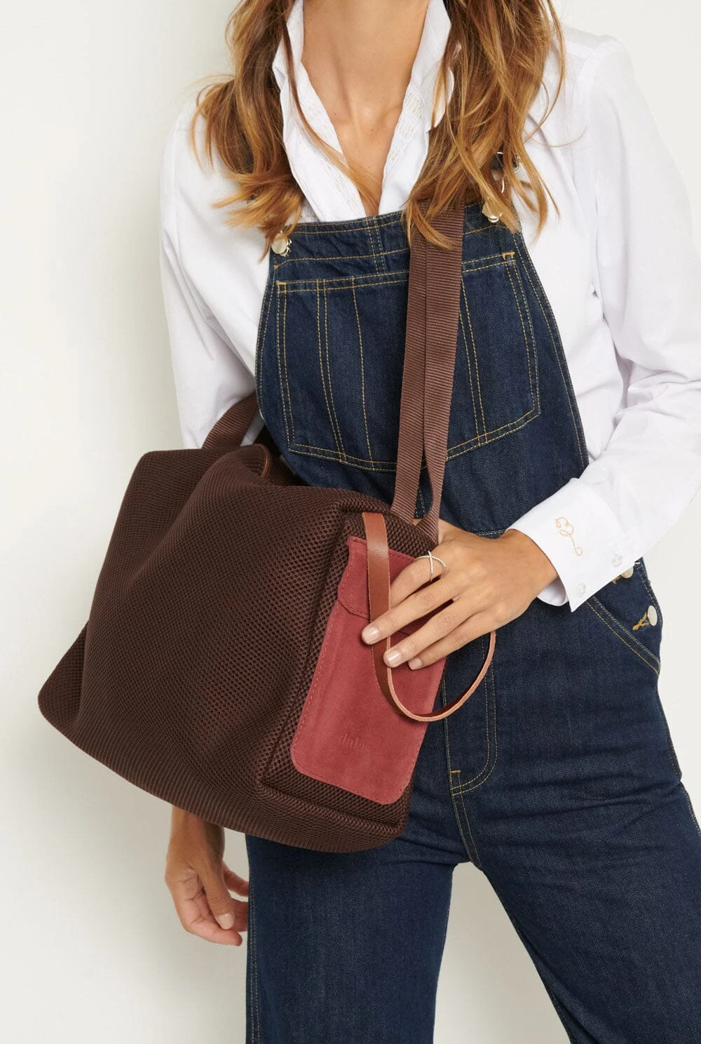 Big bag with pockets at the ends, one in suede and one in leather. To carry by hand or on the shoulder. Zip fastening and inside pocket. Designed and handmade in San Sebastian by Dalas.