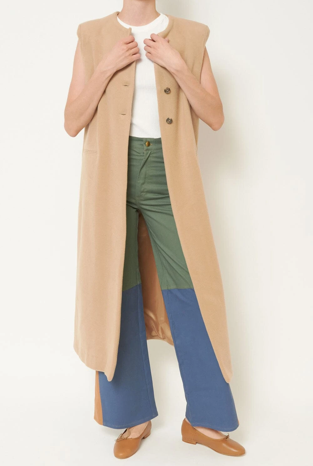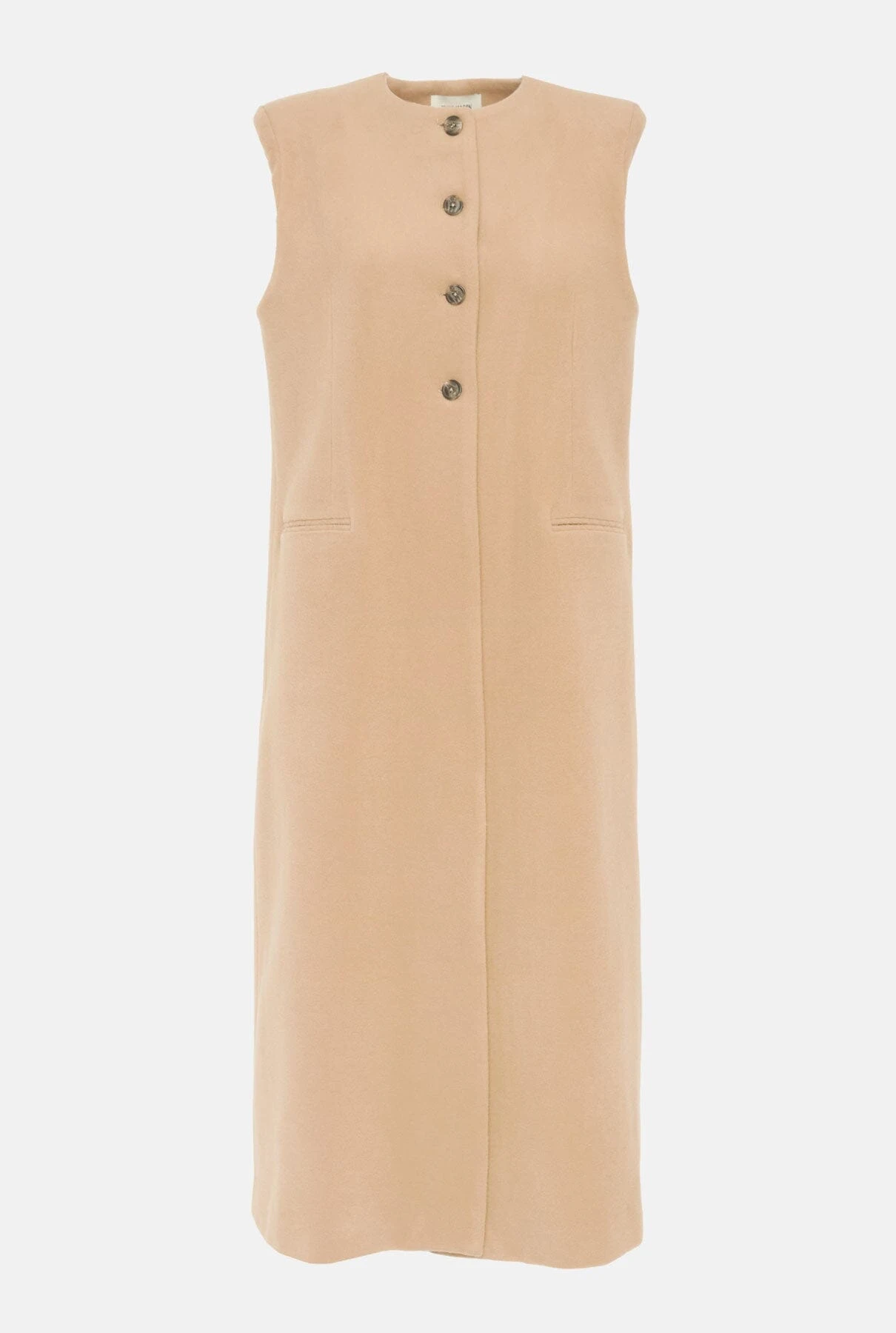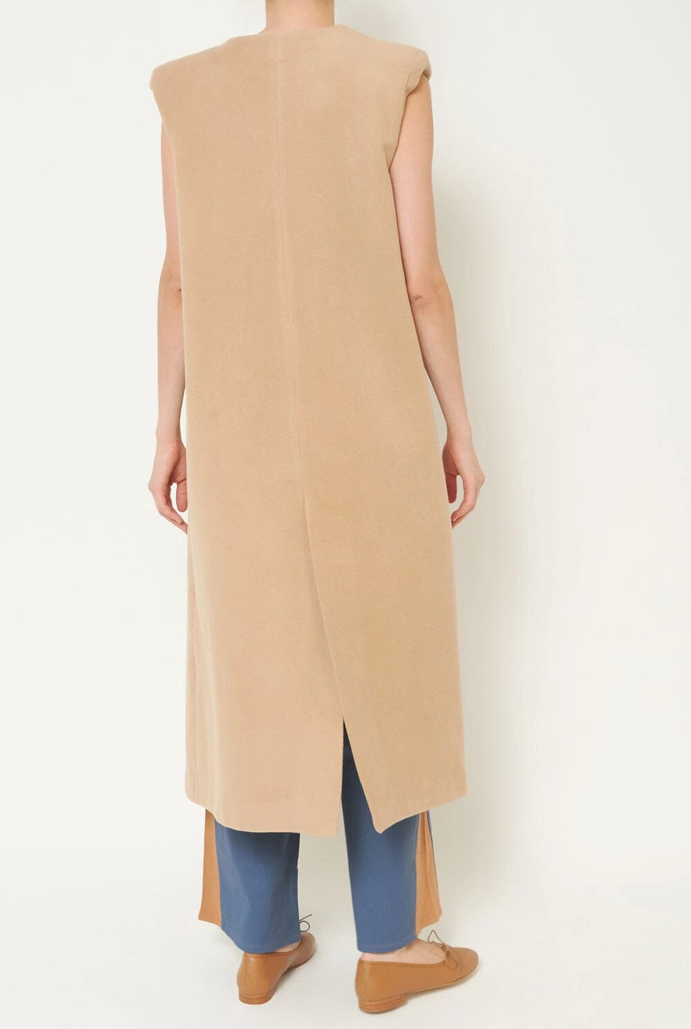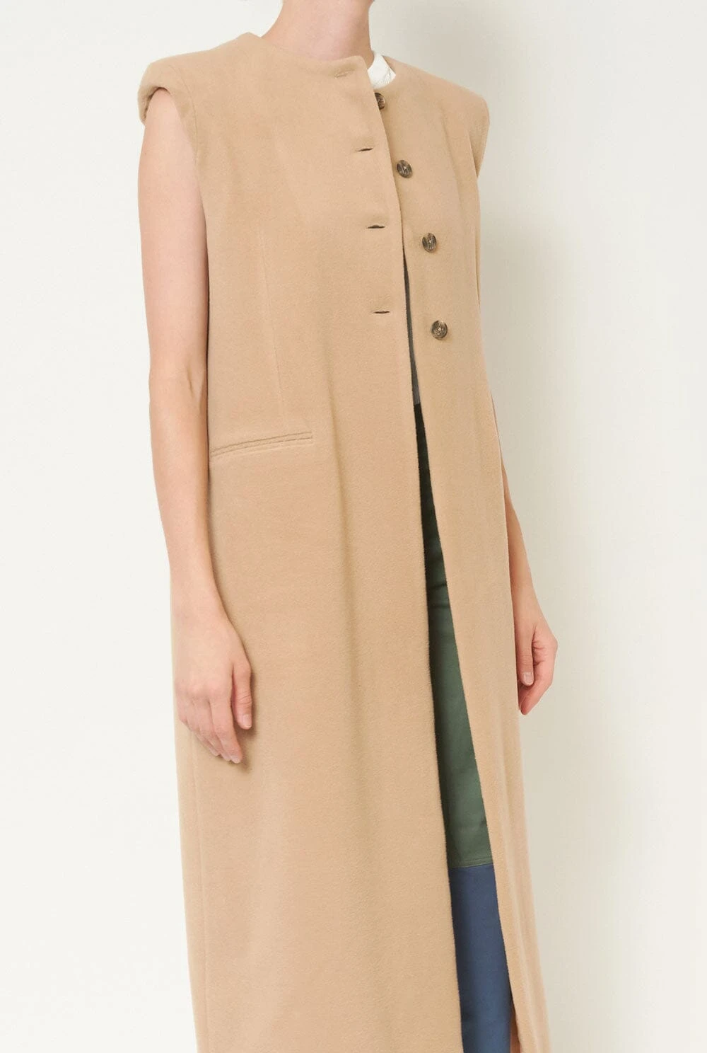 Long vest made of wool blend fabric. Box collar. Buttons to waist. High shoulder pads and side pockets. Back slit and tone-on-tone lining.