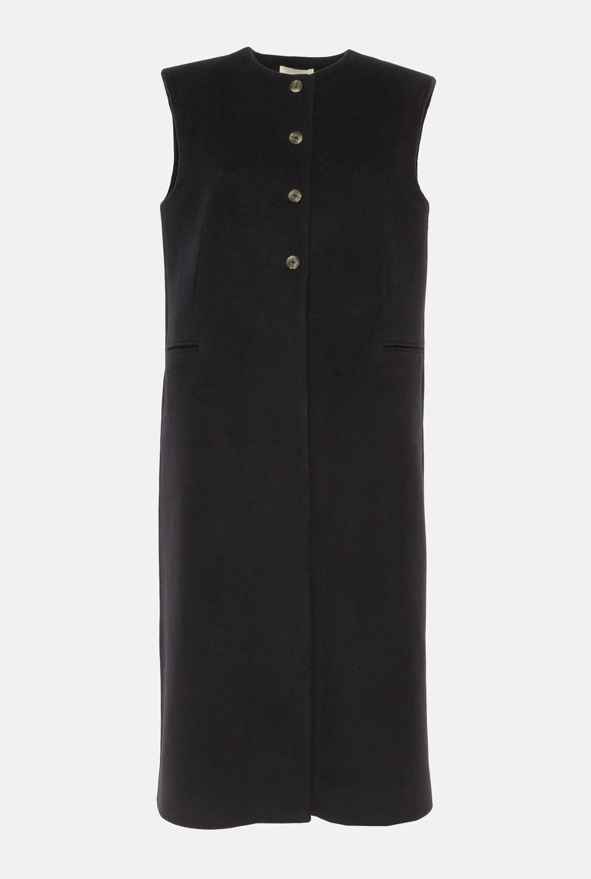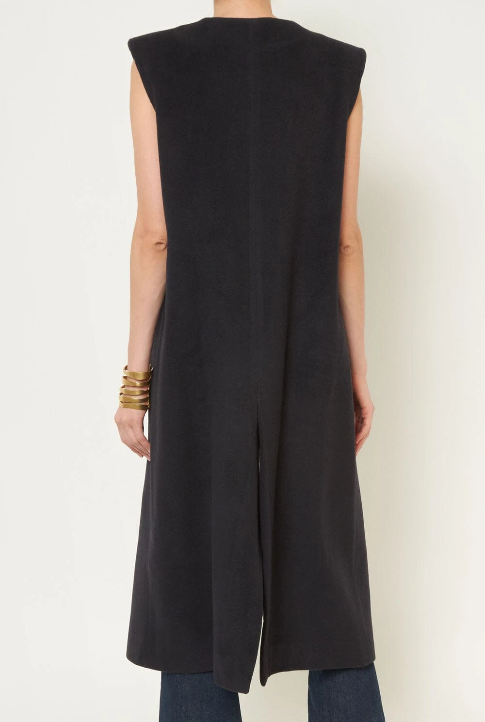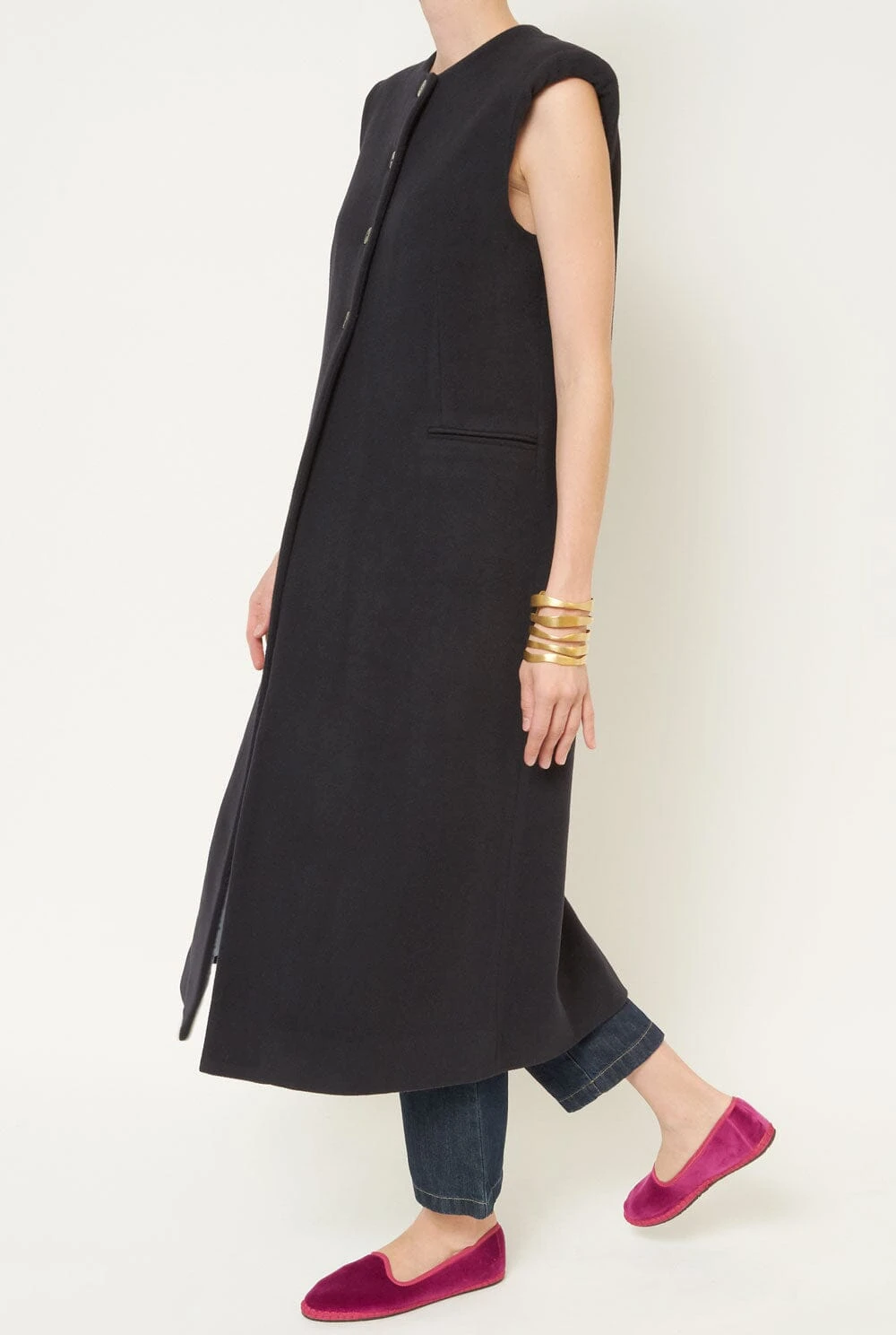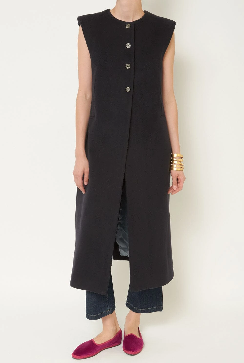 REINVENTION by Benedetta Perazzo EXCLUSIVE EDITION. Long vest made of wool blend fabric. Box collar. Buttons to waist. High shoulder pads and side pockets. Back slit and tone-on-tone lining.