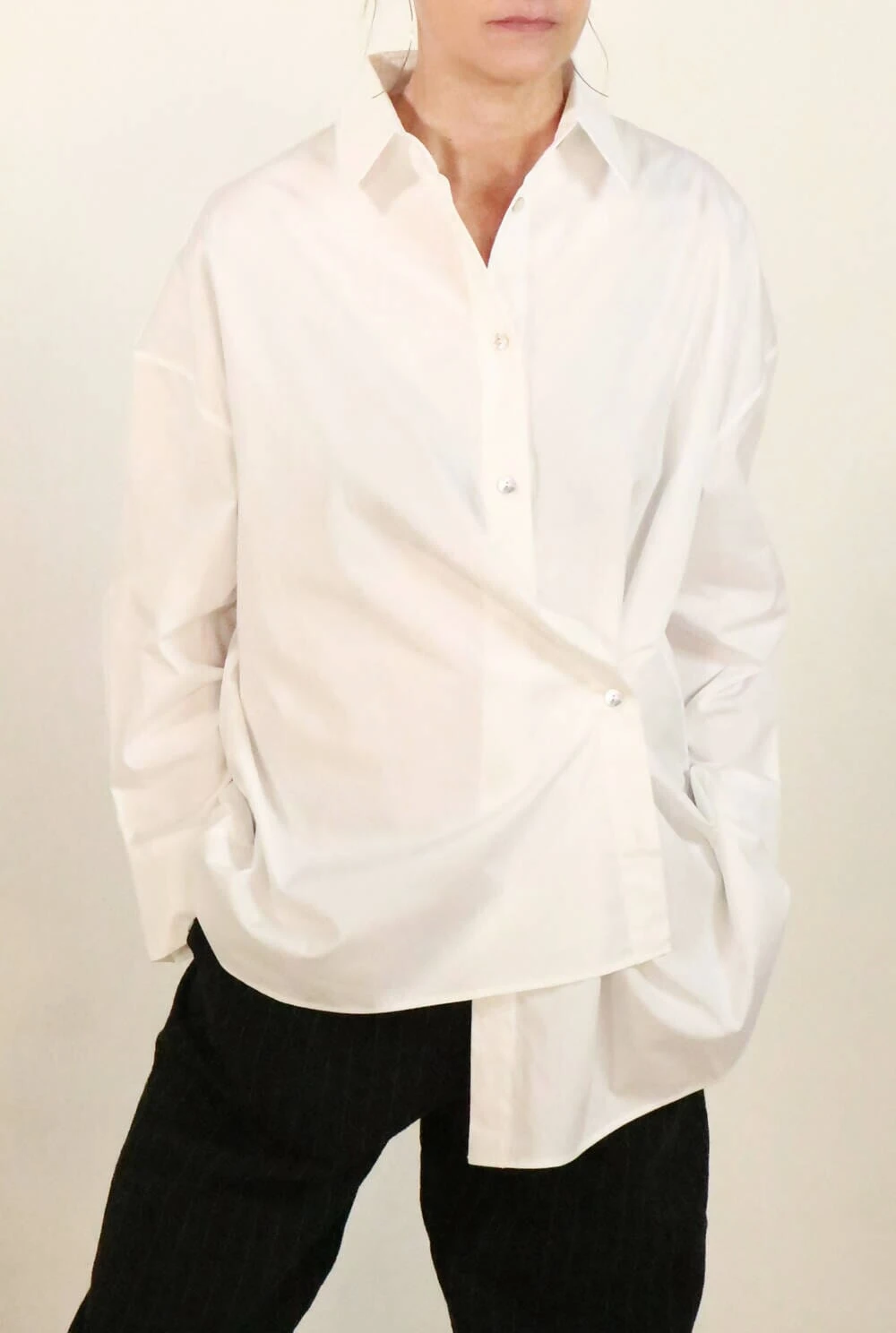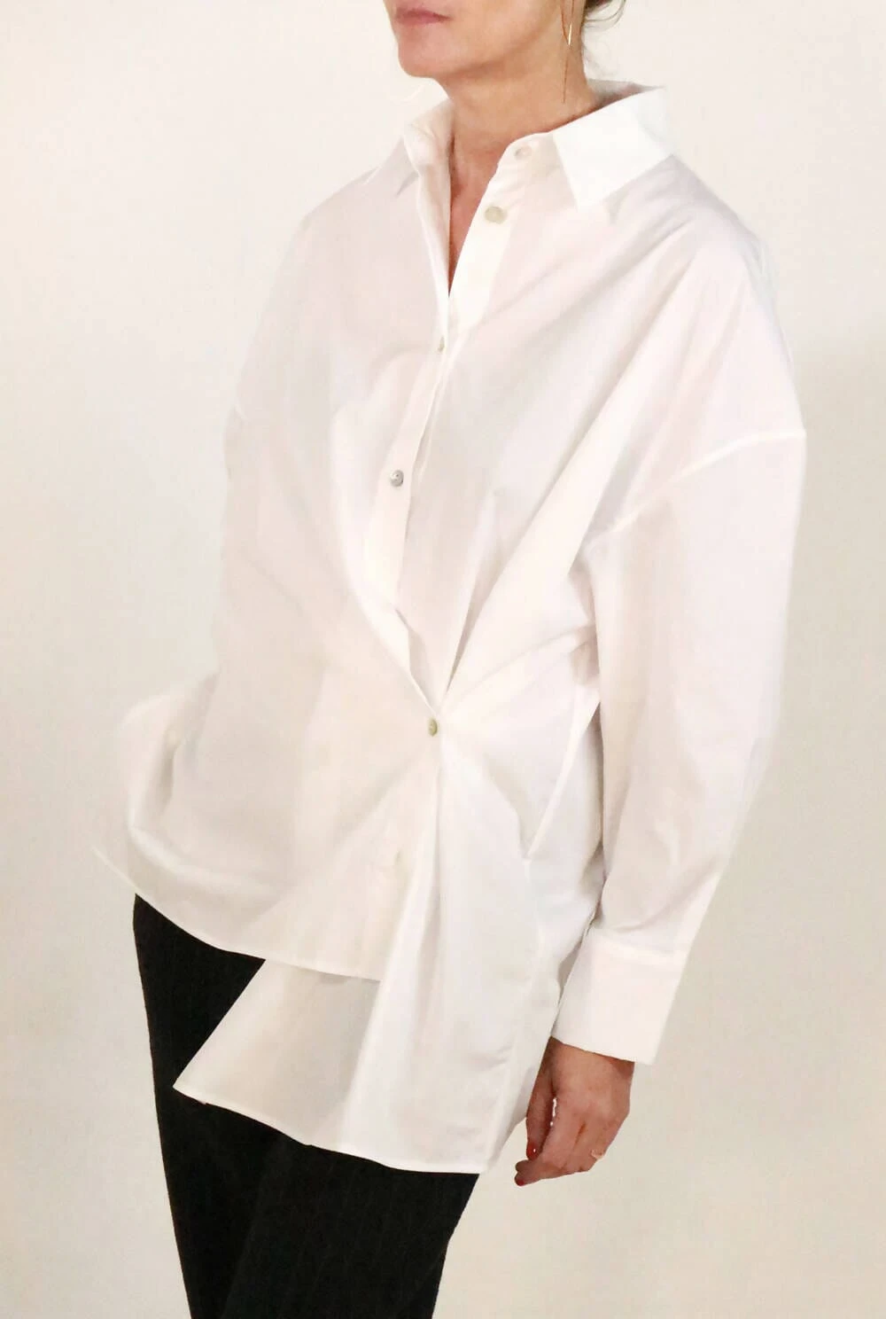 Oversize asymmetric shirt, with two positions. It can be summaryed in the classic way in the center or on one side, creating a drape and accentuating the asymmetry. The composition is Cotton, it is recommended to wash by hand, although it can also be washed in a washing machine on cotton programs. Do not use bleach, iron at low temperature, do not tumble dry.