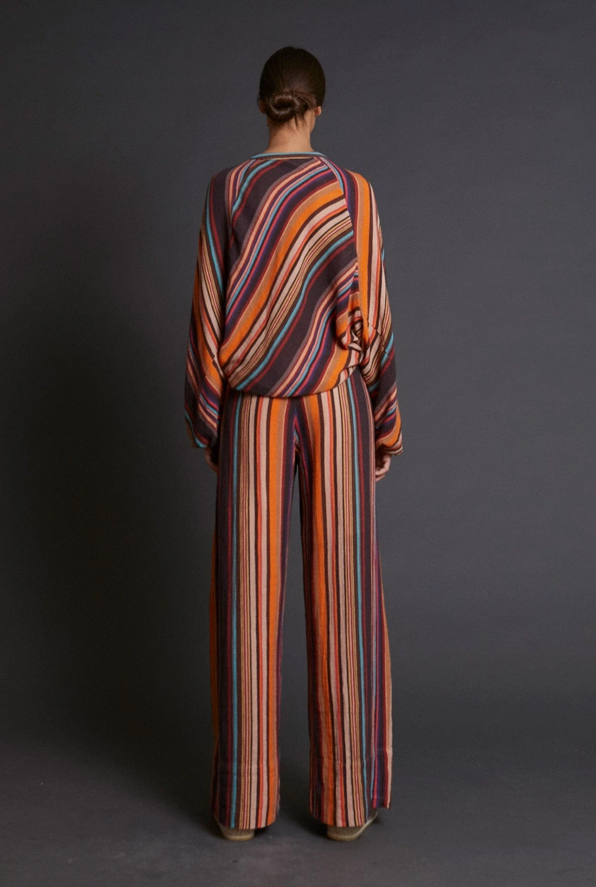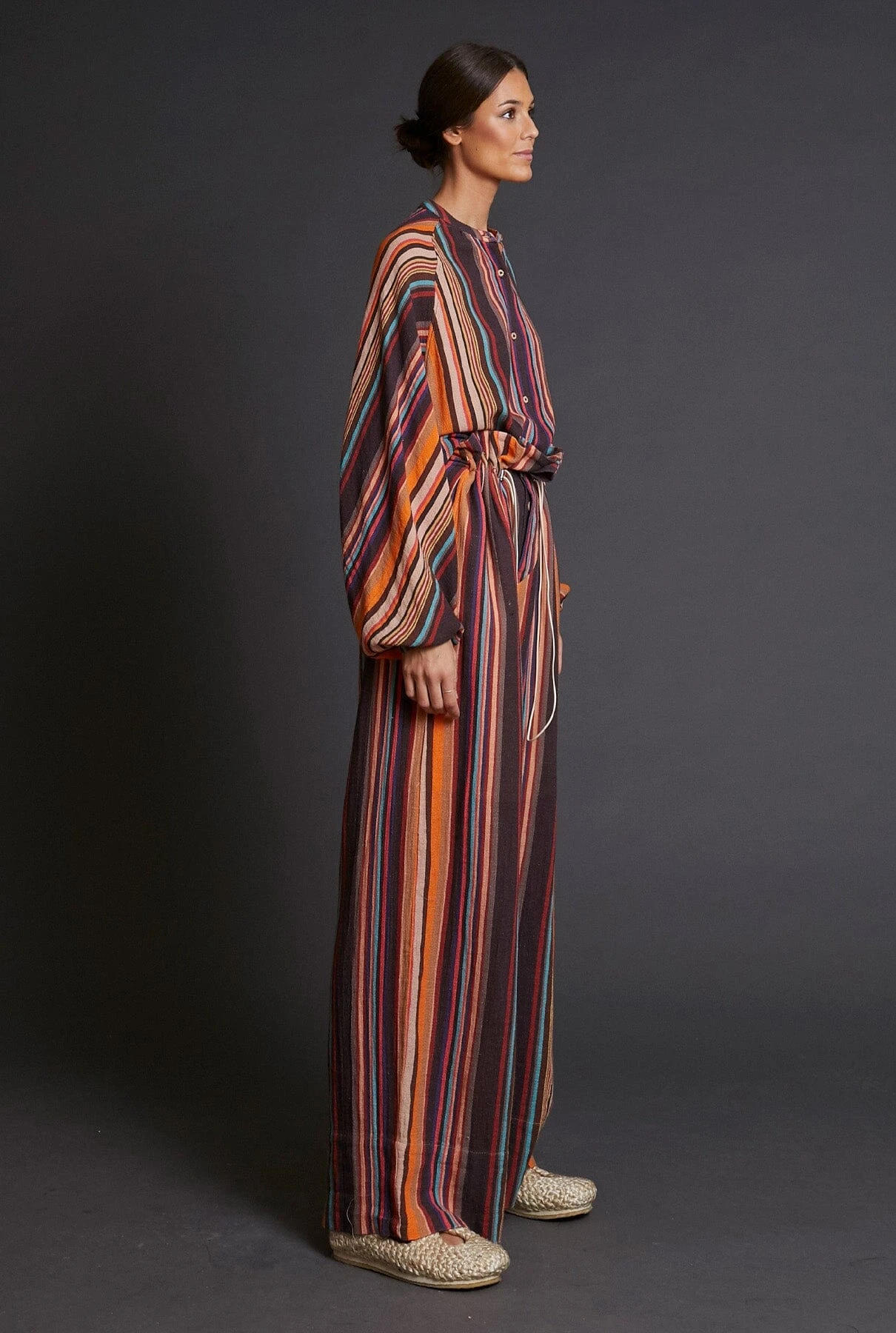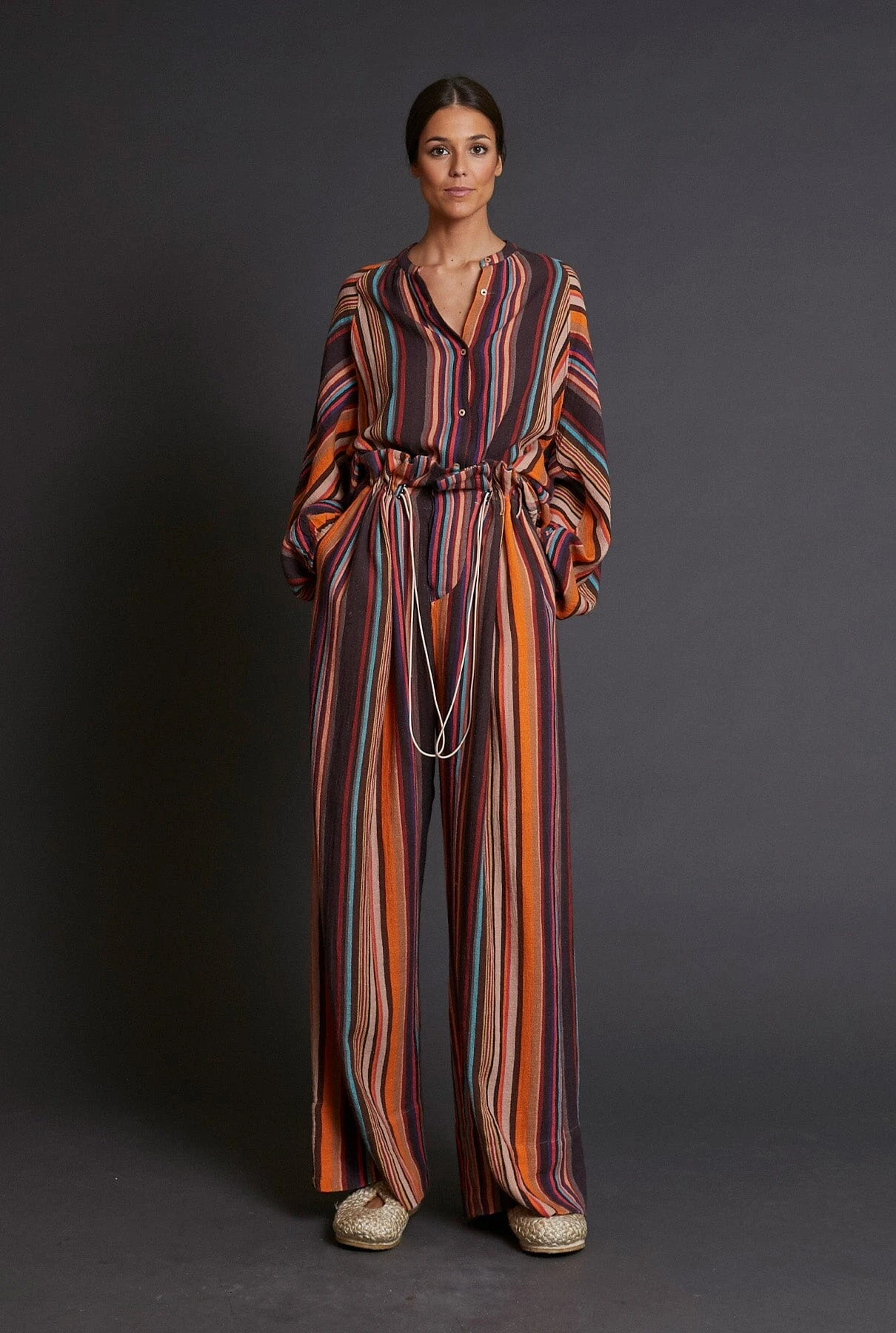 Mandarin collar shirt, long sleeves, front summarying with visible summarys lined with the same fabric