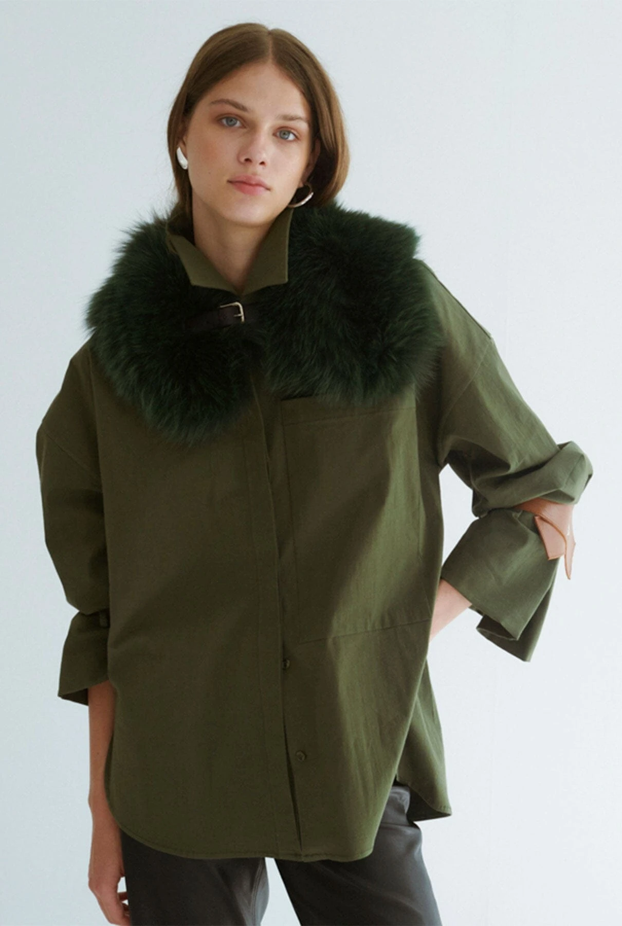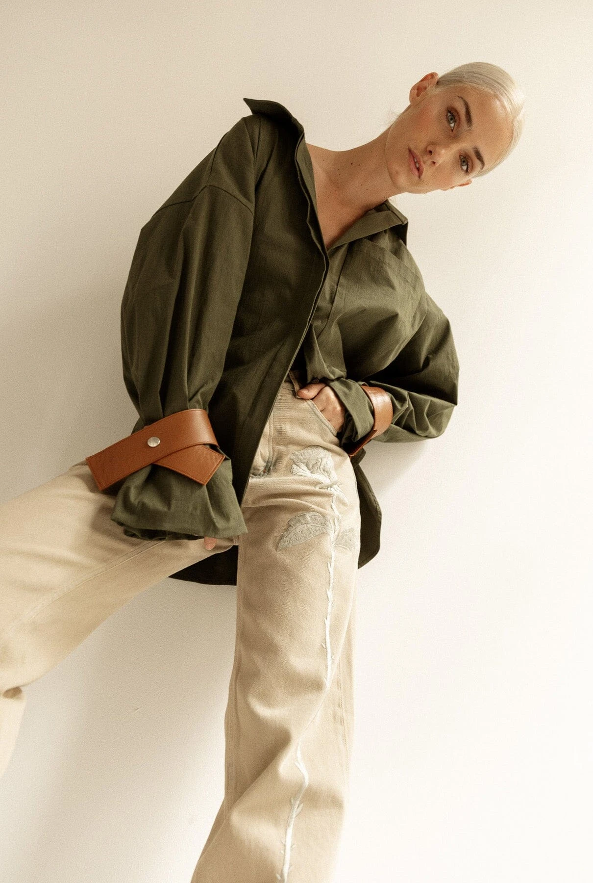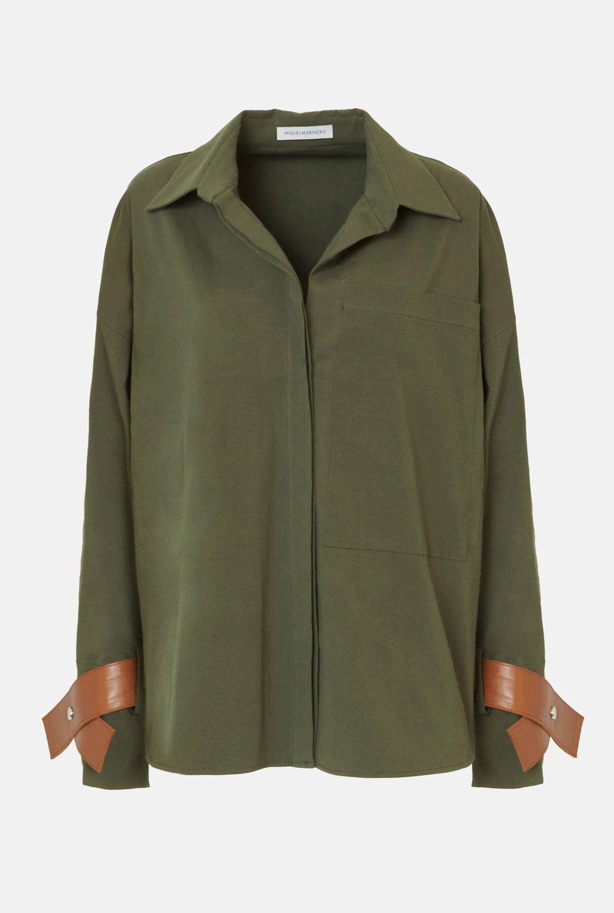 Miguel Marinero shirt in green cotton with brown leather detail on the cuffs. The leather on the sleeves makes it special and unique, providing a sophisticated and characteristic look of the brand. Complete your wardrobe with this wardrobe staple shirt, a versatile option for elegant meetings or a more casual, oversized look.