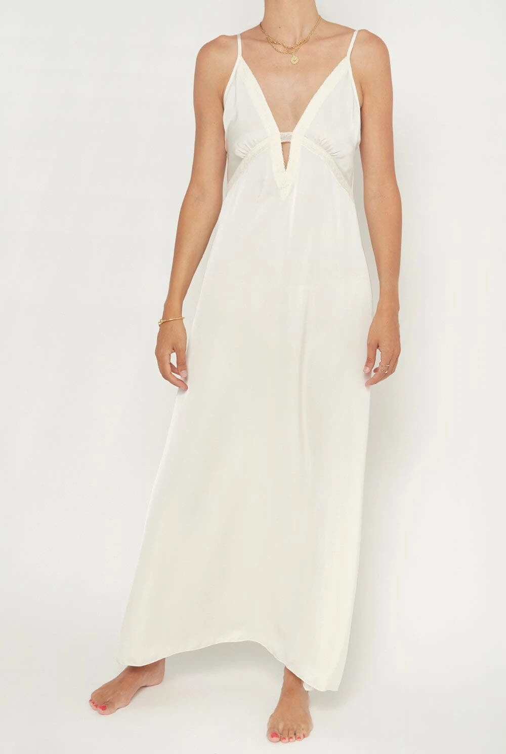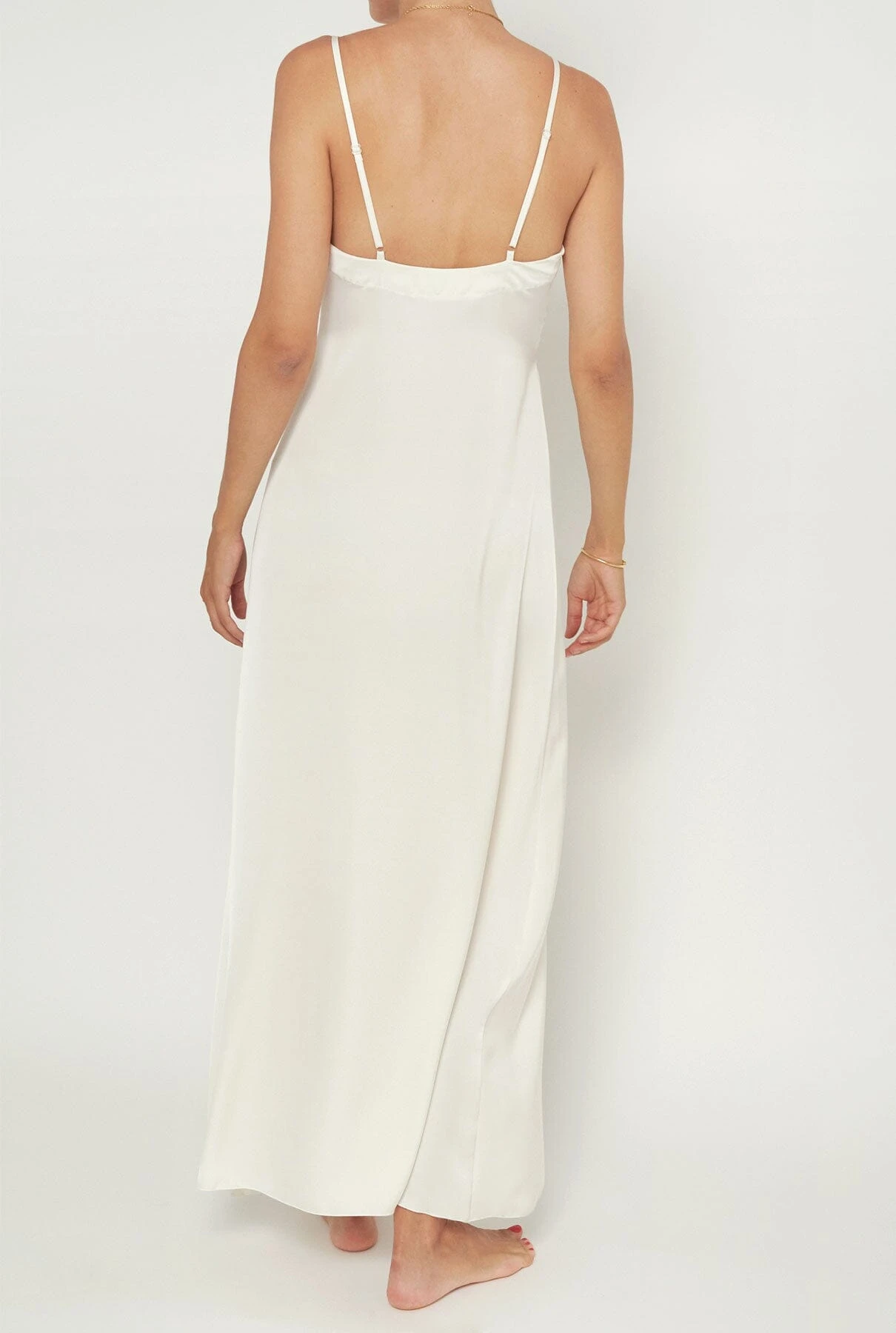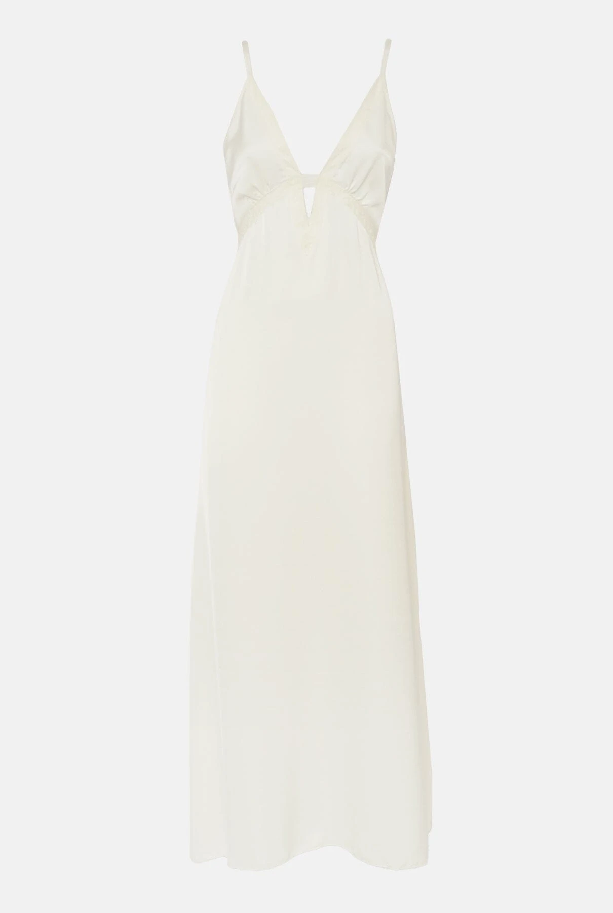 Ecru satin nightdress with V-neckline, with a strip that neckline forming a small triangle triangle and encircles under the chest. Fabric pleated at the bust. Adjustable straps.