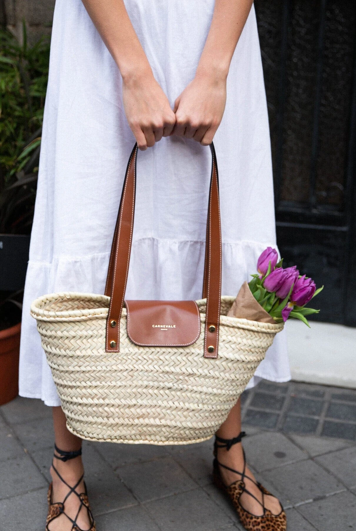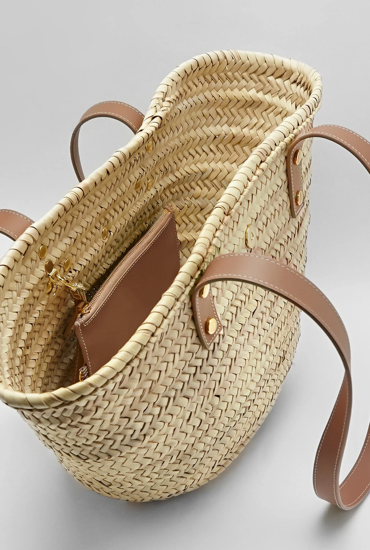 Handcrafted Basket Bag made of palm leaves and decorated with brown smooth cowhide leather handles and flap, embellished with the Carnevale logo engraved in gold. Contains a removable leather pouch bag inside. The flap closure is magnetic. Features gold-tone metallic finishes. The purchase includes an organic cotton bag.