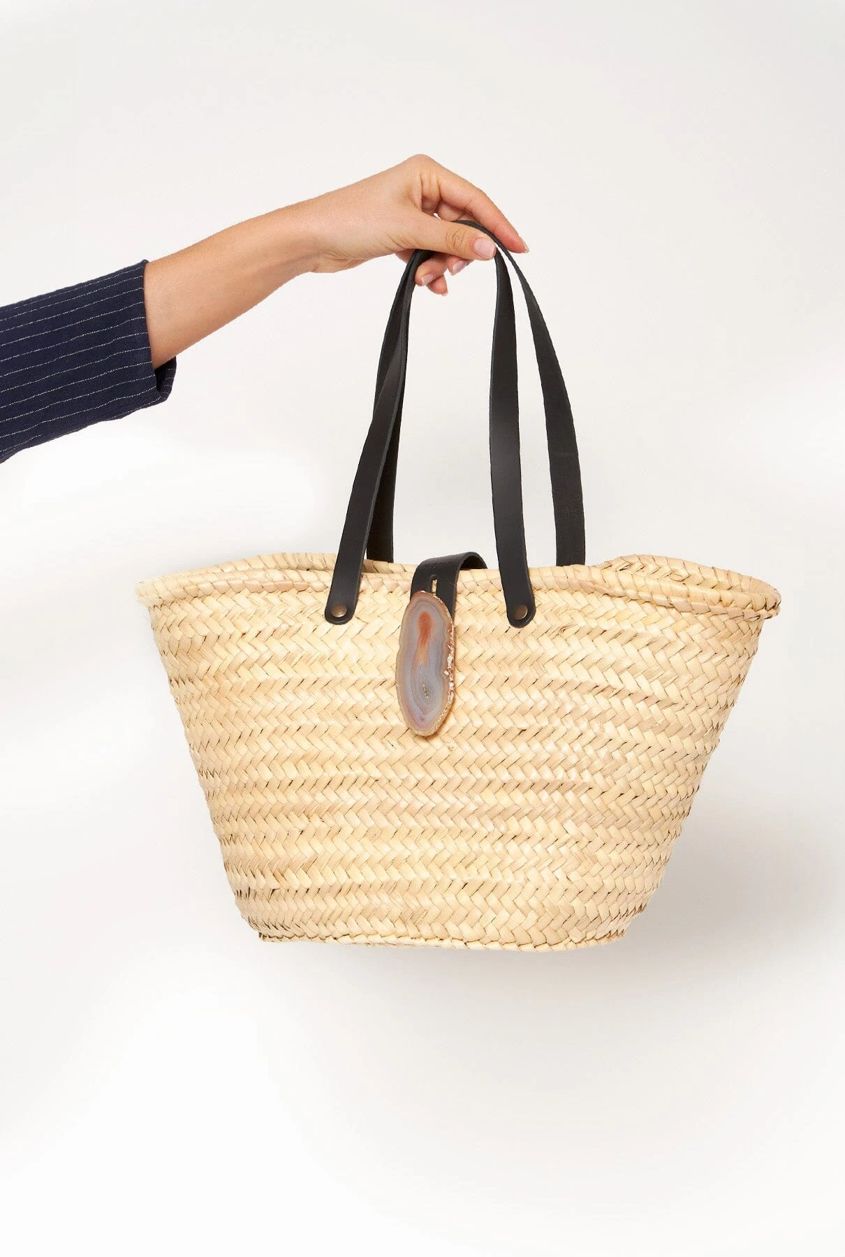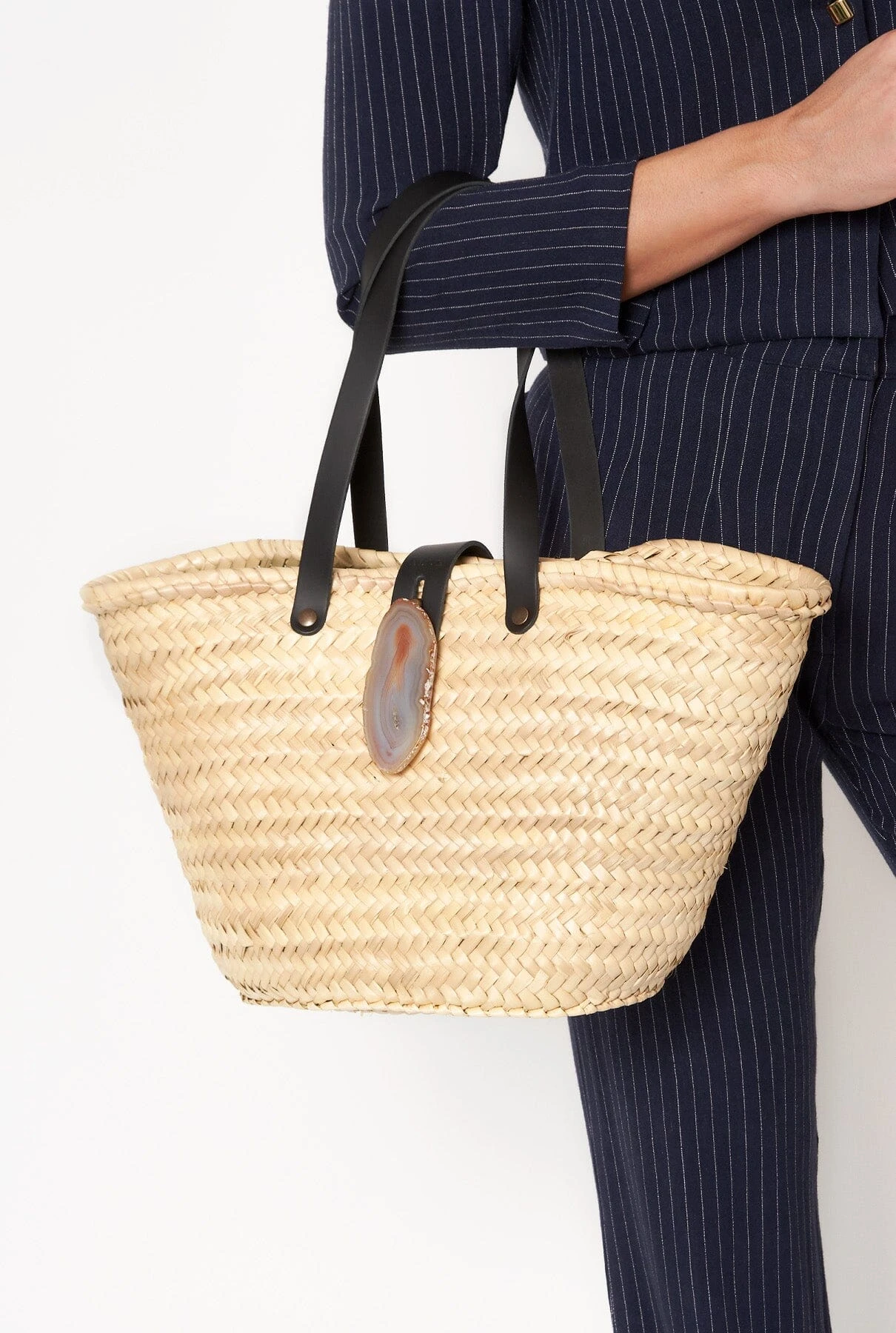 An original basket with leather and a unique natural agate stone. Additionally, the agate stones are interchangeable. Ideal for beach outings, picnics, or everyday use, this basket is a versatile and stylish companion. Each agate stone is one-of-a-kind, so the one you receive will closely resemble the one in the photo, and rest assured, each one is equally stunning.