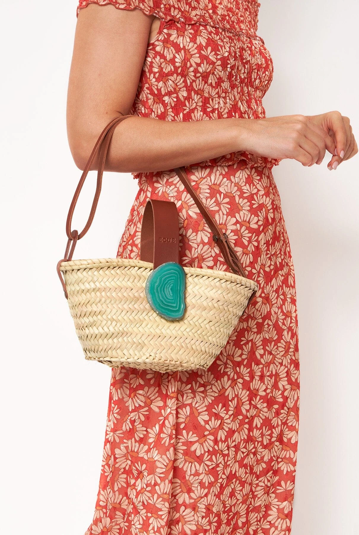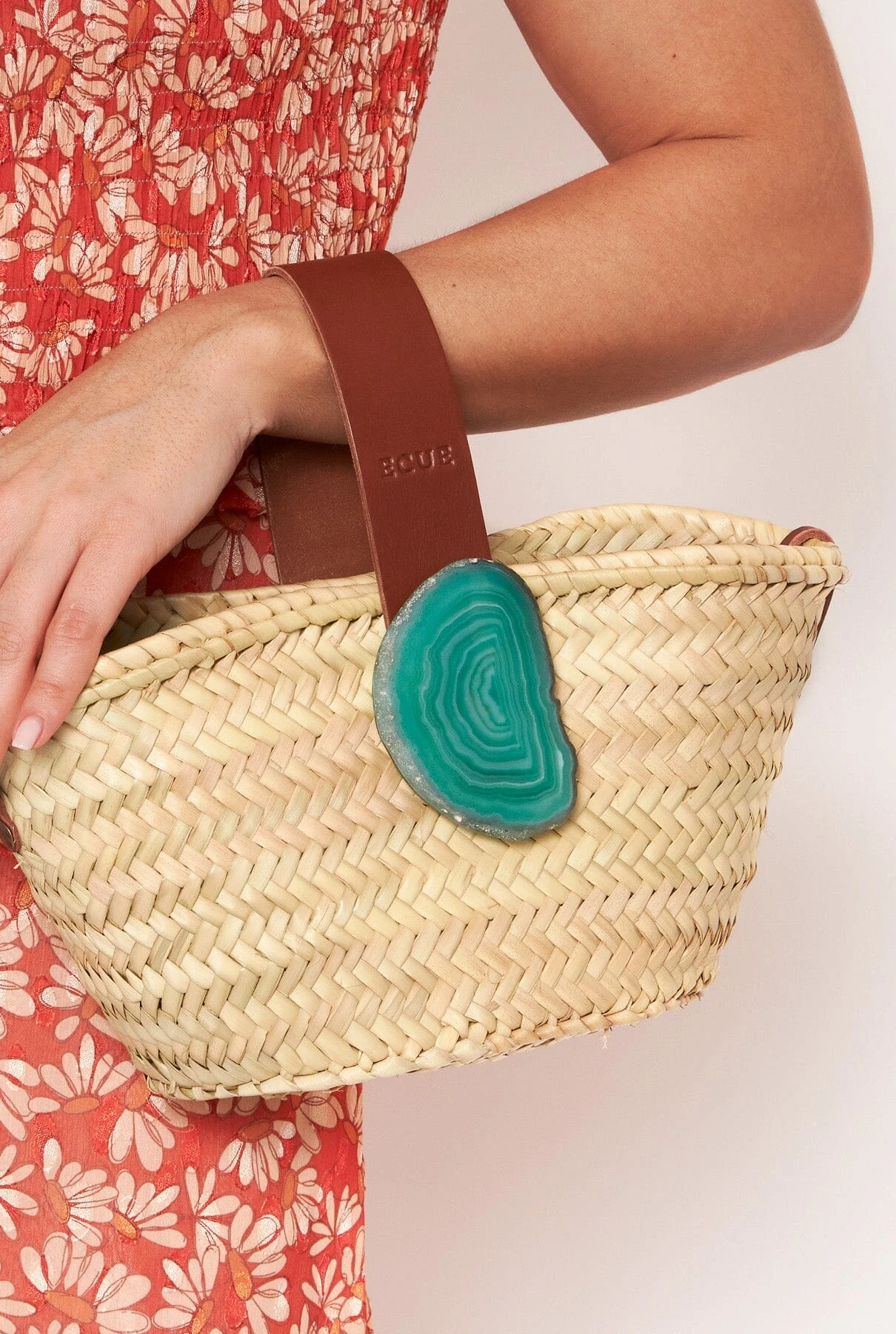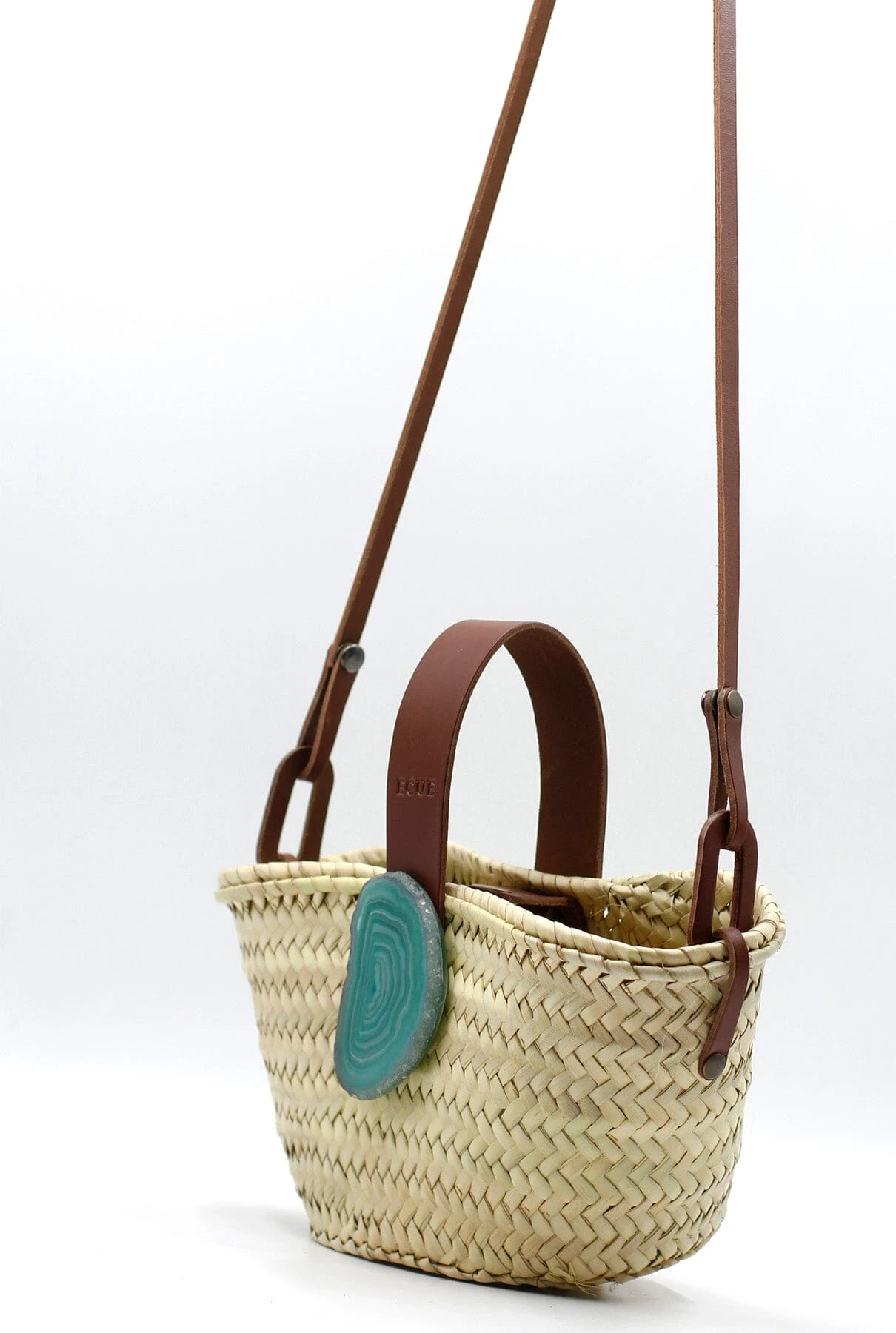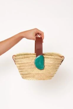 An original basket with leather and a unique natural agate stone. Additionally, the agate stones are interchangeable. Ideal for beach outings, picnics, or everyday use, this basket is a versatile and stylish companion. Each agate stone is one-of-a-kind, so the one you receive will closely resemble the one in the photo, and rest assured, each one is equally stunning.