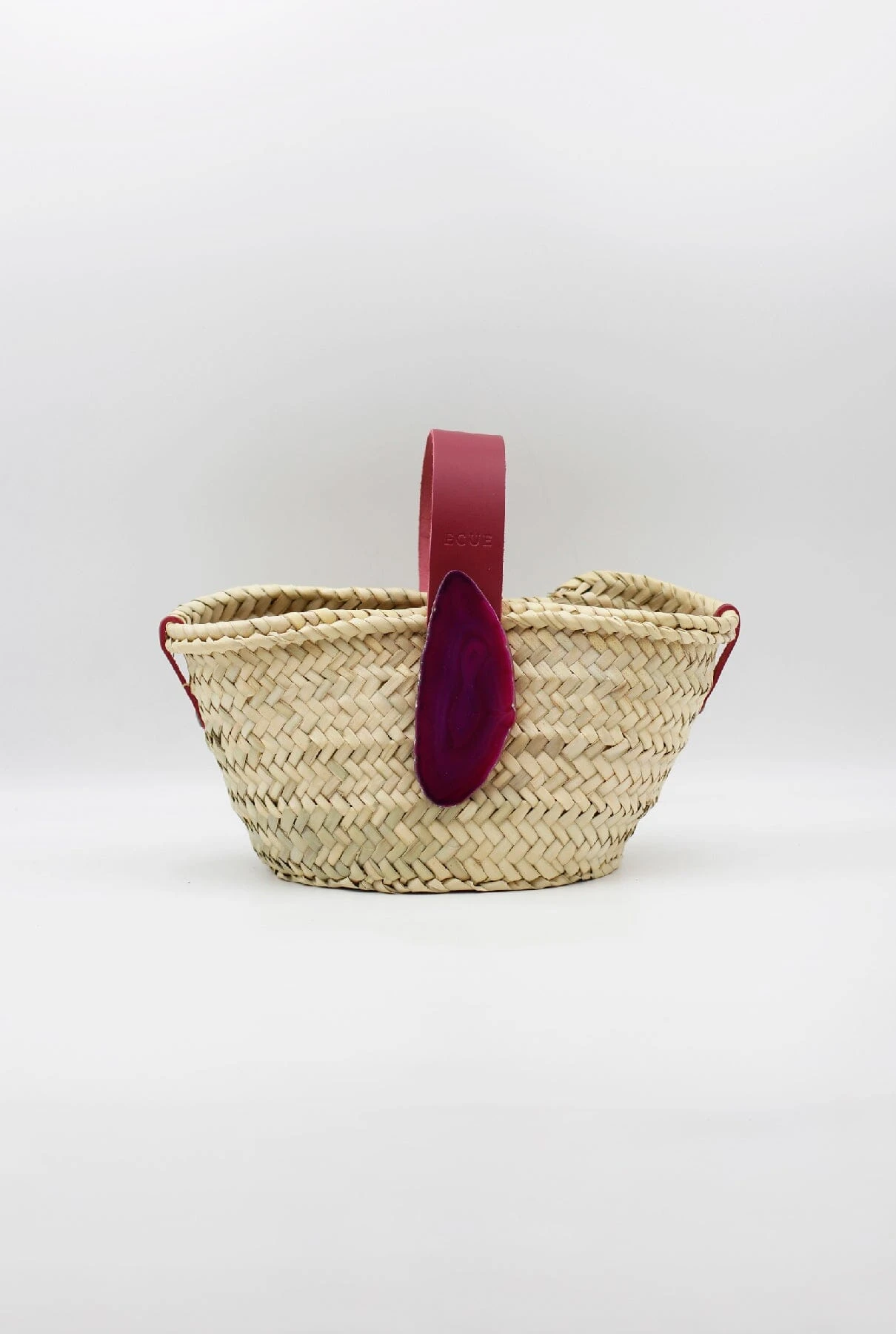 An original basket with leather and a unique natural agate stone. Additionally, the agate stones are interchangeable. Ideal for beach outings, picnics, or everyday use, this basket is a versatile and stylish companion. Each agate stone is one-of-a-kind, so the one you receive will closely resemble the one in the photo, and rest assured, each one is equally stunning.
