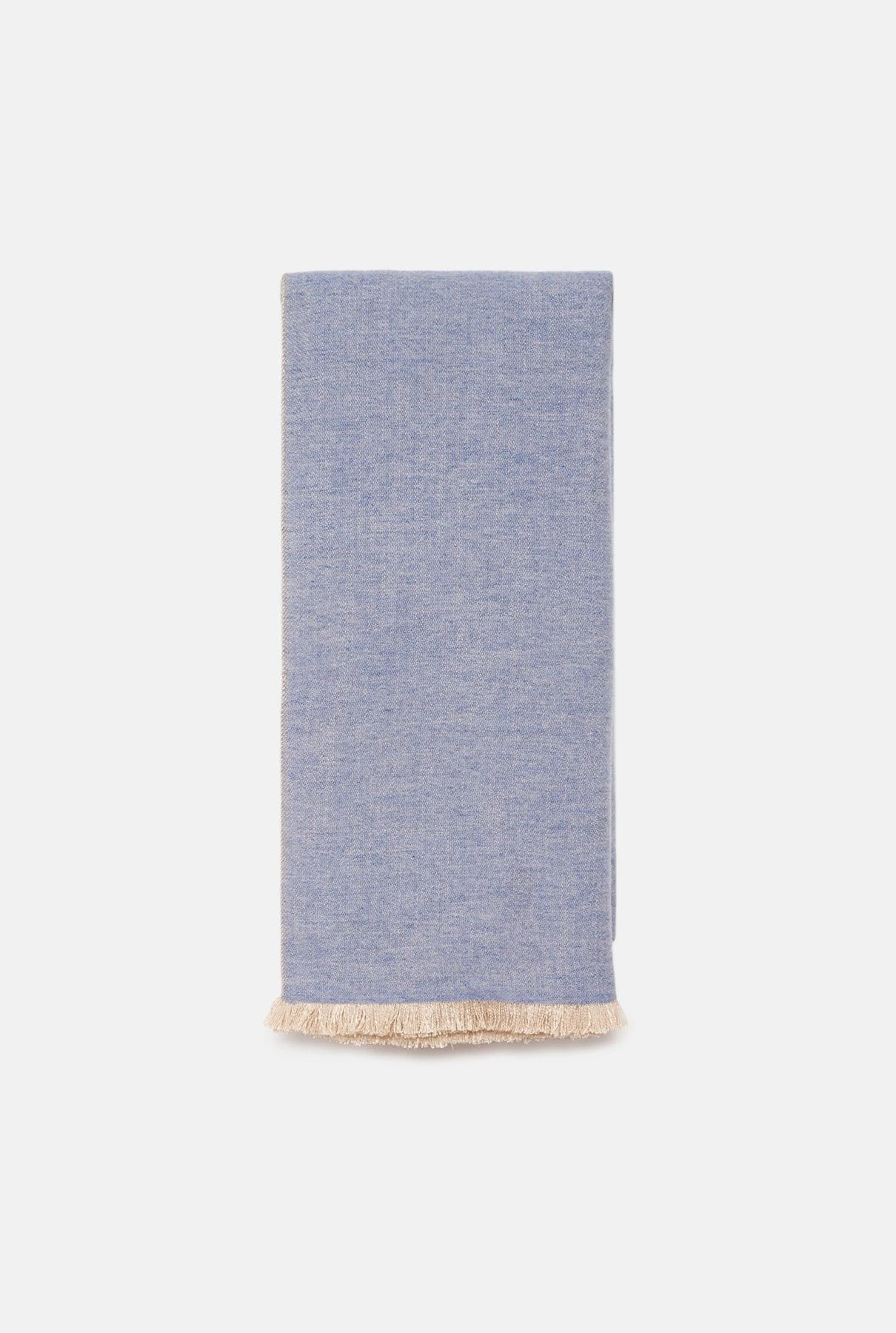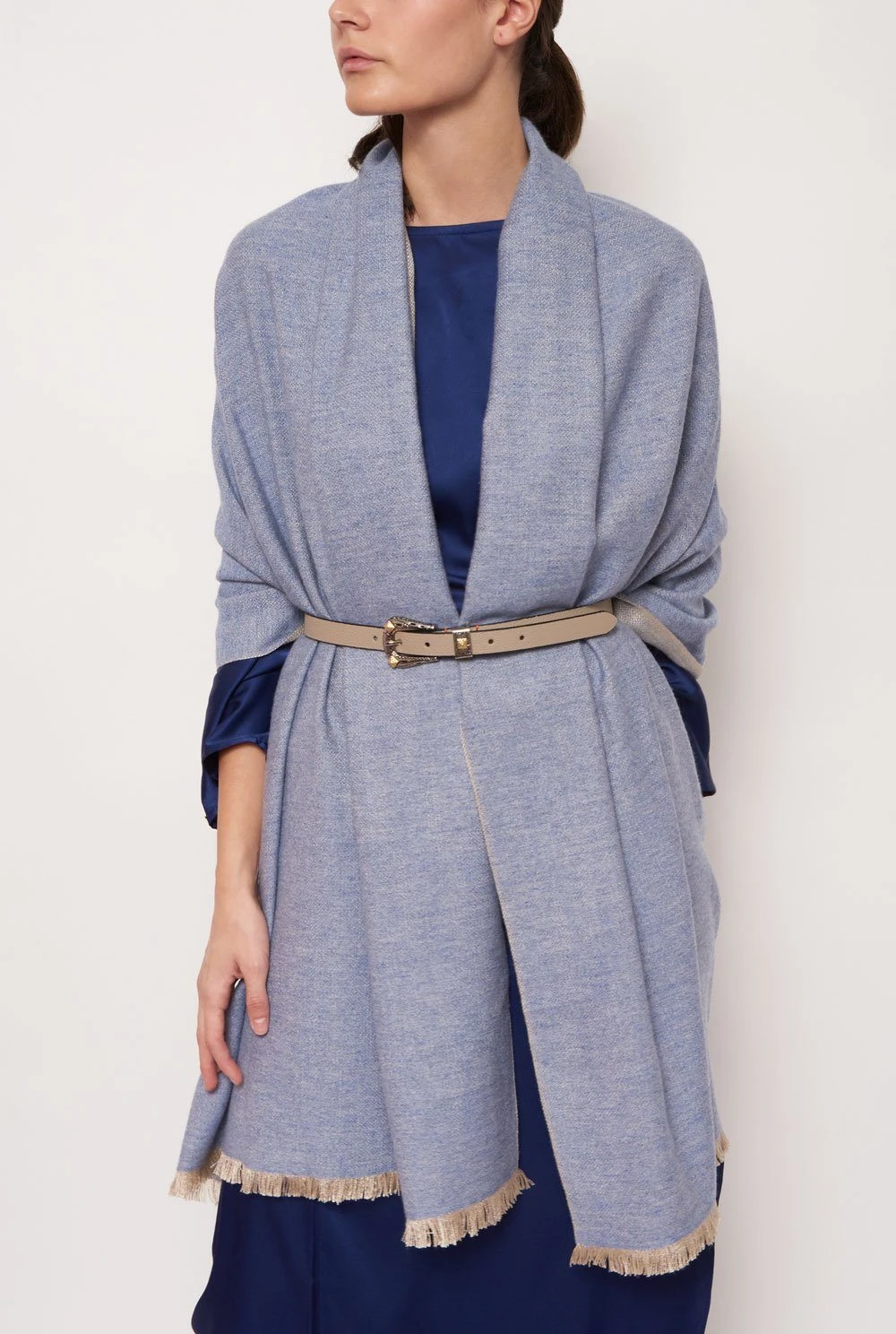 Cashmere and silk shawl. For its manufacture, we combine cashmere of the highest quality with different types of silk. It comes in light blue combined with beige. Designed by Victoria de Talhora