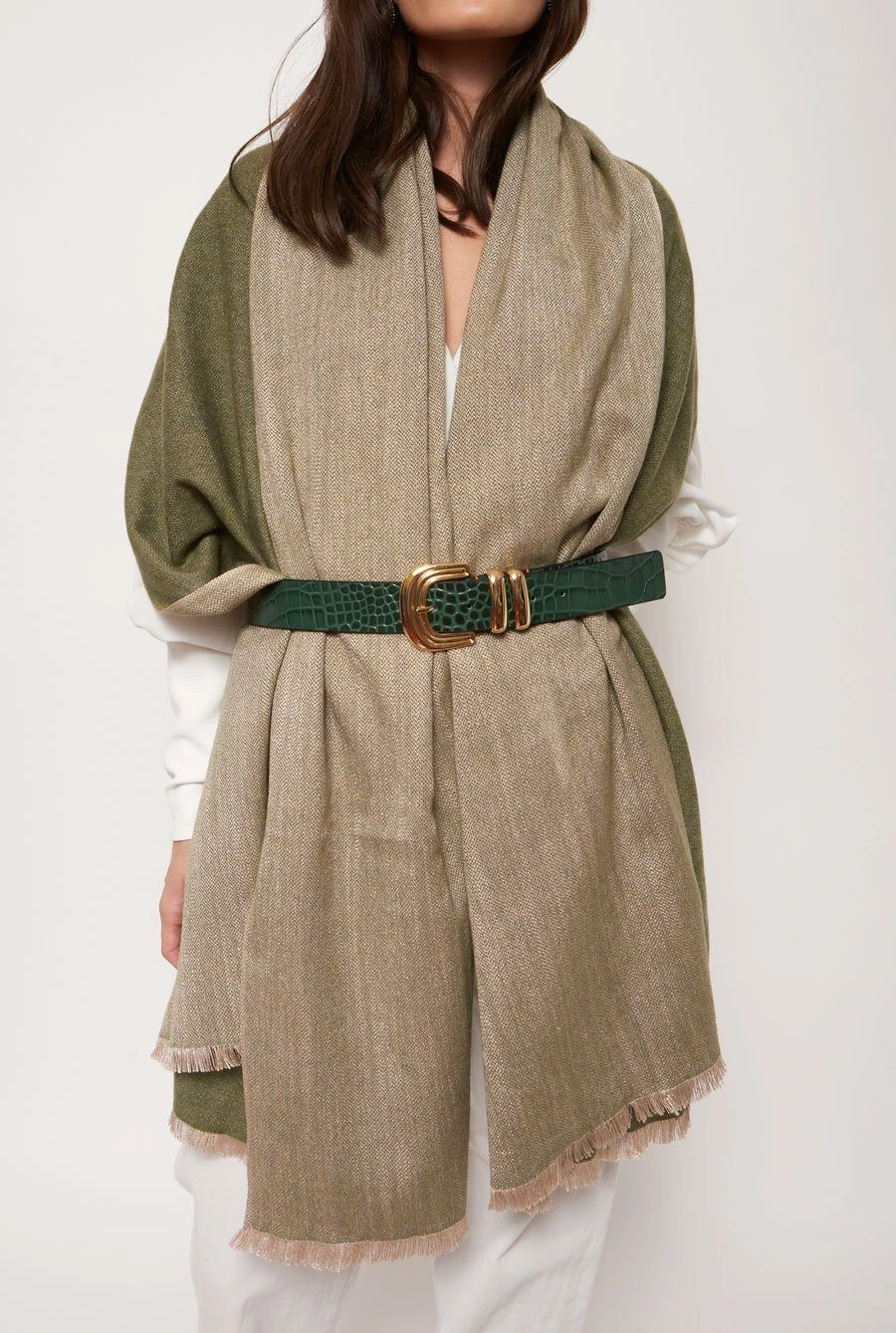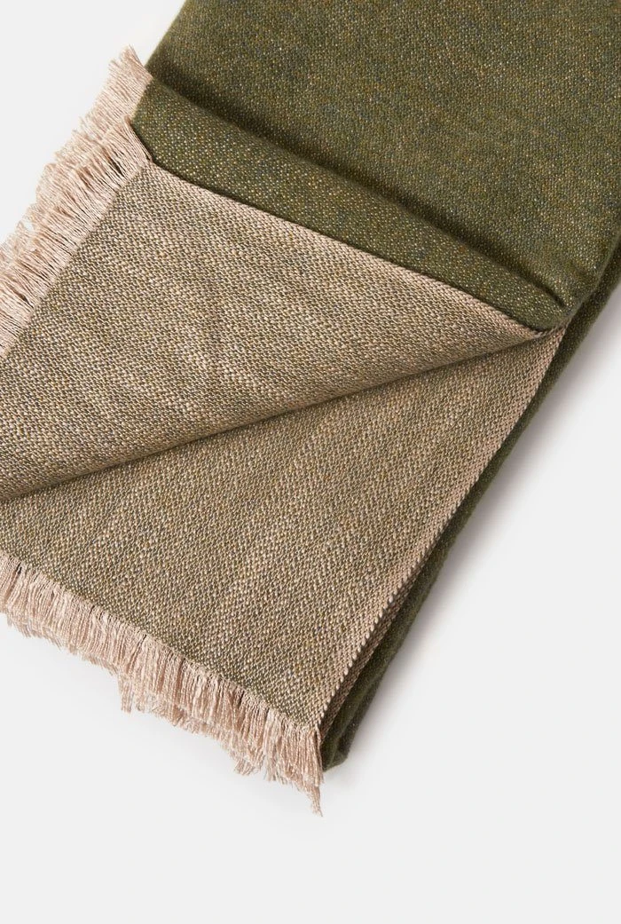 Cashmere and silk shawl. For its manufacture, we combine cashmere of the highest quality with different types of silk. It comes in olive green combined with beige. Designed by Victoria de Talhora