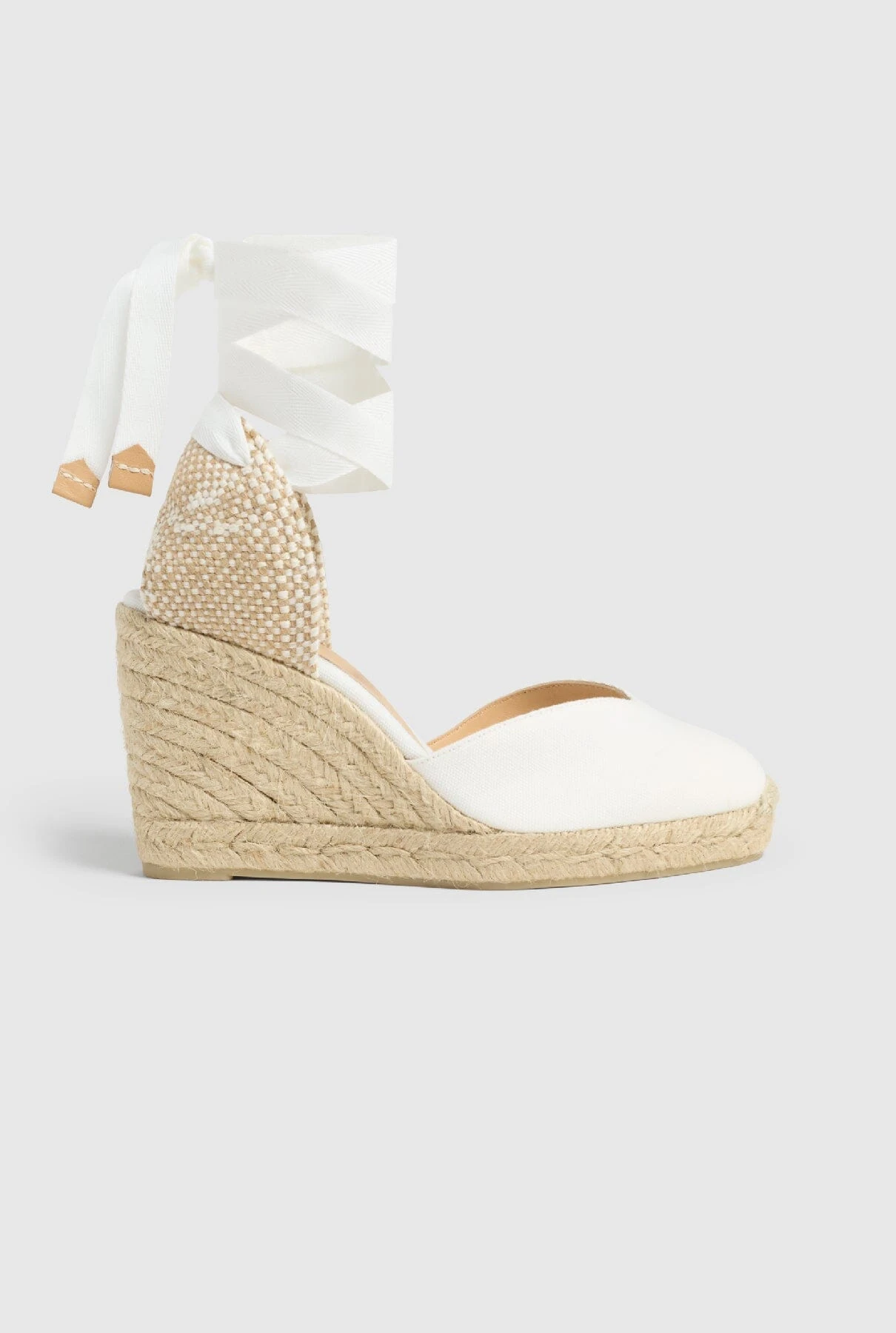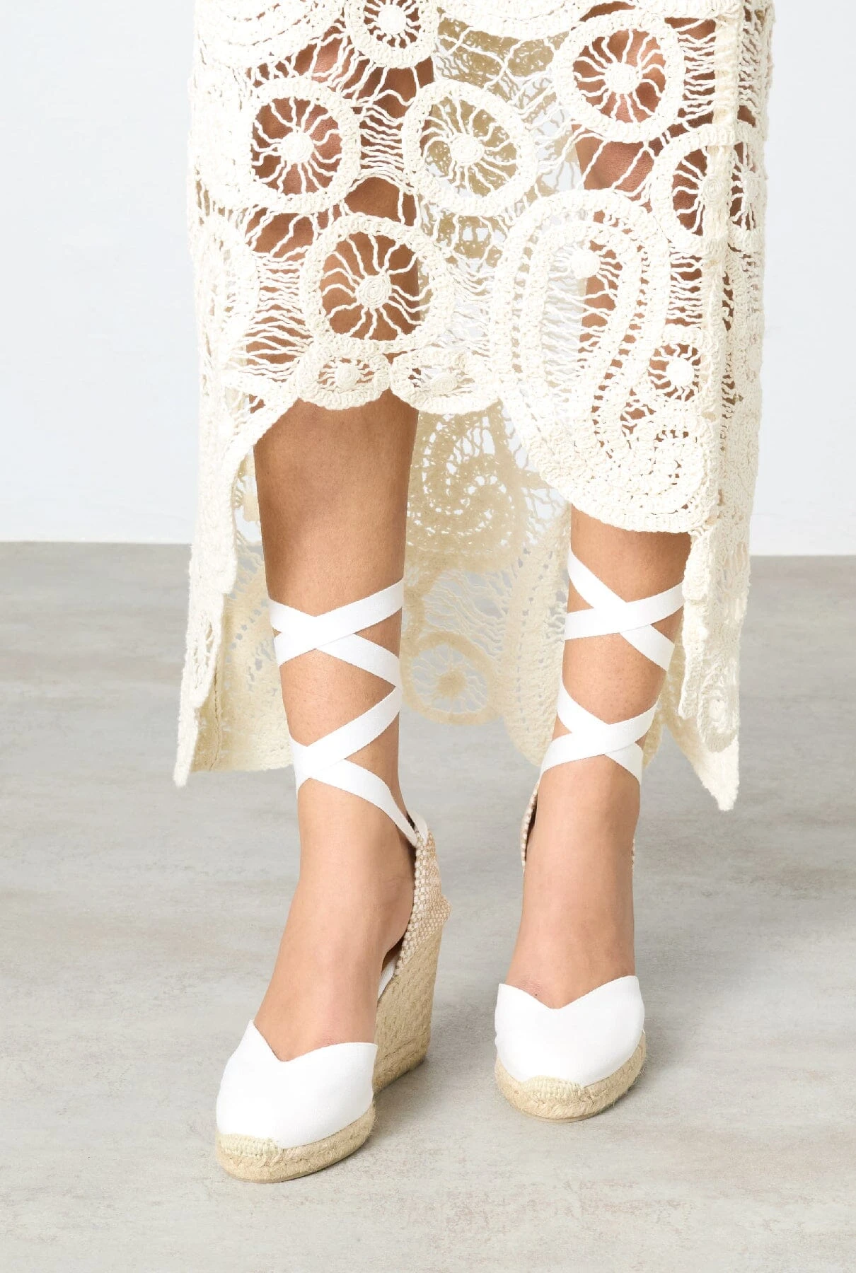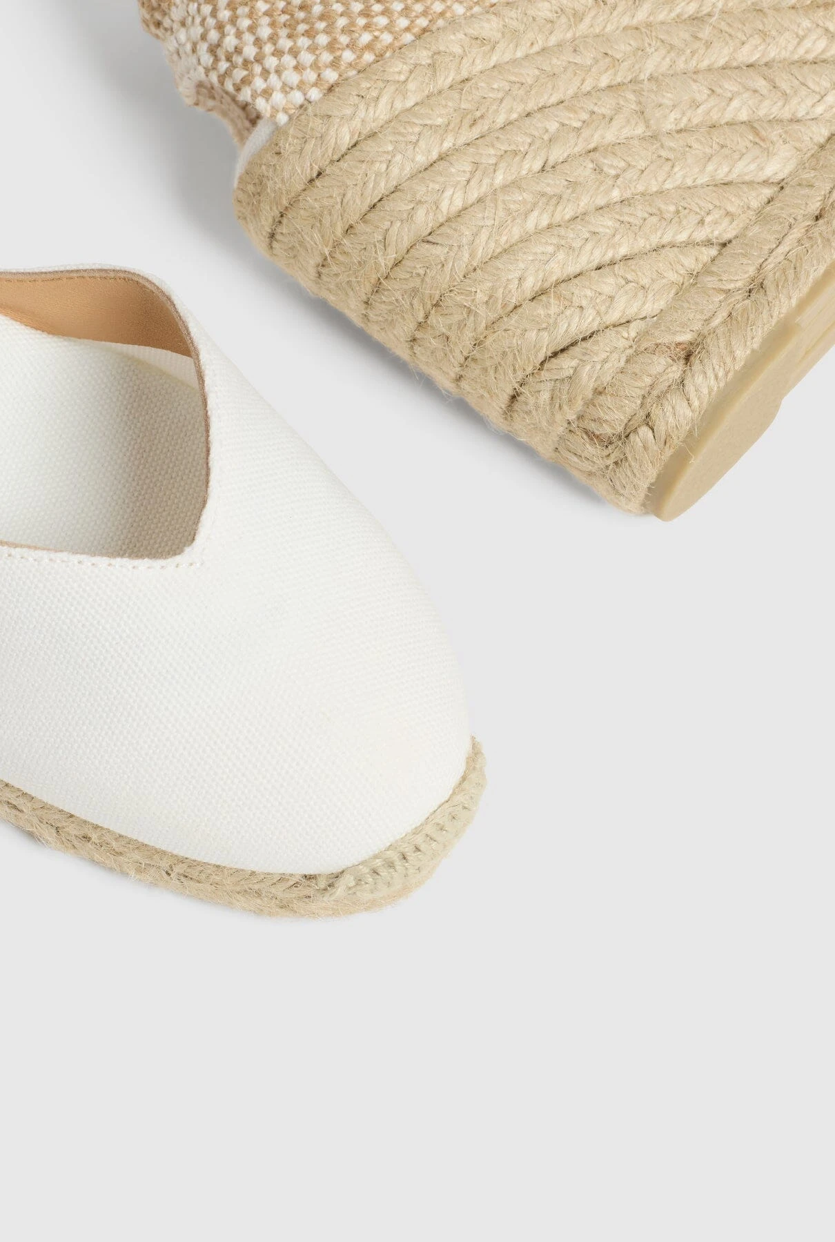The Chiara espadrilles, made in Spain with organic cotton, feature a V front, round closed toe, tie close, 9 cm wedge and vulcanised-rubber sole.