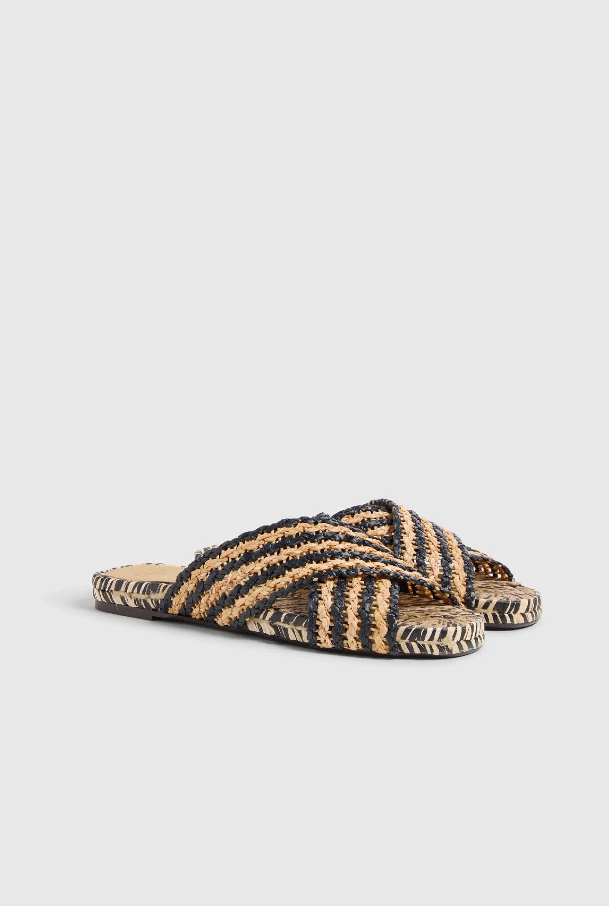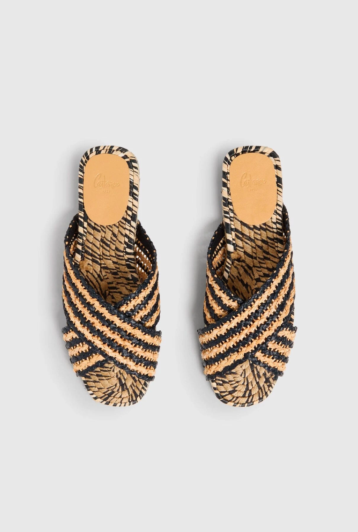 LAS SANDALIAS PAT EMANAN ESTILO ÚNICO CON SU DISEÑO BICOLOR EN RAFIA NATURAL. CONFECCIONADAS ARTESANALMENTE EN ESPAÑA, LAS SANDALIAS PAT PRESENTAN PUNTERA ABIERTA REDONDEADA Y SUELA PLANA DE CUEROLITE. CARACTERÍSTICAS COLOR: NEGRO/TOSTADO COMPOSICIÓN INTERIOR: 100% CUERO OVINO COMPOSICIÓN EXTERIOR: 80% RAFIA VISCOSA, 20% POLIÉSTER MATERIAL SUELA: CUEROLITE ALTURA TOTAL: 2CM PLATAFORMA/ALTURA: 2CM ALTURA CUÑA/TACÓN: 0CM SKU: 023466-4290