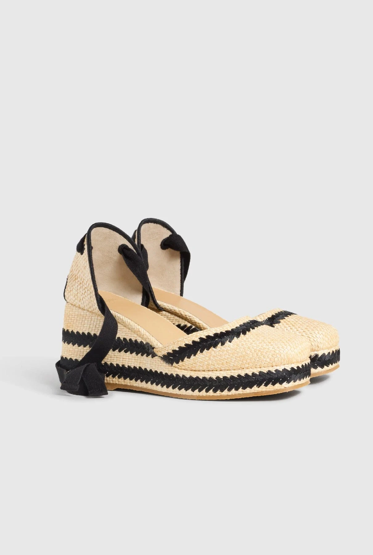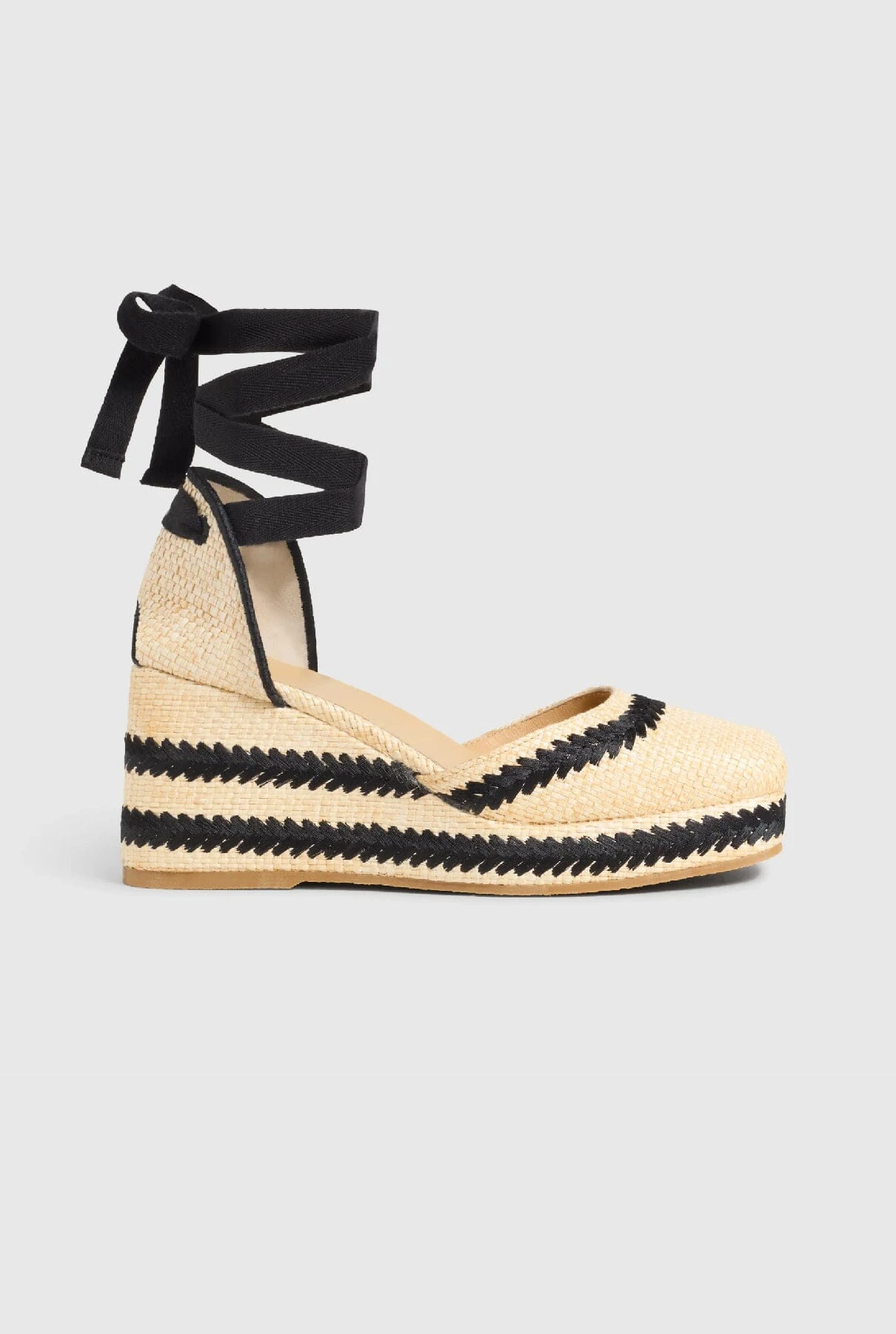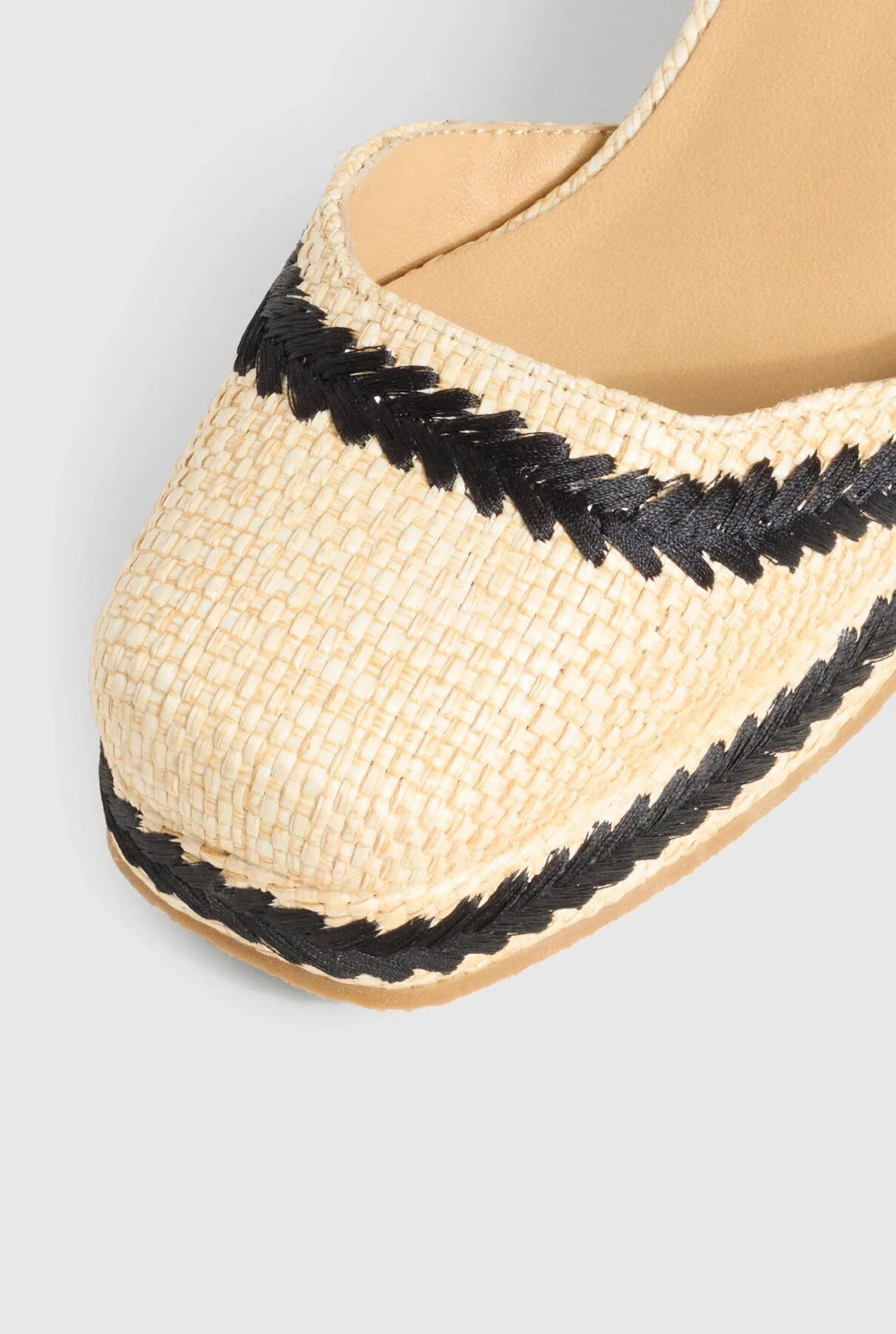 EL CALZADO QUE MARCARÁ TENDENCIA ESTA TEMPORADA POR EL BORDADO DE ALGODÓN SOBRE RAFIA. CONFECCIONADAS ARTESANALMENTE EN ESPAÑA, EL CALZADO TESSA PRESENTA PUNTERA CERRADA CUADRADA, CIERRE MEDIANTE LAZADA Y ALTURA DE 8CM. CARACTERÍSTICAS COLOR: NATURAL/NEGRO COMPOSICIÓN INTERIOR: COMPOSICIÓN EXTERIOR: 80% NYLON, 20% ALGODÓN 100% CUERO OVINO MATERIAL SUELA: POLIURETANO ALTURA TOTAL: 8CM PLATAFORMA/ALTURA: 2CM ALTURA CUÑA/TACÓN: 6CM SKU: 023477-4091