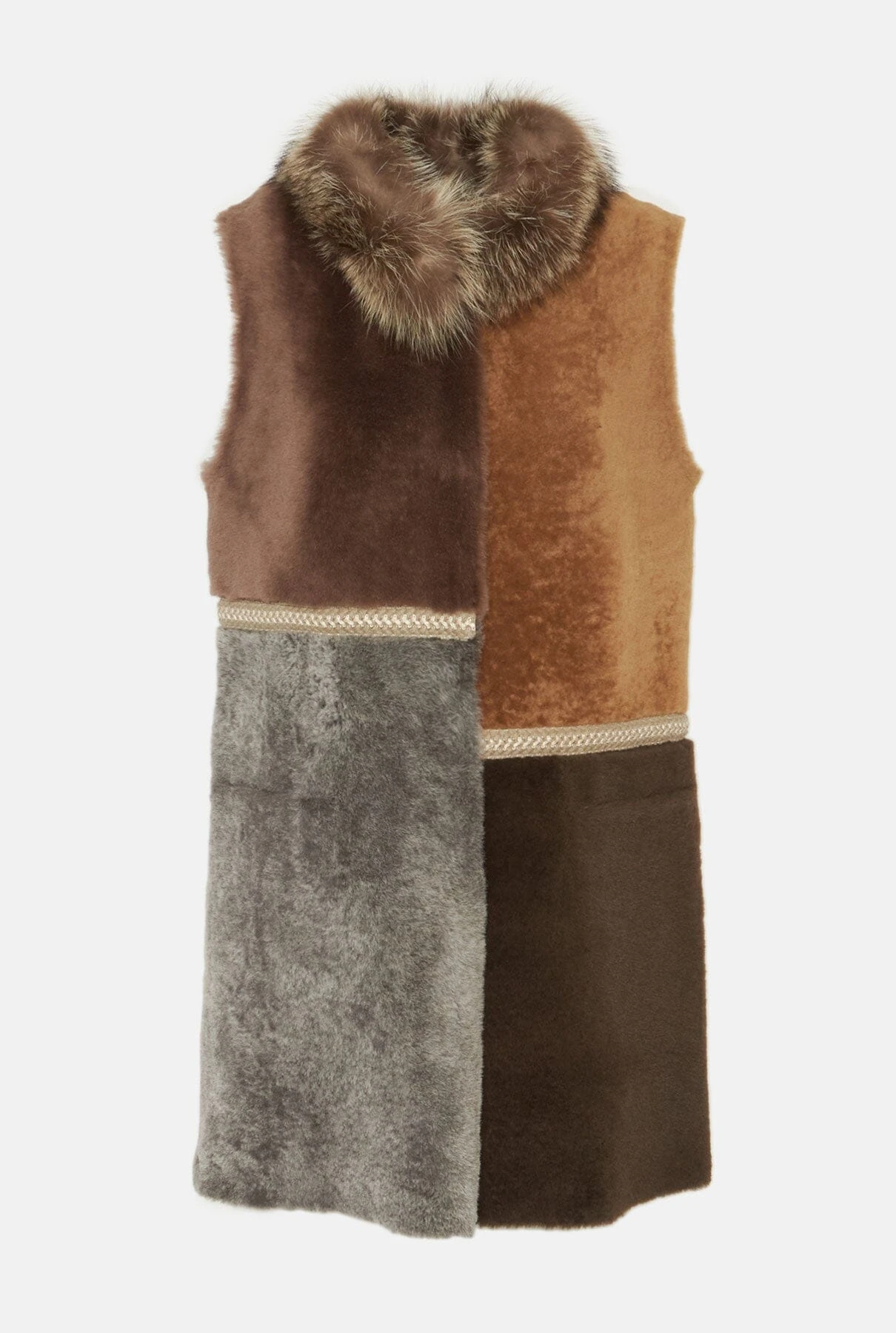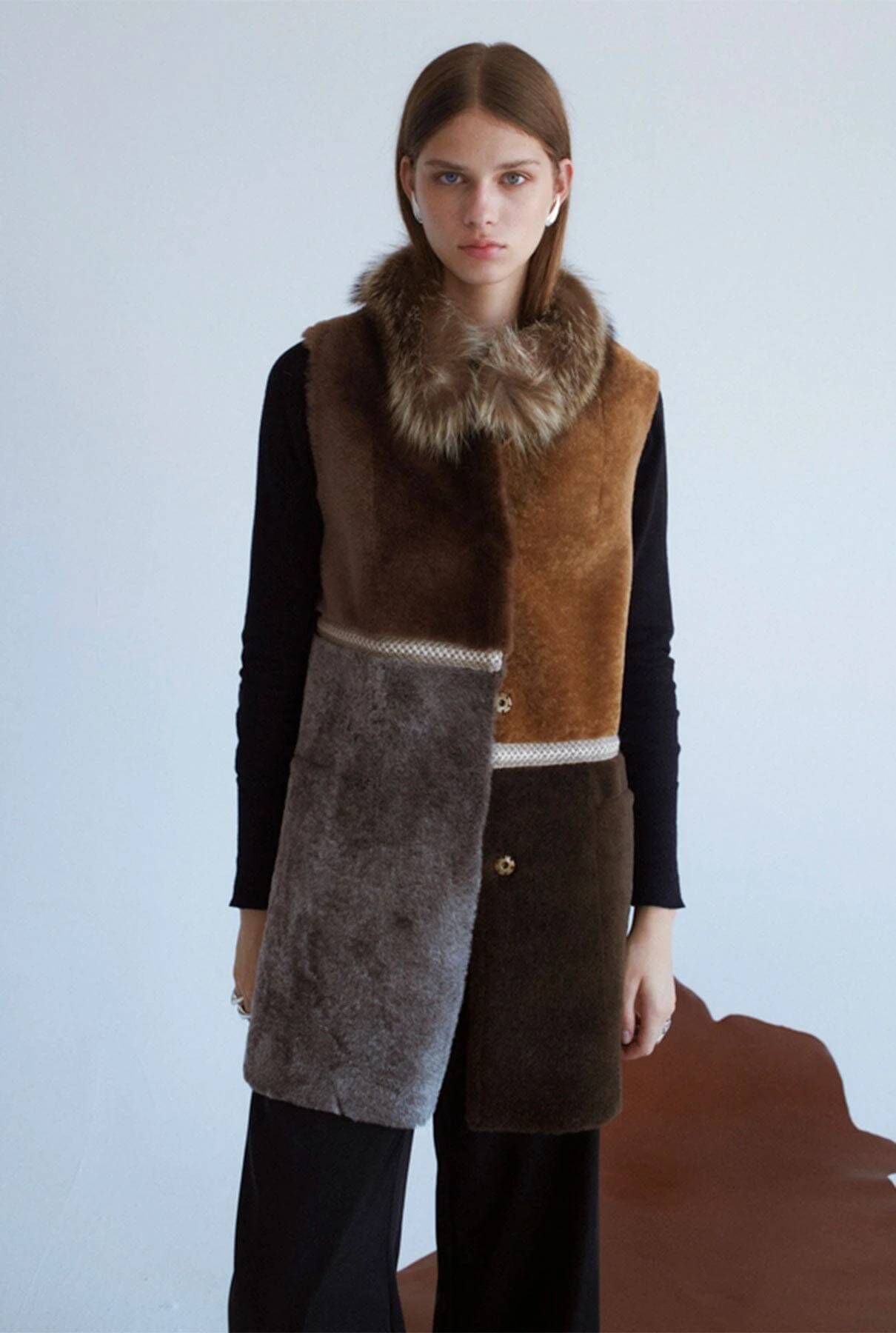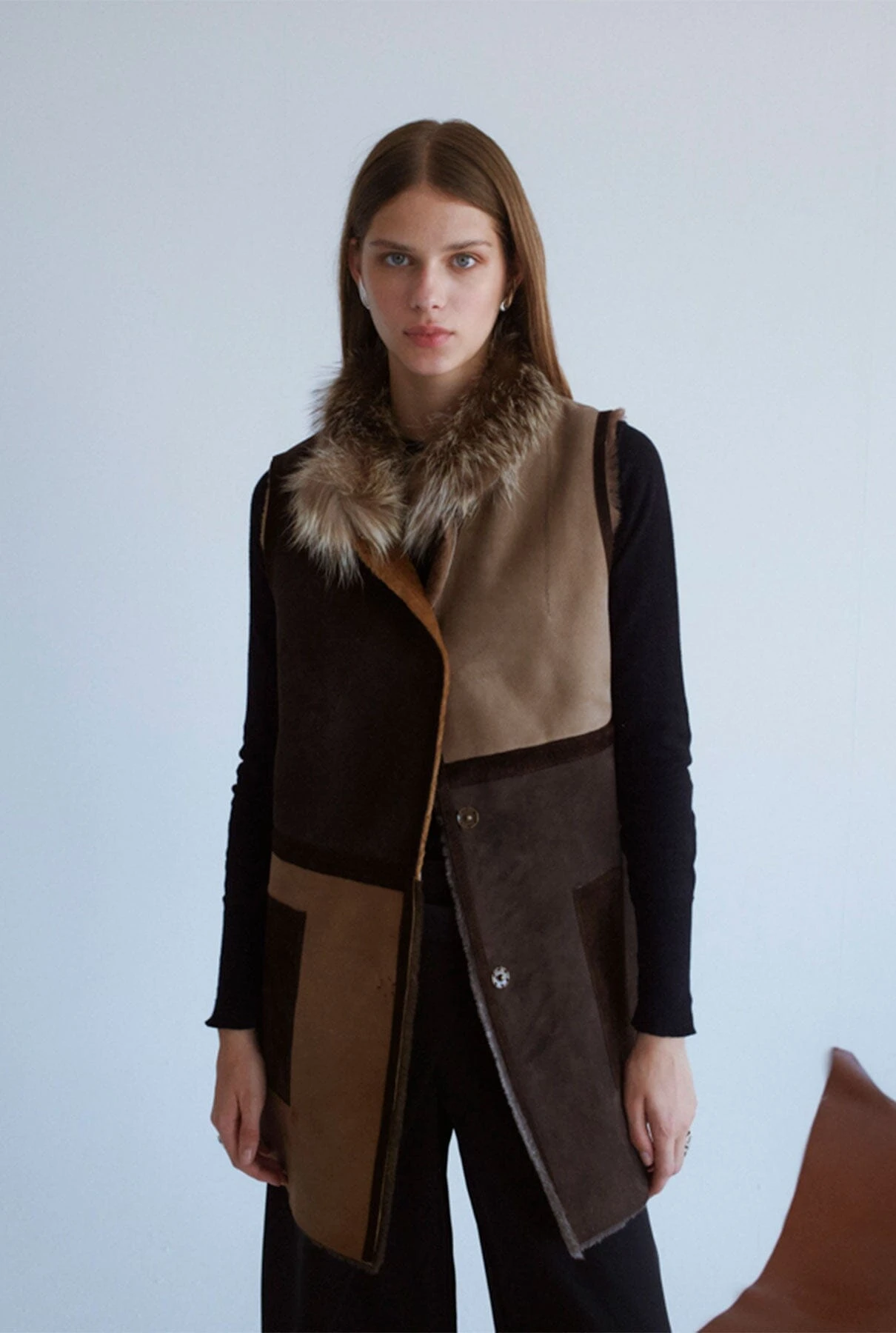 Miguel Marinero waistcoat in reversible merino lamb in various colours and different finishes. Reversible napped and suede interior in brown tones, separation of the tones by a strip of astrakan in camel colour. Versatility to combine with any look of your wardrobe, because of the easily combinable colours and because it is reversible, with a napped and suede finish and another in soft and warm hair. Designed to be worn inside or outside a coat, casual and relaxed style. Fastens with tone-on-tone lined press studs.
