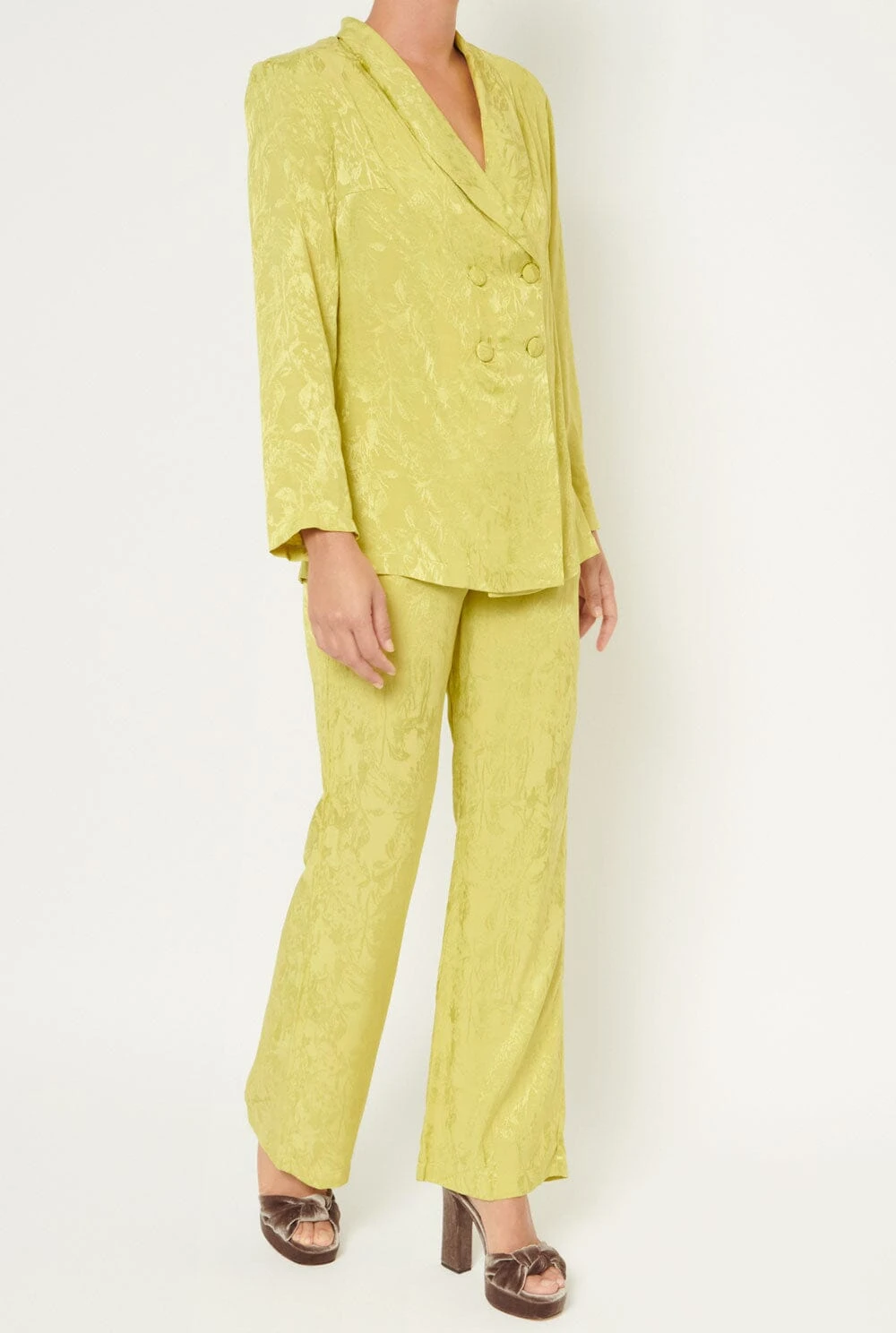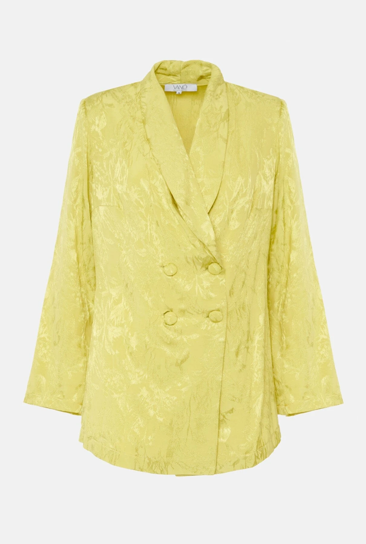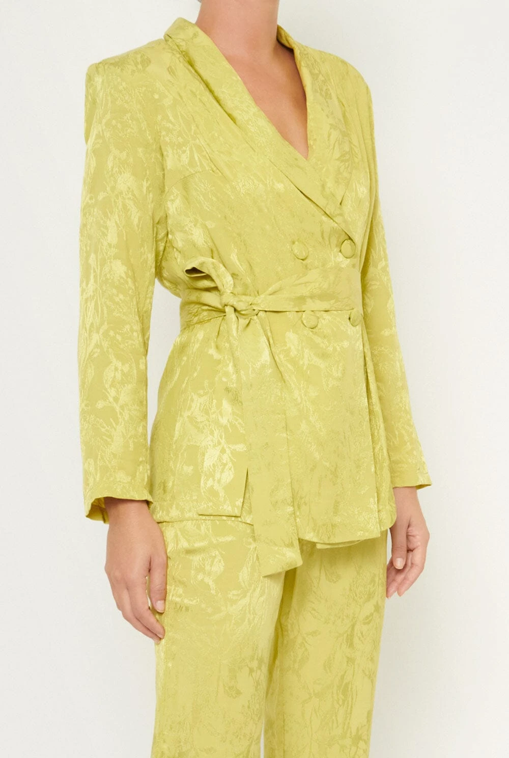 Blazer-type jacket made of lime green fabric. Tuxedo-style lapels and four covered summary closure. Straight long sleeve. Includes belt of the same fabric to adjust the waist. Wash at 30 degrees, iron at low temperature or with a tissue on it, do not tumble dry, do not dry clean and do not use bleach