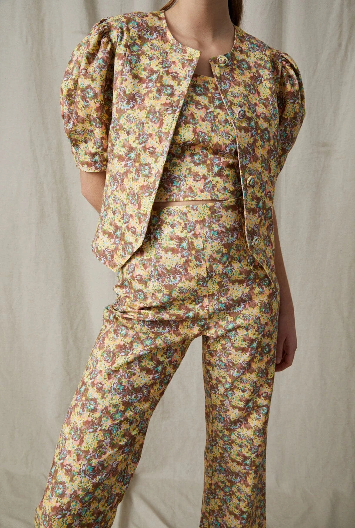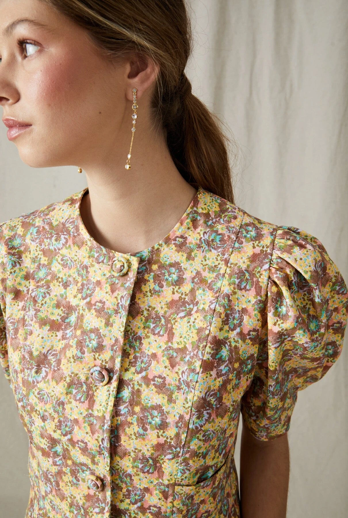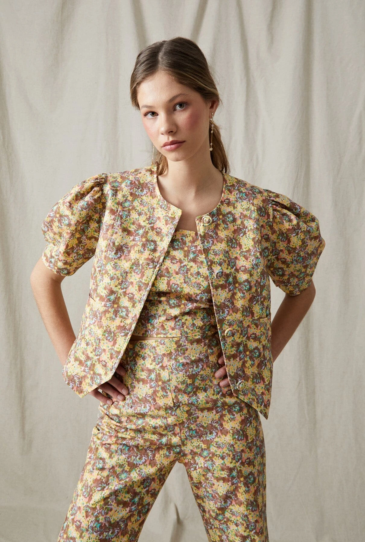 Semi-fitted jacket, made from 100% cotton fabric. It has a round neck, voluminous shoulder and gathered sleeves with elbow length. The fastening is made up of three covered summarys.