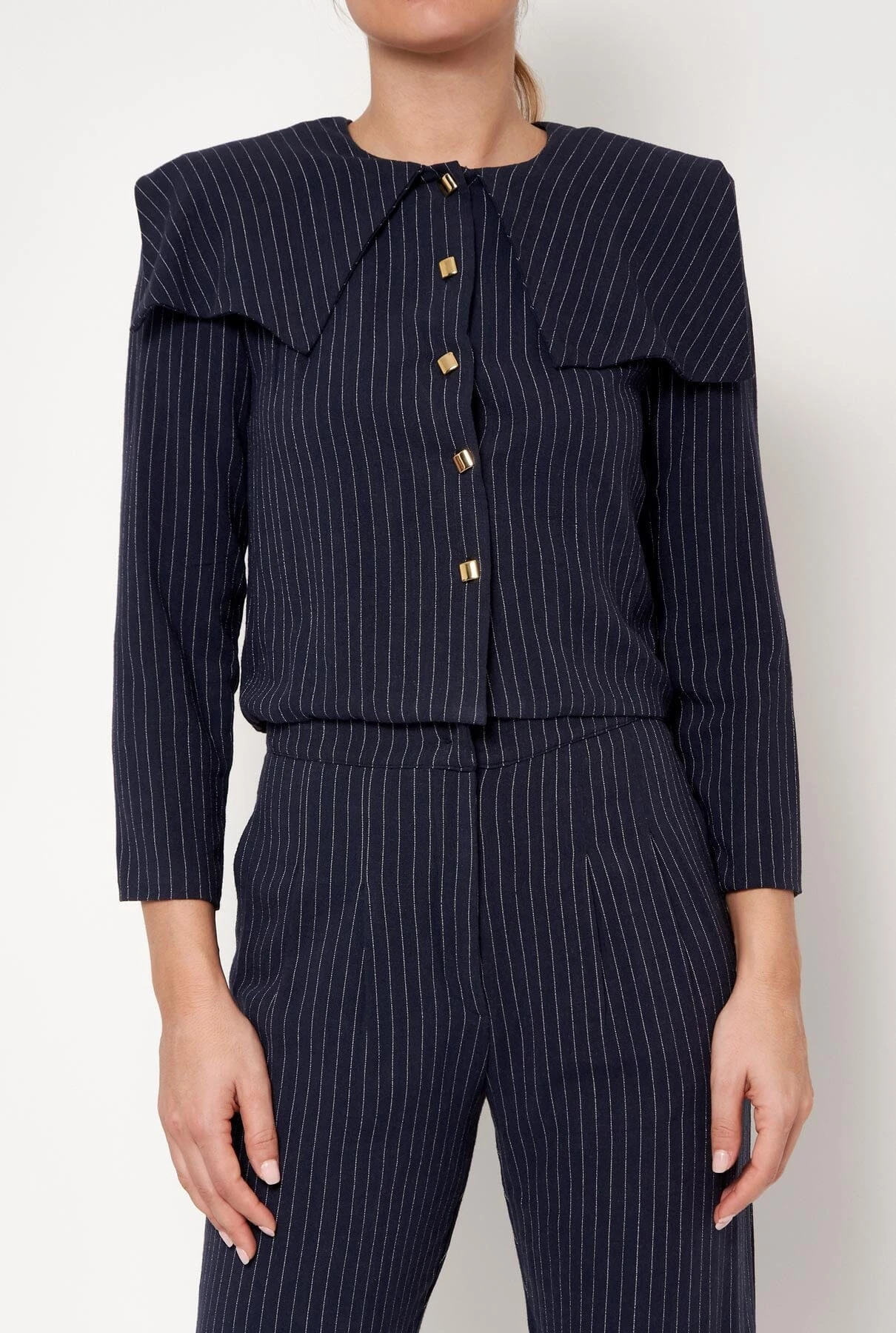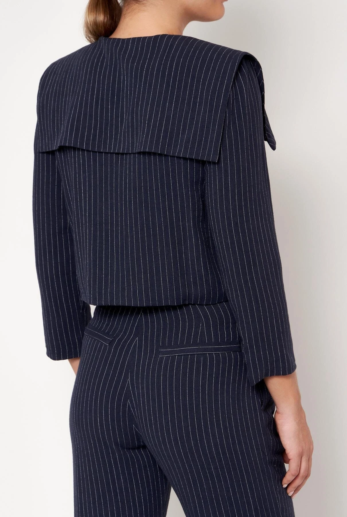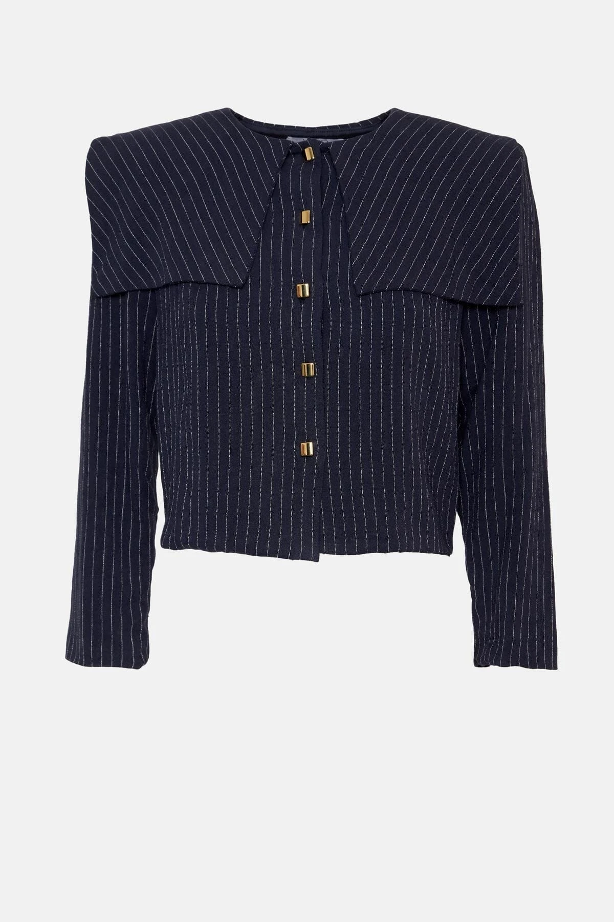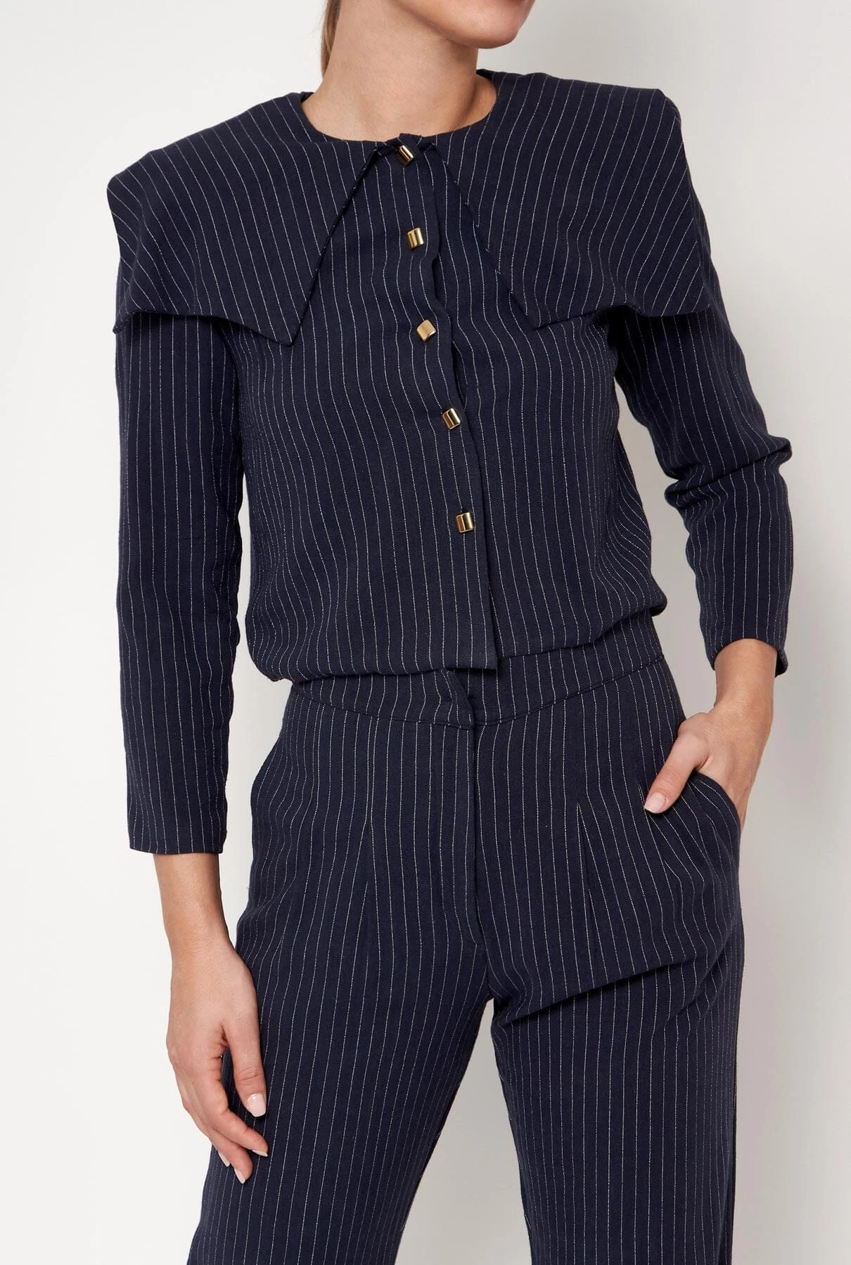 Lined jacket in beige pinstripe fabric with navy blue background. Rectangular surcollar, shoulder pads and golden summary fastening. Straight long sleeves.