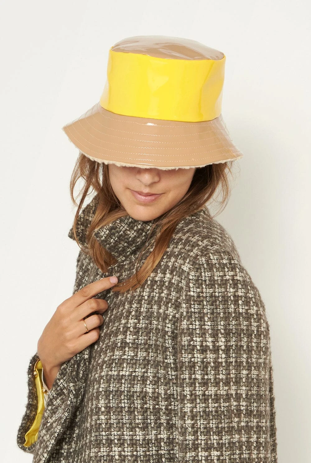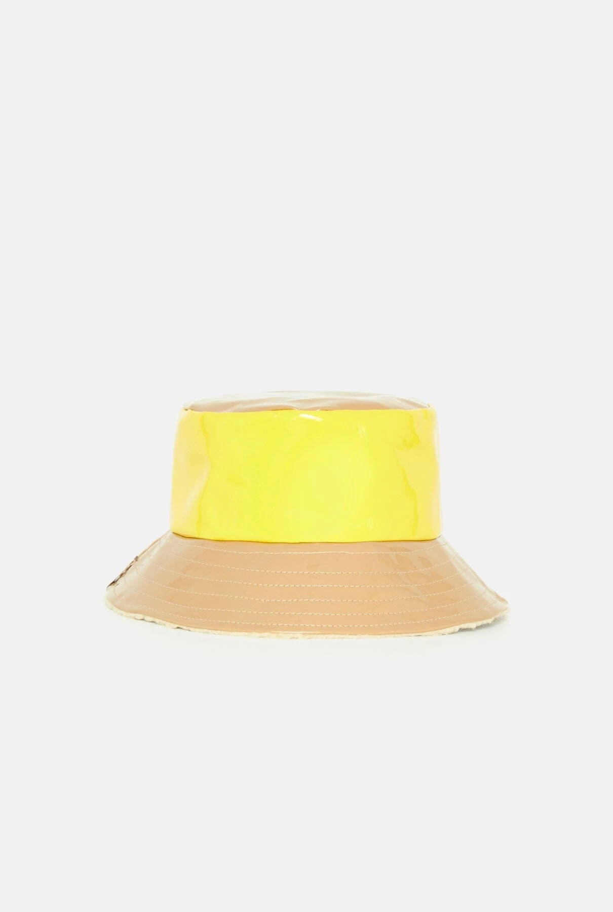 The Charolito hat is made with patent leather in yellow and latte colour. Its reversible. Inside it has shearling lining. Perfect for autumn-winter days and also for a total rainy look. Cup height 9cm, brim size 8cm.