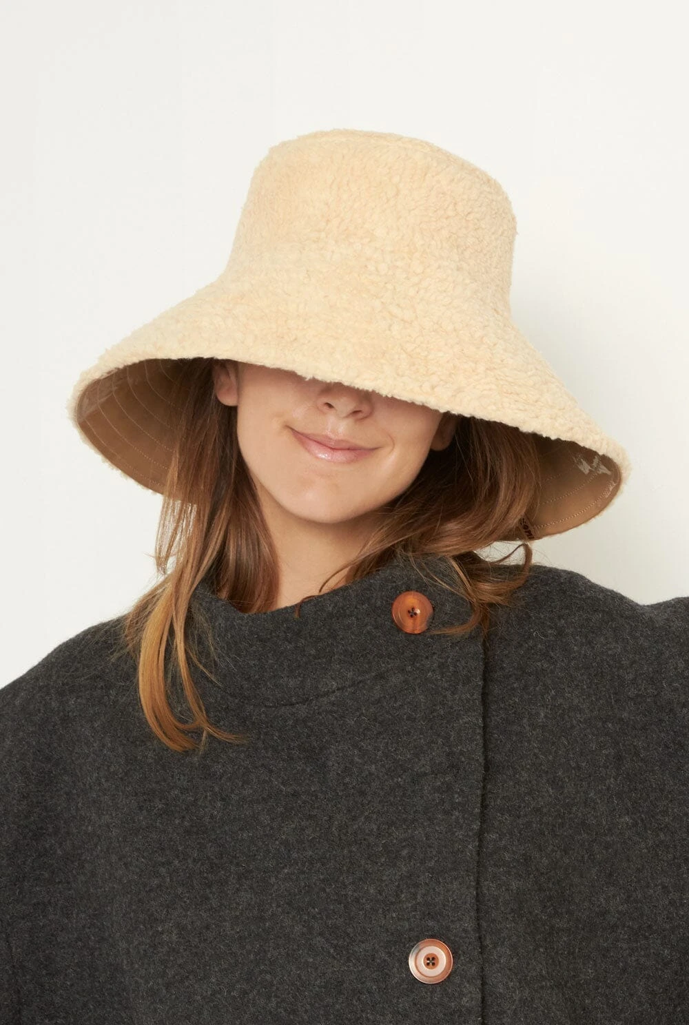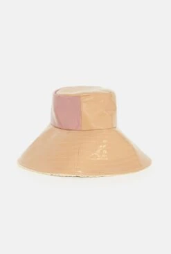 The Charolito L hat is made with patent leather in latte and nude. Its reversible. Inside it has shearling lining. Perfect for autumn-winter days and also for a total rainy look.Cup height 9cm, brim size 14cm.