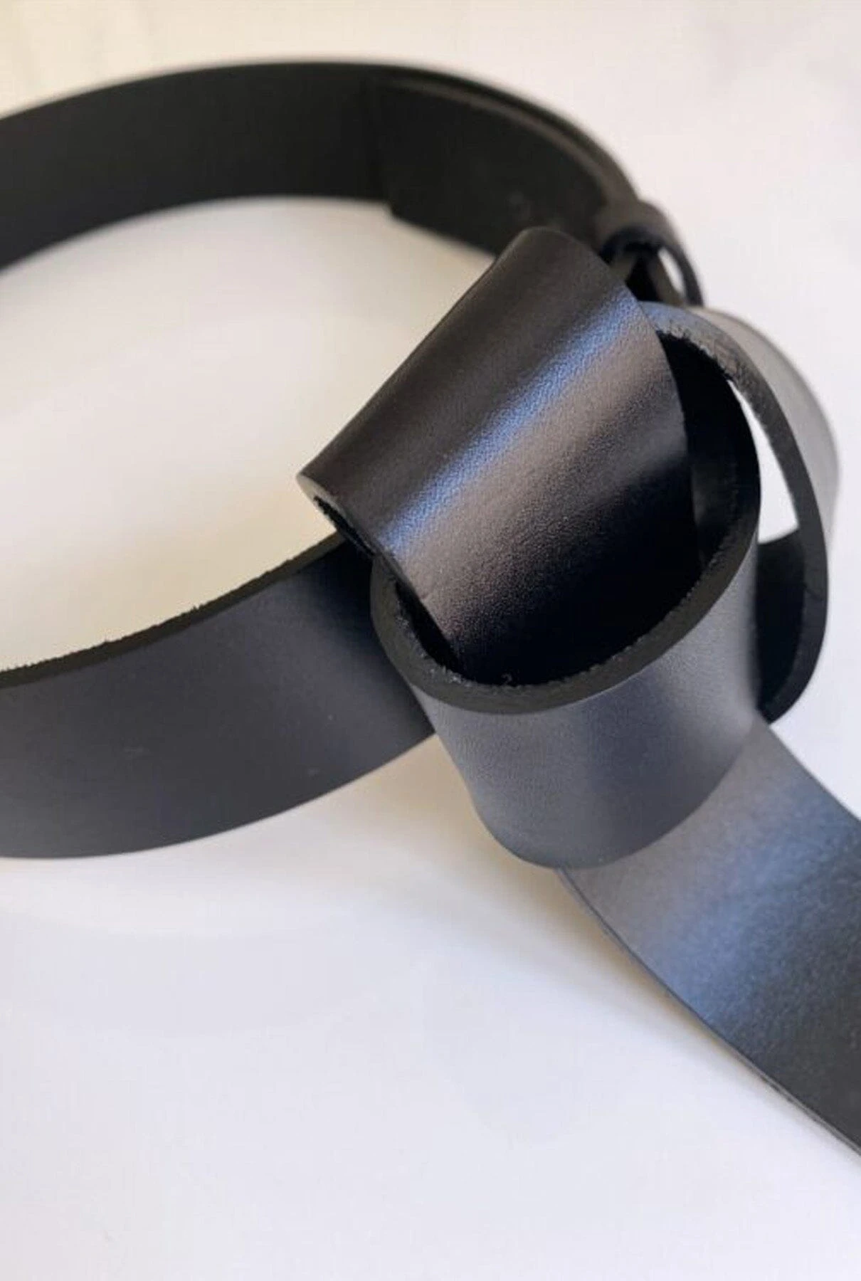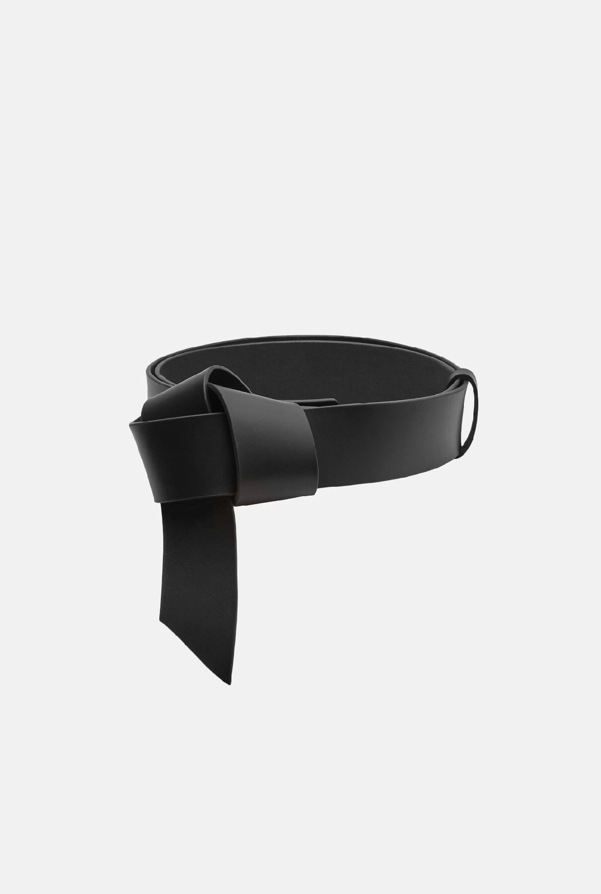 Adjustable Belt made of black colored cowhide leather with original knot detail in the center. The knot is already assembled and the belt closes easily through a metal piece. The purchase includes an organic cotton bag.