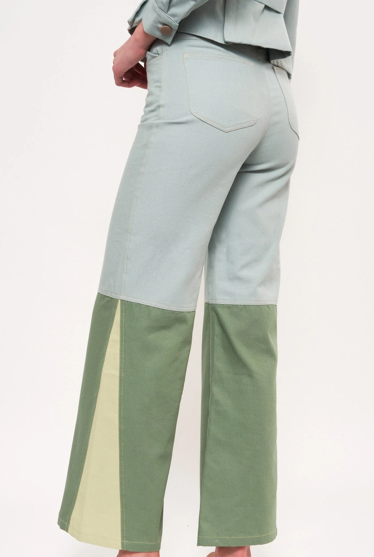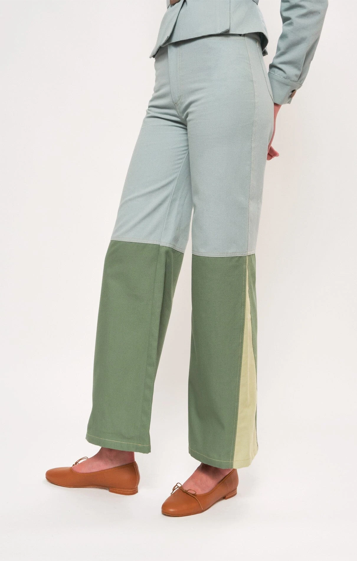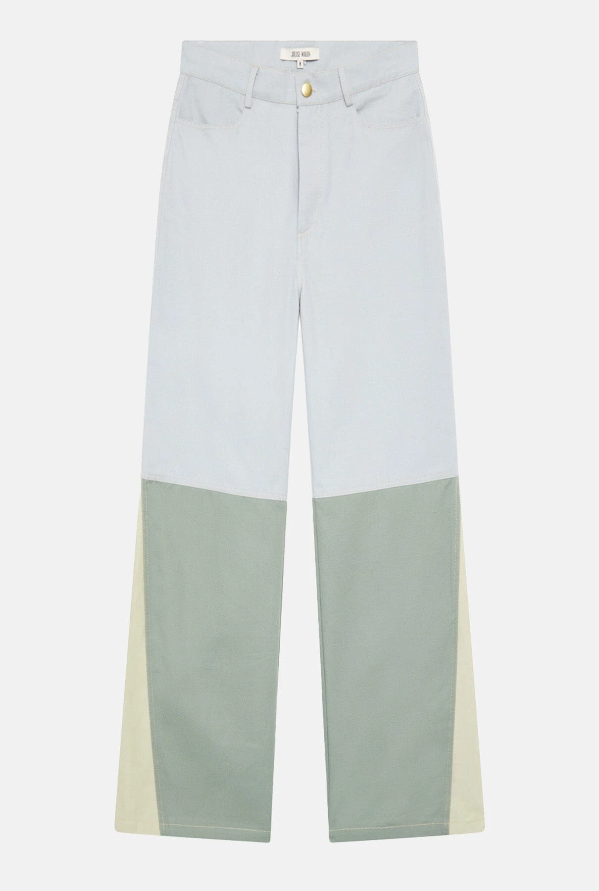 Our iconic Coro trousers with denim cut in cotton canvas combining 3 tones, one on the top, one on the bottom and one on the side wedge. In 2 combinations: Browns and Blues.