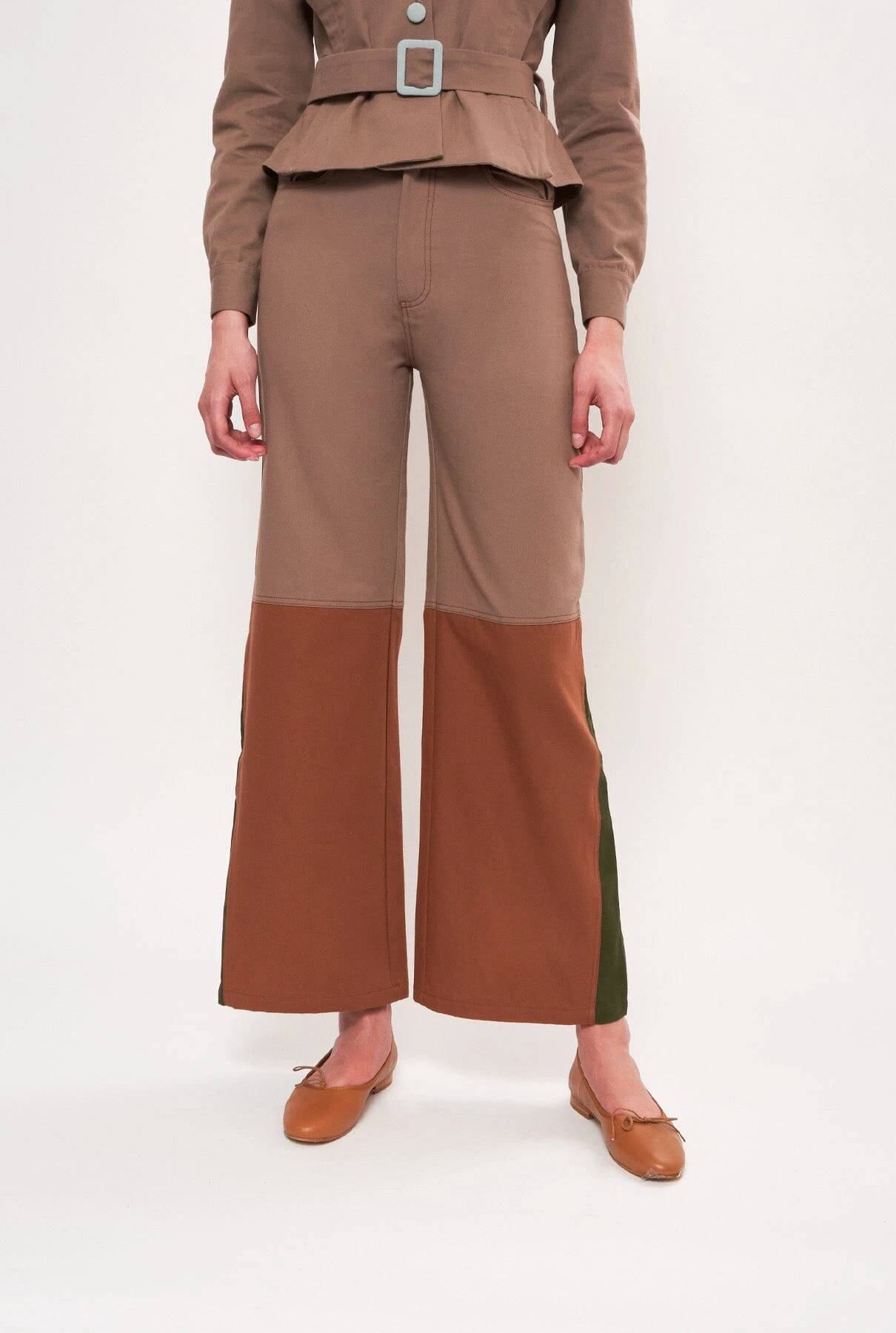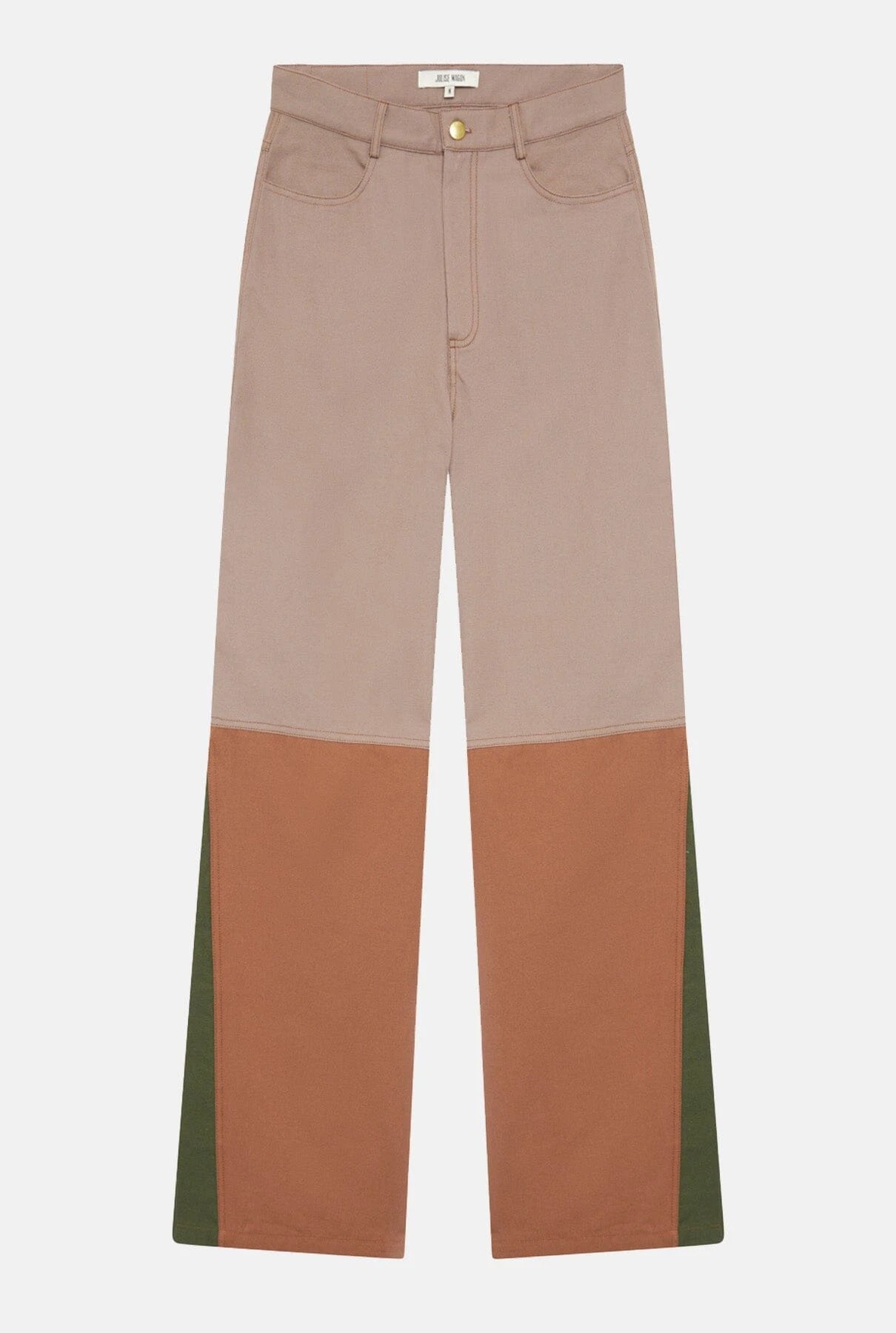 Our iconic Coro trousers with denim cut in cotton canvas combining 3 tones, one on the top, one on the bottom and one on the side wedge. In 2 combinations: Browns and Blues.