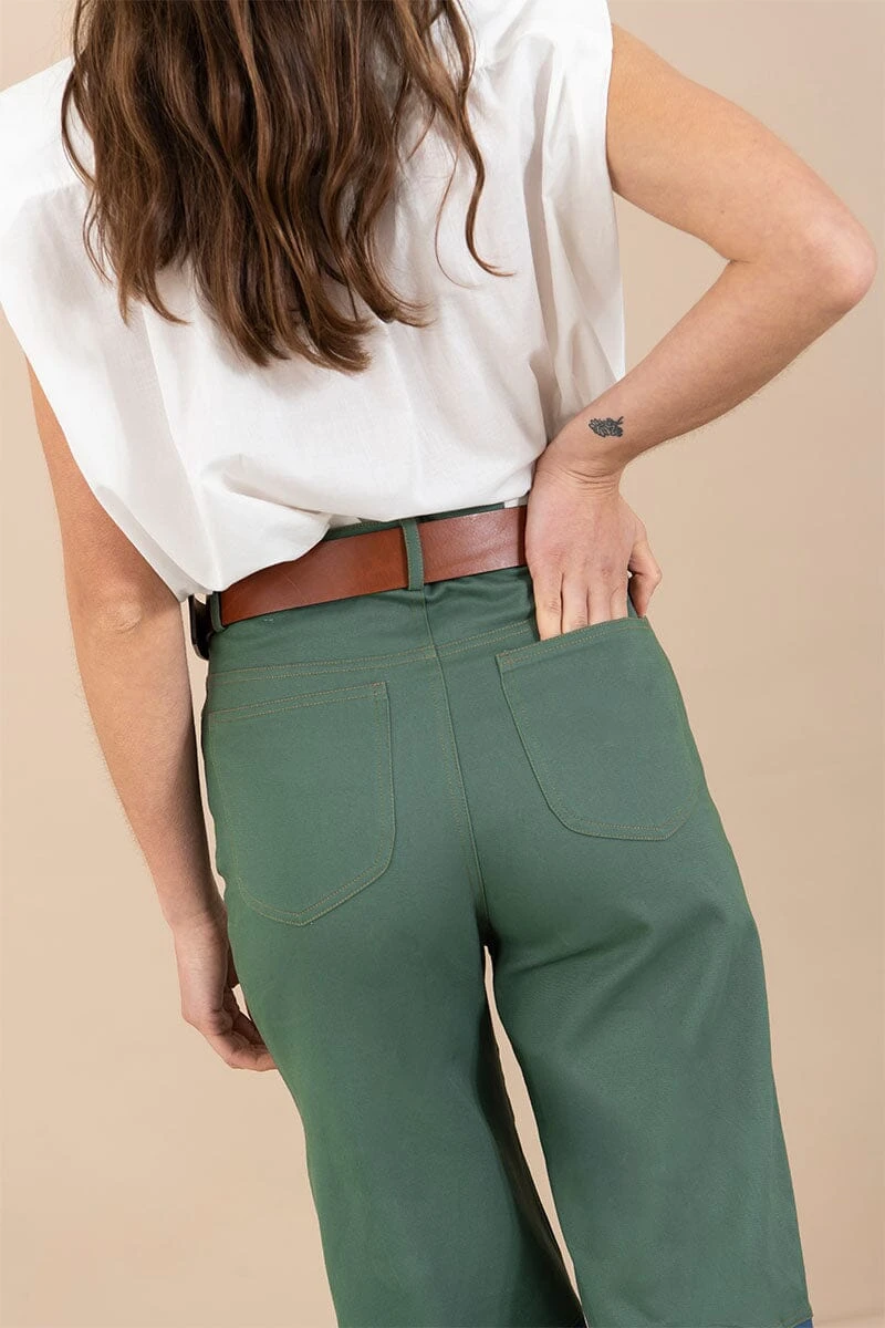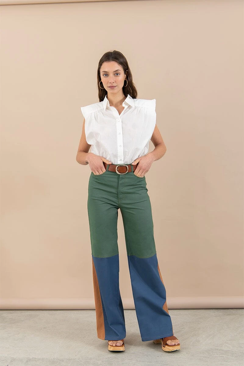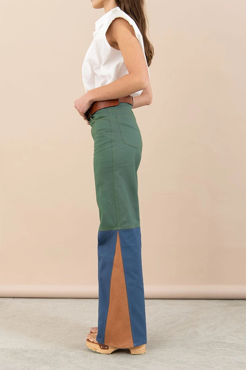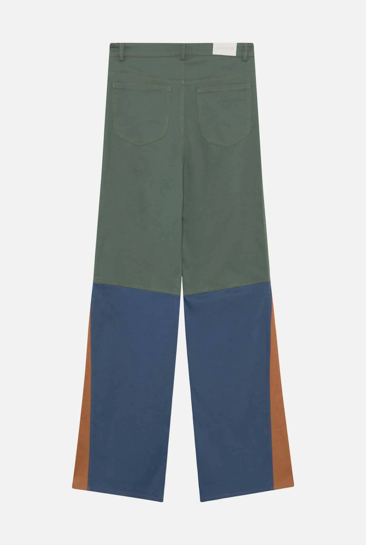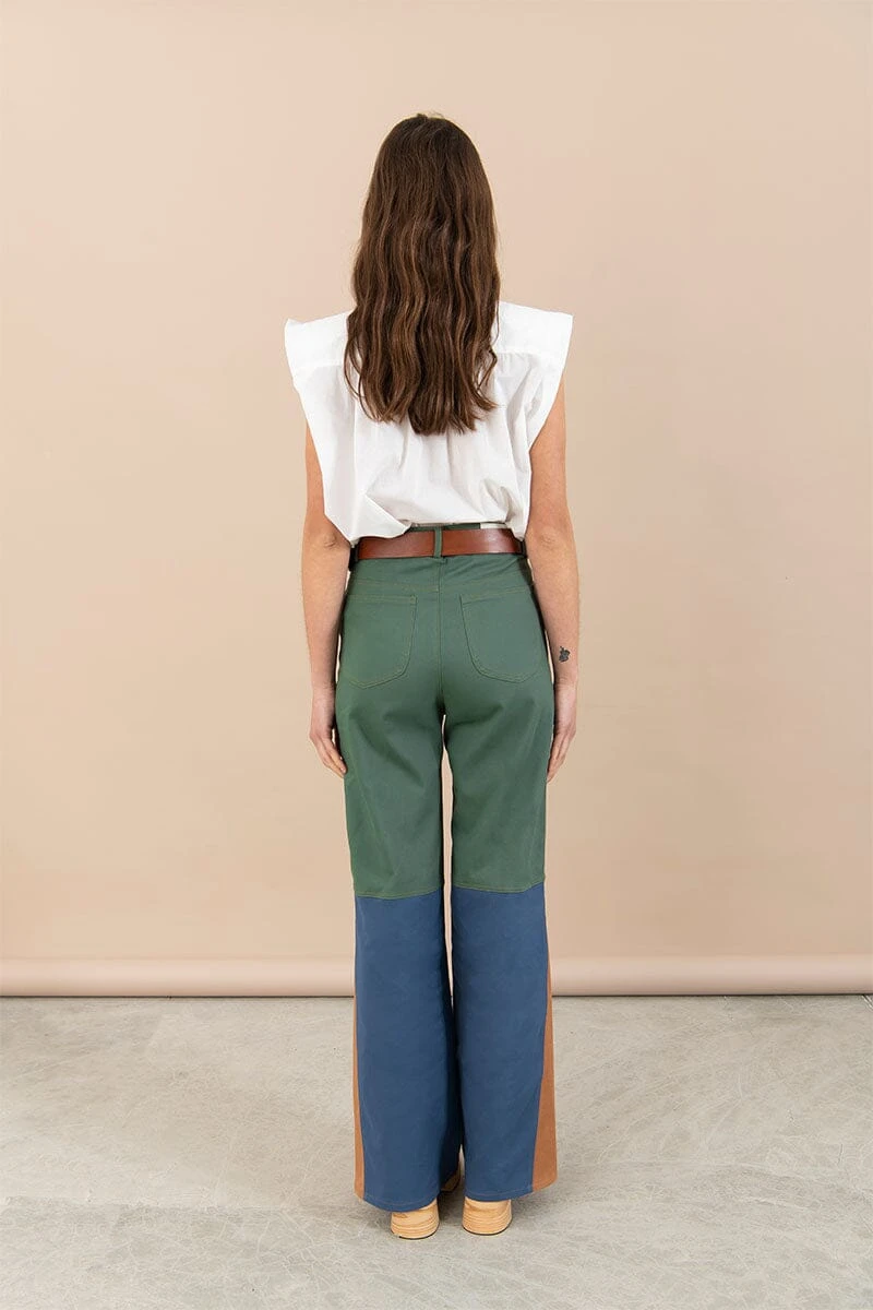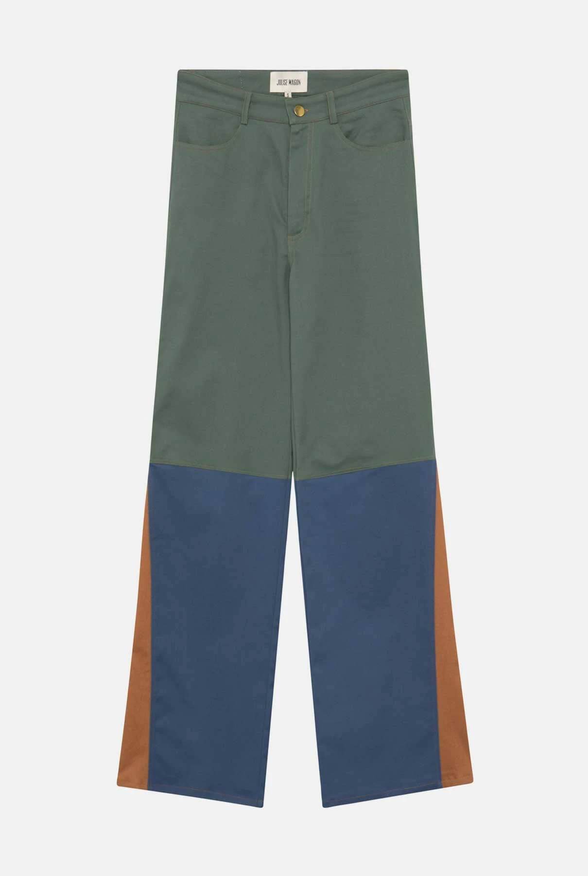 Denim cut trousers in stretch fabric and in 3 tones: green on the top, blue on the bottom and toffee-coloured outer wedge.