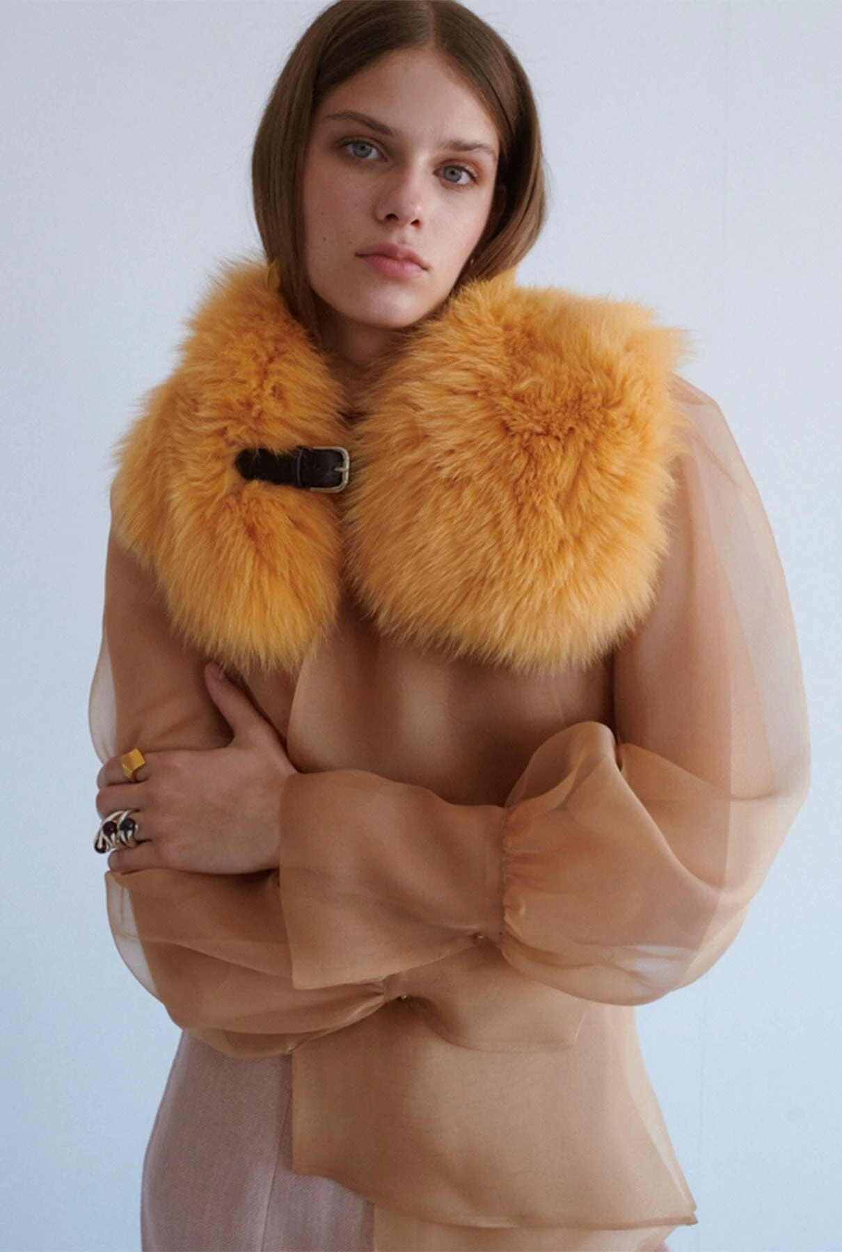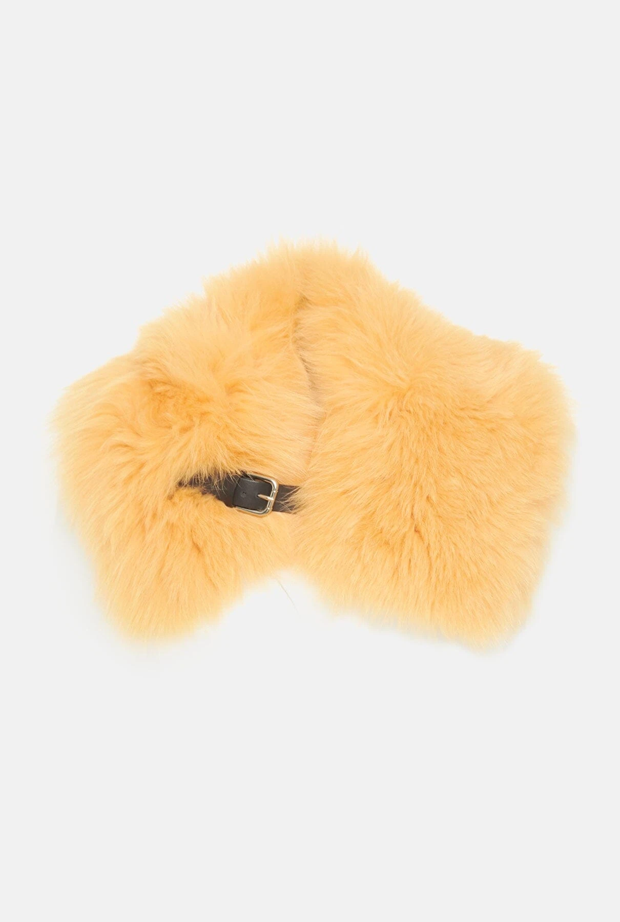 Mustard coloured fur collar, with adjustable black leather fastening. Endless ways to wear it and positions, loose or closed, over an outer garment or a shirt to give a more sophisticated look to all your looks.