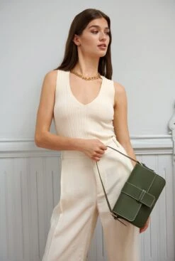 Baguette Bag in coffee brown color with minimalist style and smooth leather design. Includes two adjustable straps, a short one to carry it as a shoulder bag and a long one to carry it cross-body. Semi-rigid construction. Features an interior zipped pocket. The purchase includes an organic cotton bag.