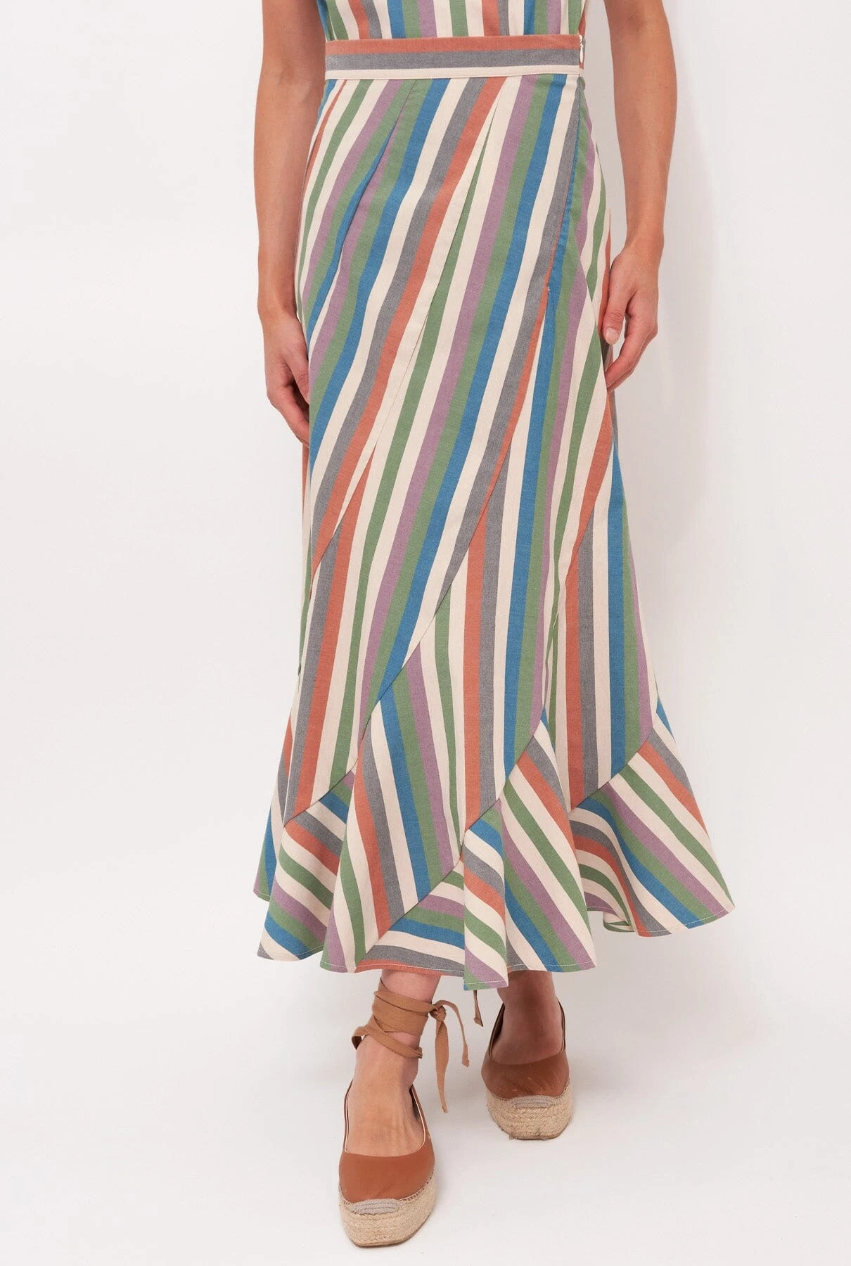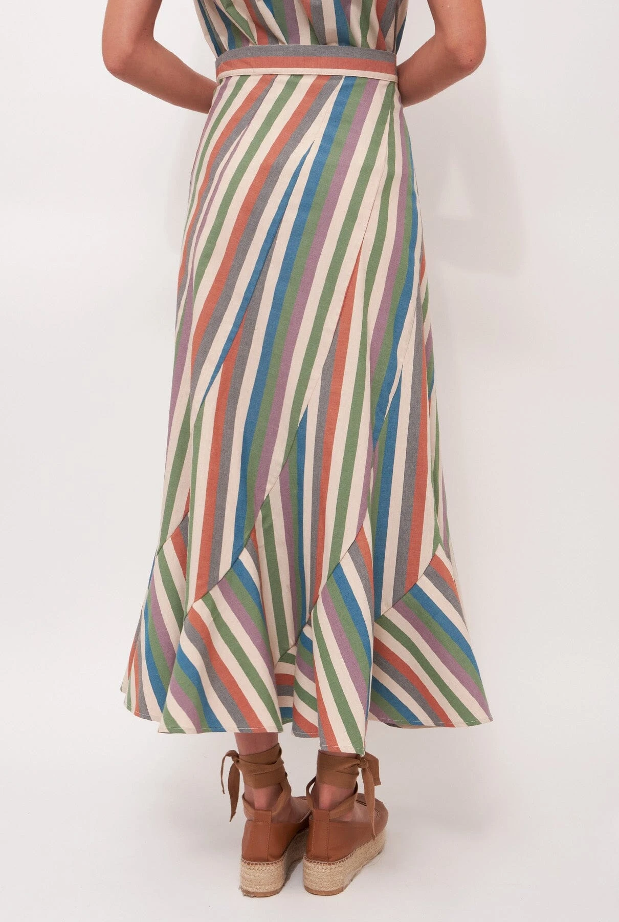 Midi skirt in multicoloured striped fabric. Cut and flowing, this skirt is suitable for all silhouettes.