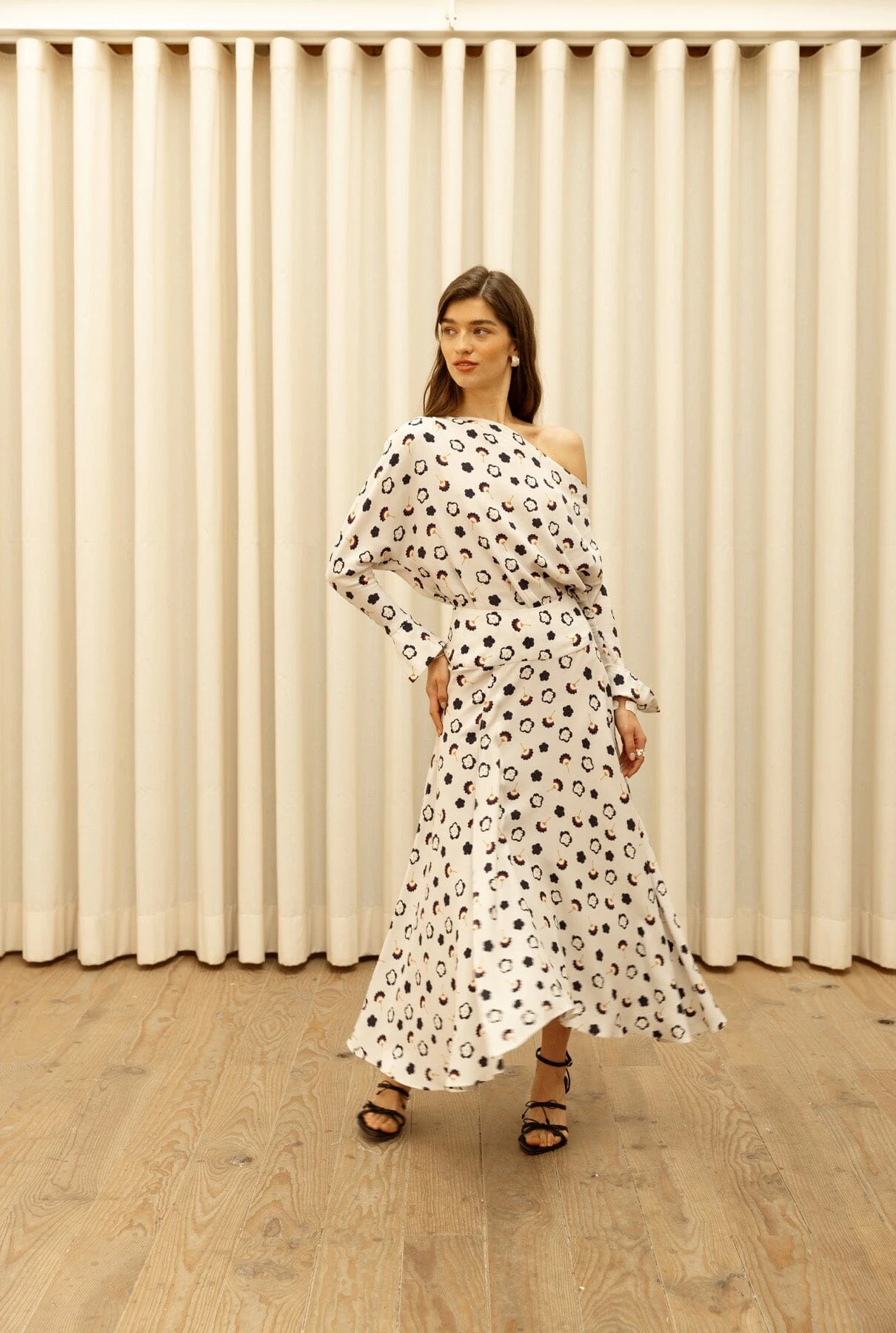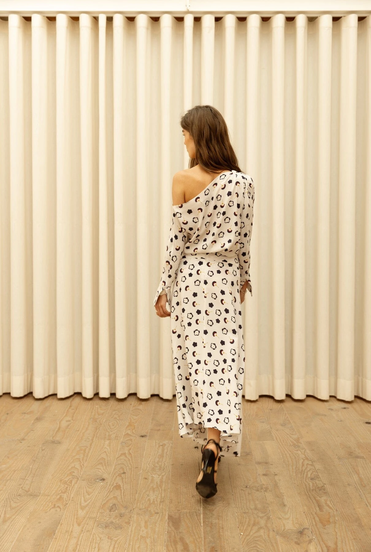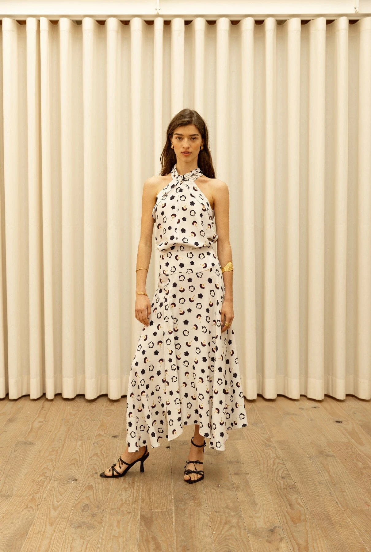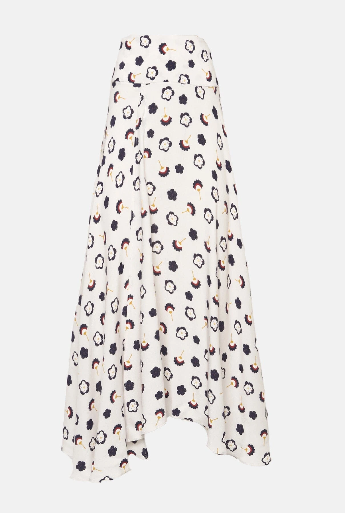 Midi layered skirt with lots of flounce. It has a slit on the right leg and a wide shaped yoke that sits at the waist and flatters the silhouette.
