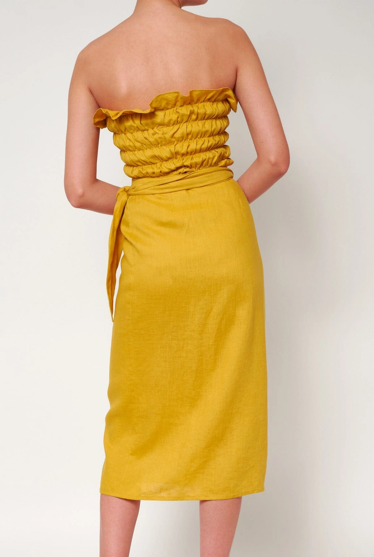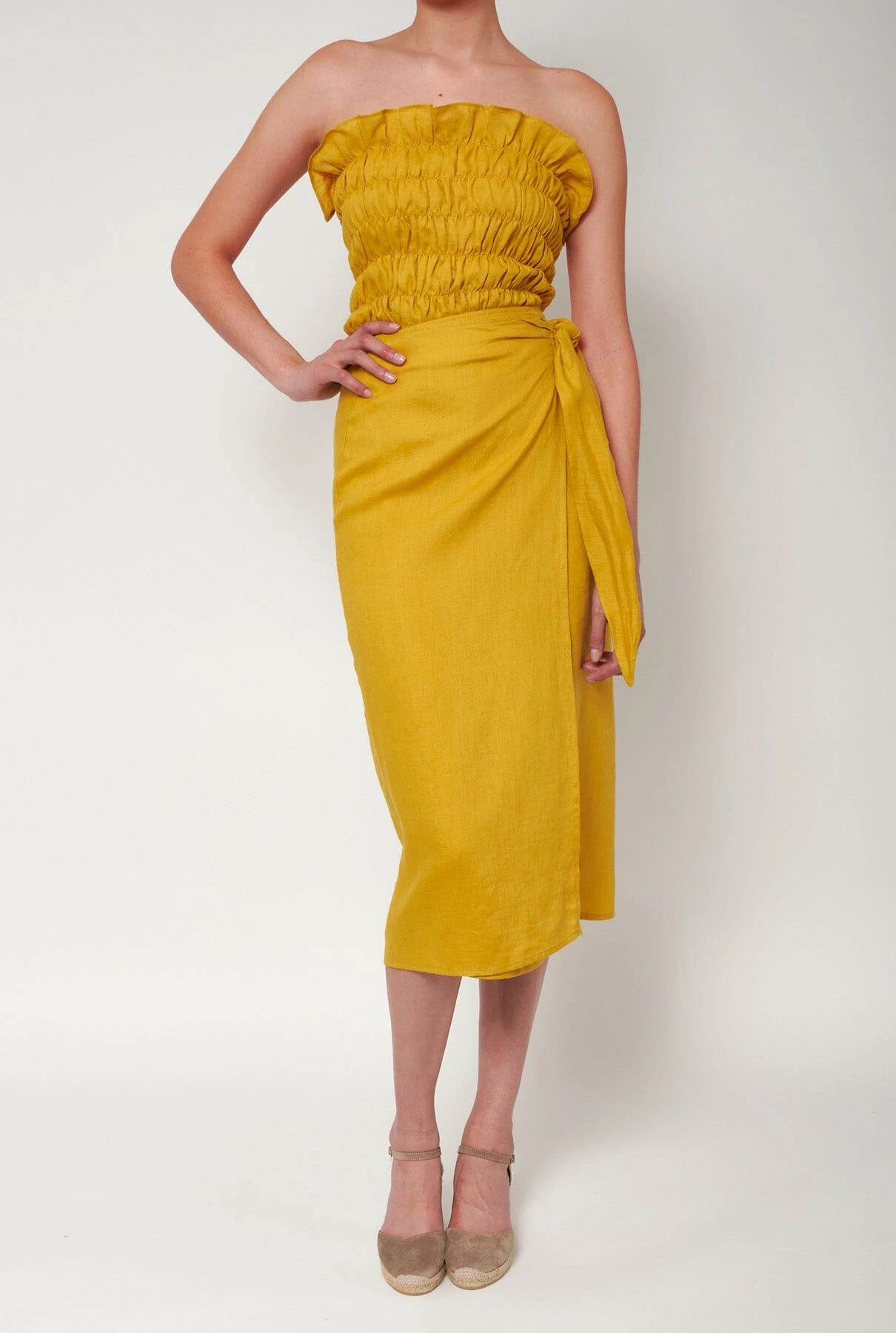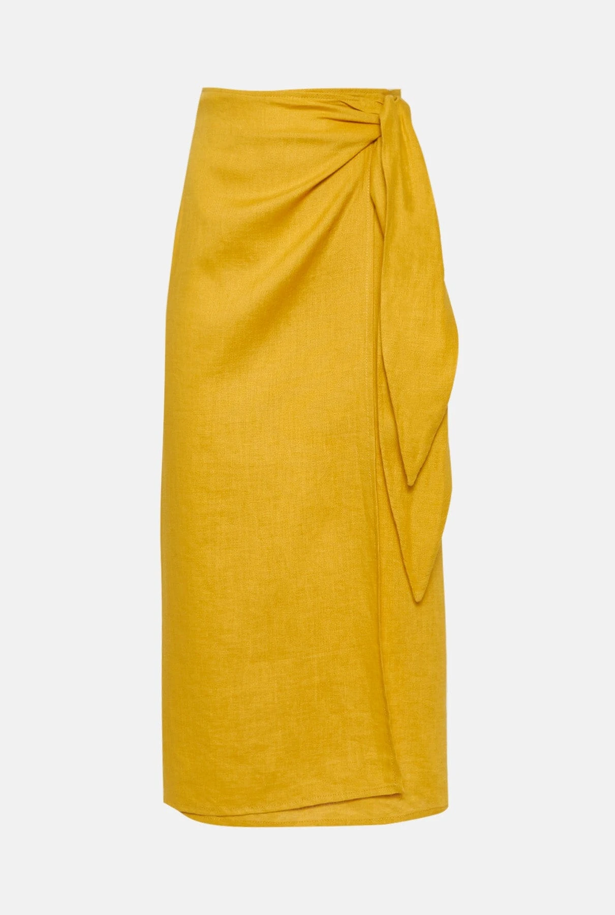 Pareo style midi skirt in linen. It closes with a bow. Wash by hand, iron low temperature, do not tumble dry, do not use bleach. Designed by Alava Brand