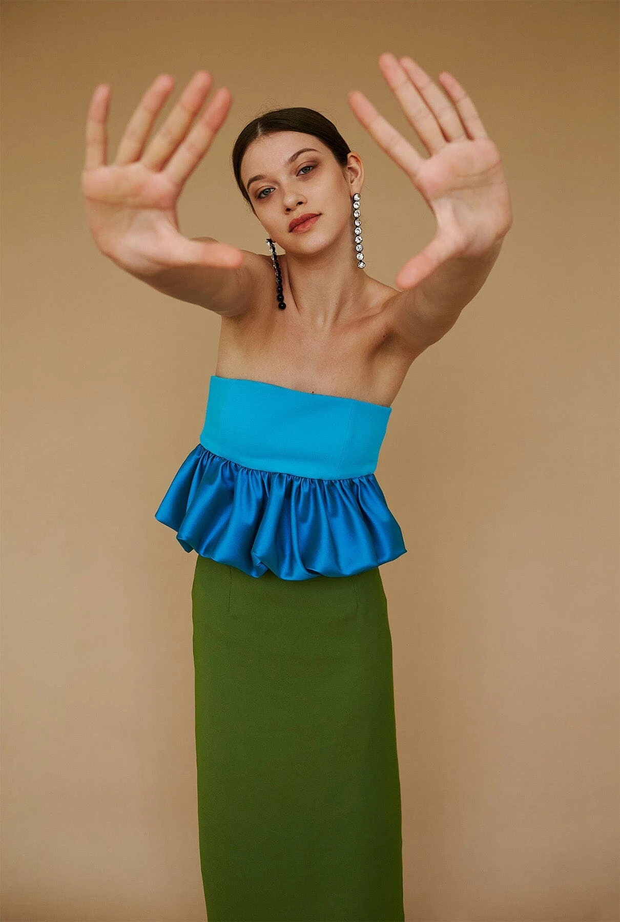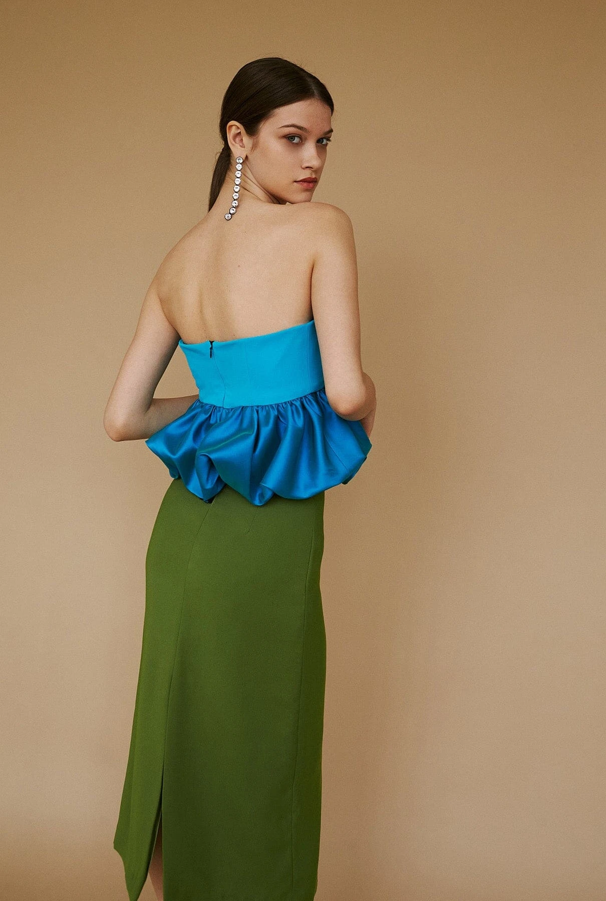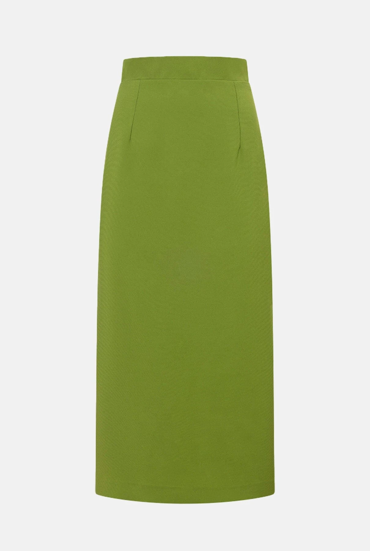 Green crepe pencil skirt, back opening. Combinable with the blue ruffle top.