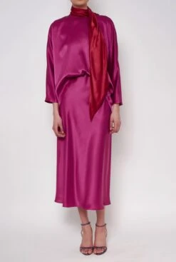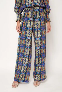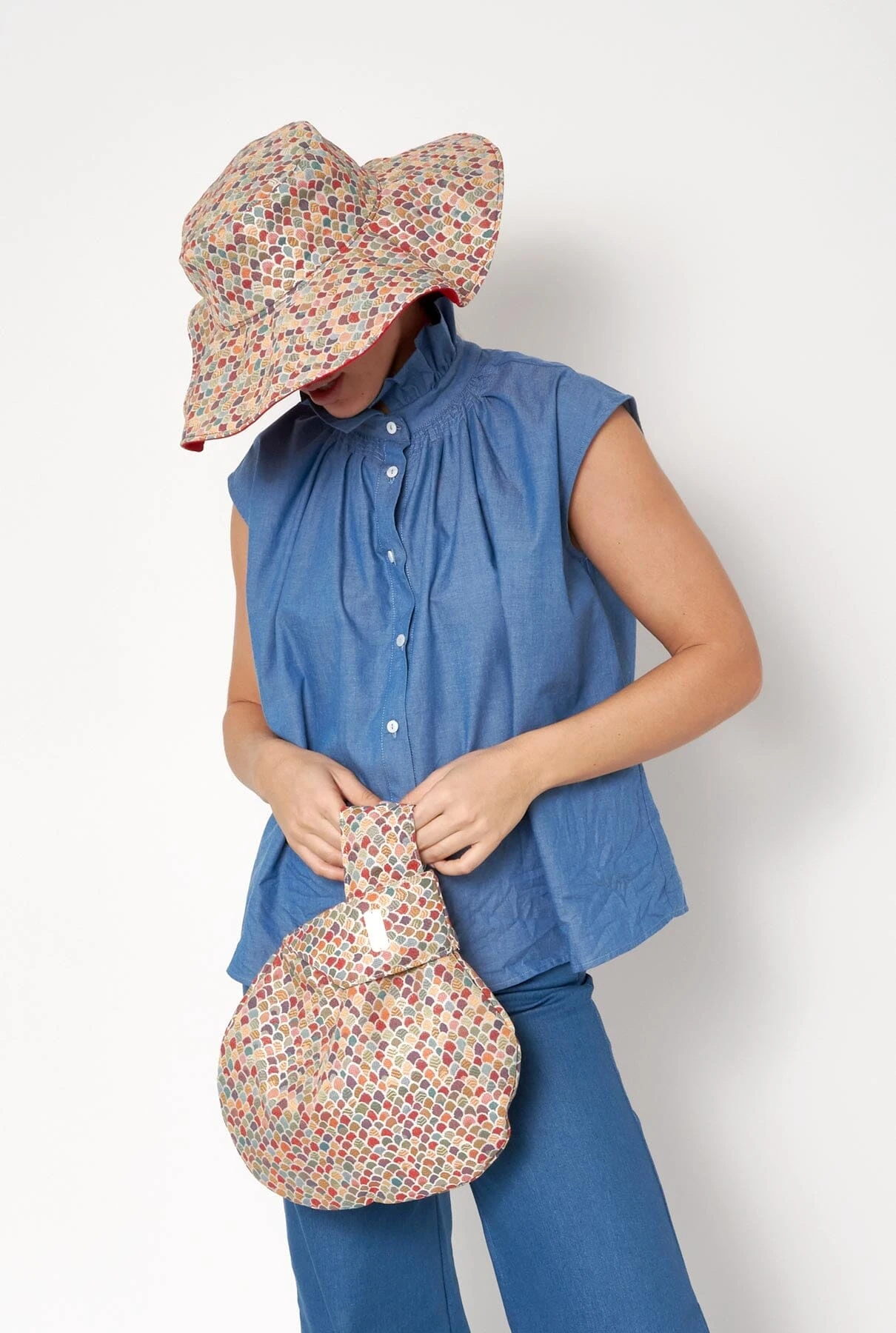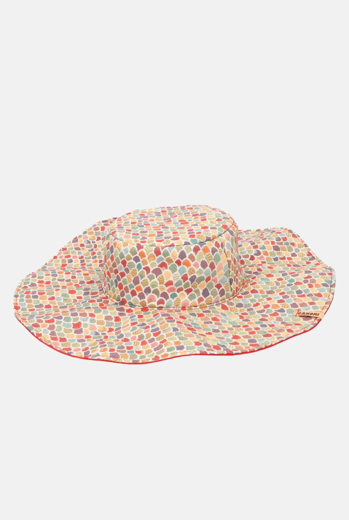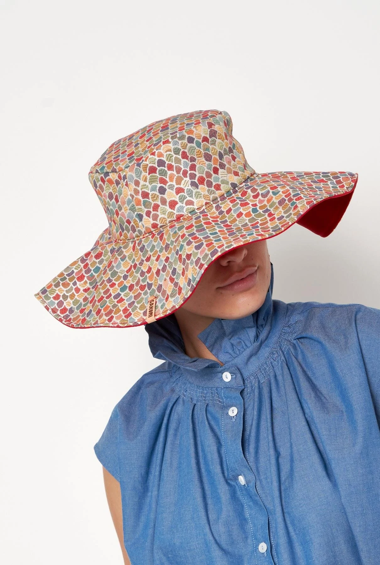 The reversible flake pamela has one part with flake pattern in multicolour tones and the underneath part has a red tone