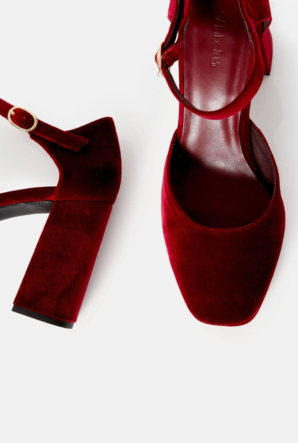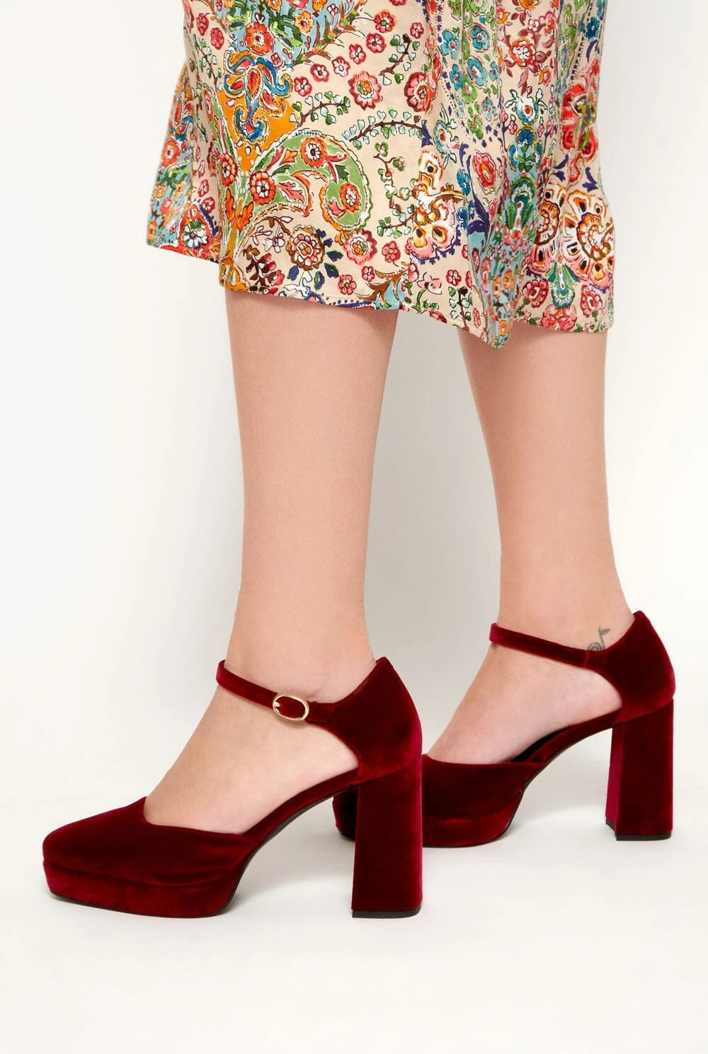 Red velvet heel with ankle strap and buckle fastening. Heel 9 cm high and platform 2 cm wide, a combination that makes them much more comfortable. Breathable fabric lining and leather insole. The outside of the shoe is velvet.