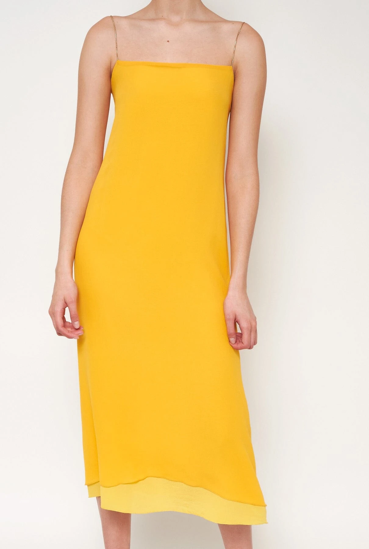 Reversible dress with thin elastic straps. Silk crepe naturally dyed with Gardenia.