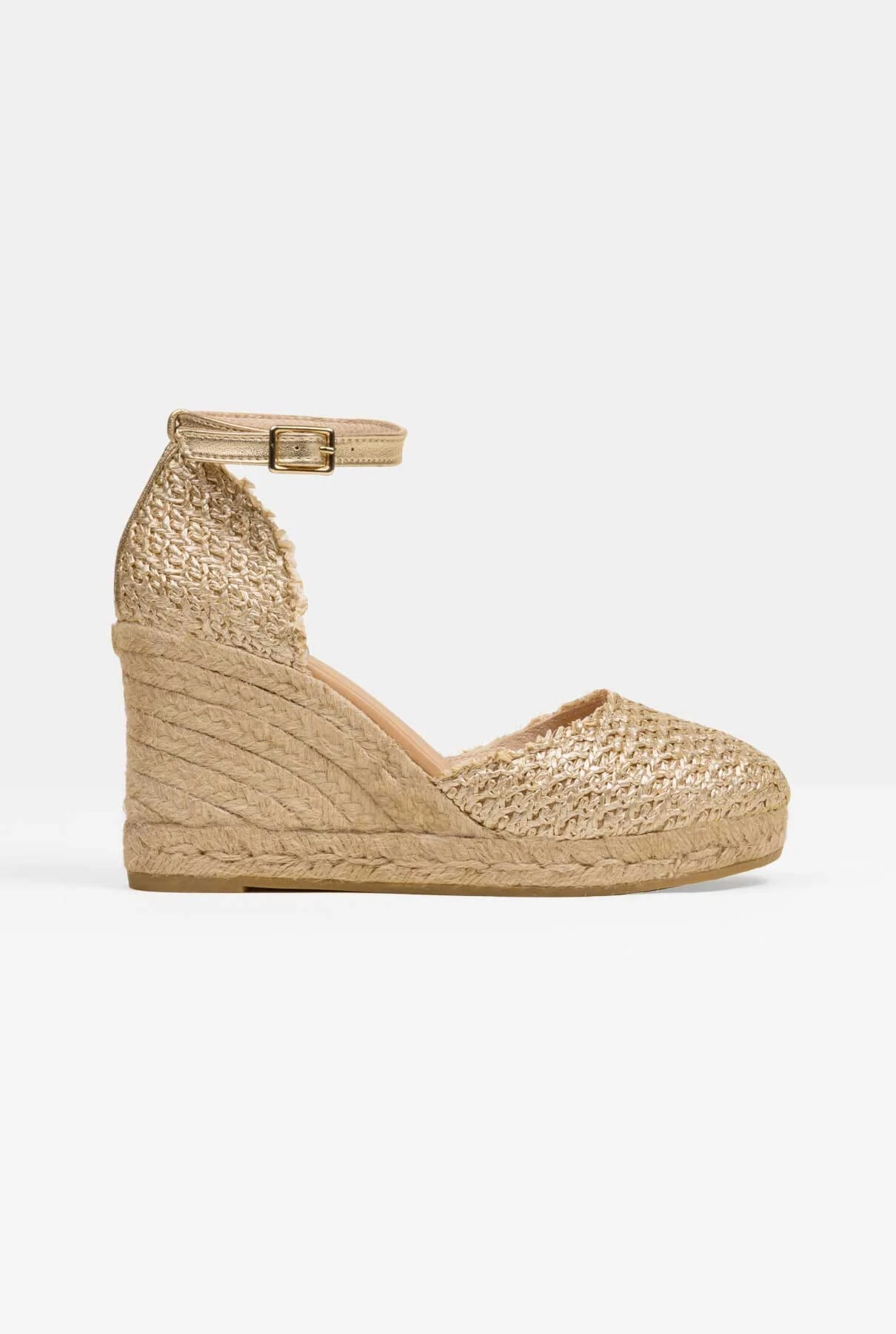 Gaimo women’s espadrille in raffia. Cile style with closed upper and heel with strap and side-buckle closure. Leather cushioned insole and lining with 9cm organic jute wedge and 1.7cm platform. Designed and produced using traditional methods in Spain, this is a timeless and very comfortable design that’s ideal to combine with any of your summer looks.